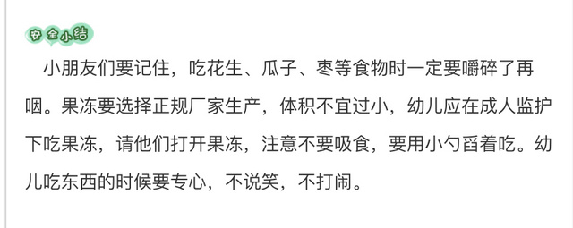 果冻、花生、瓜子、枣等都是孩子喜欢吃的零食,但由于这些食物颗粒小,如果孩子食用方法不当,或在食用过程中嬉戏打闹,食物很容易进入气管,严重时会造成窒息,危及孩子生命,所以今天我们通过视频故事带孩子们一起学习了吃东西时需要注意的几种情况……