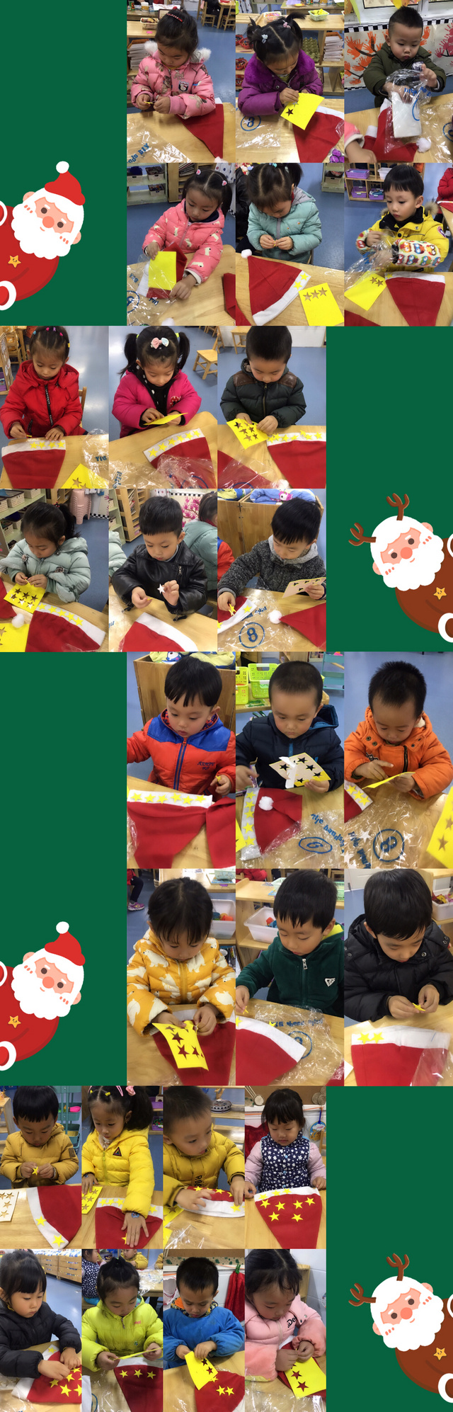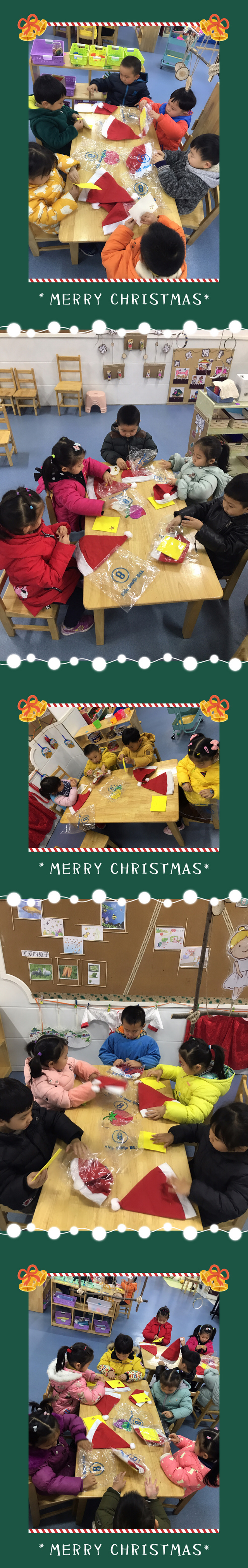 今天我们带孩子们一起制作了圣诞帽,为了让孩子们感受圣诞节的快乐,随后我们又带孩子们去参观了中班的哥哥姐姐们的班级,与哥哥姐姐一起欣赏圣诞树以及圣诞装饰品的美,同时也体验跟哥哥姐姐们一起欣赏圣诞树等物品的快乐!