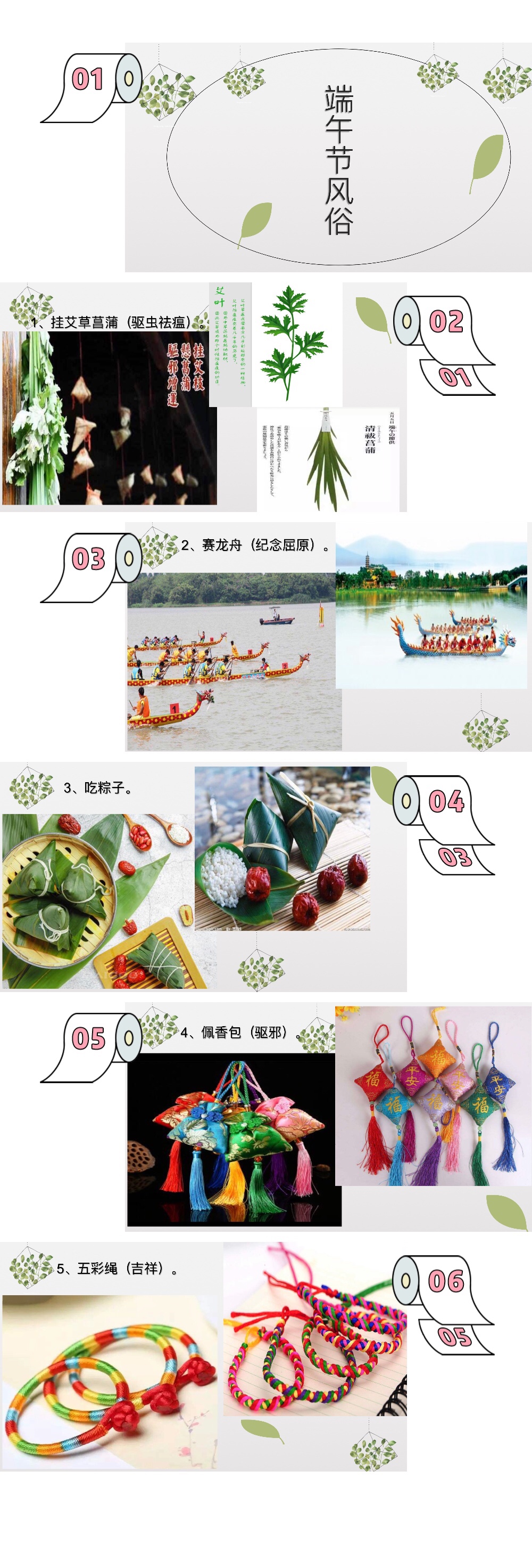 即将快端午节了,今天带孩子们学习了端午节的习俗,其中有挂艾草菖蒲、赛龙舟、吃粽子、佩香包、系五彩绳等……最后我们还玩了赛龙舟游戏,孩子们可开心了!