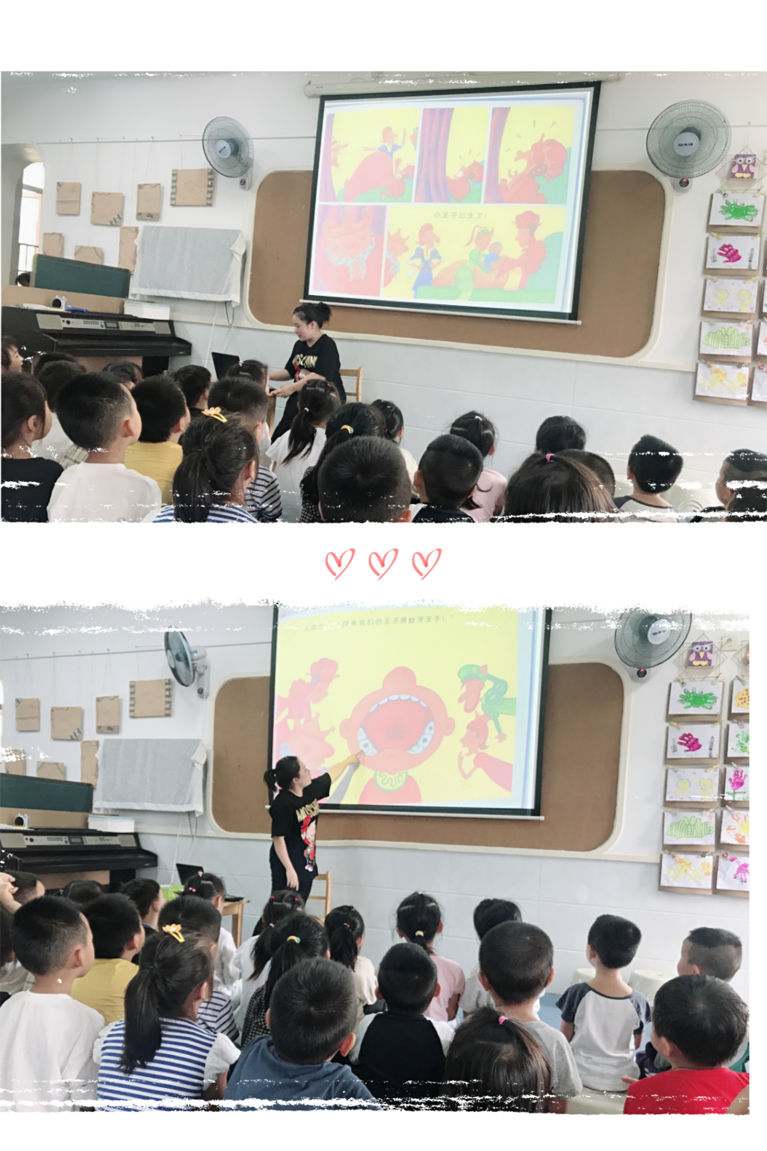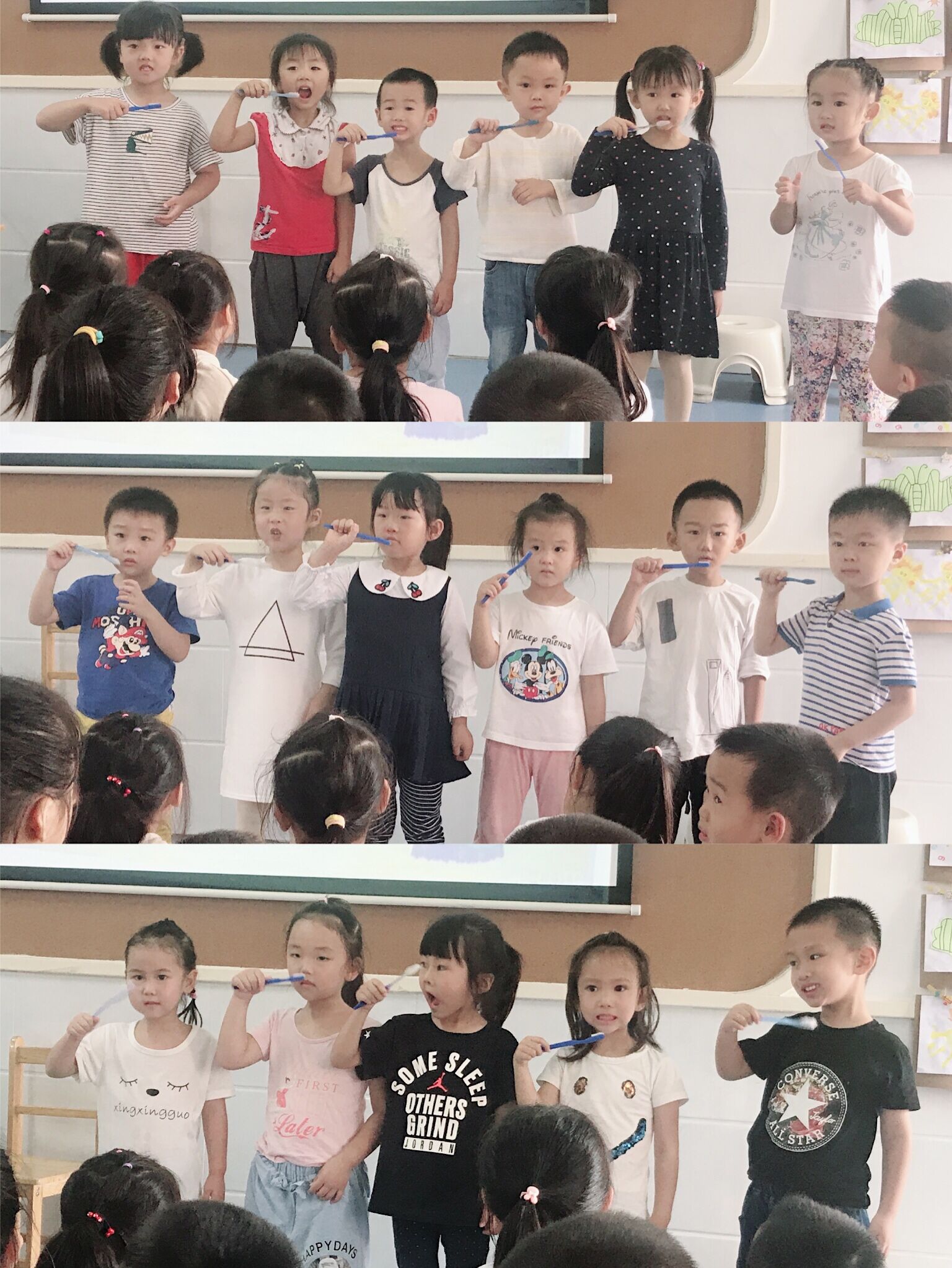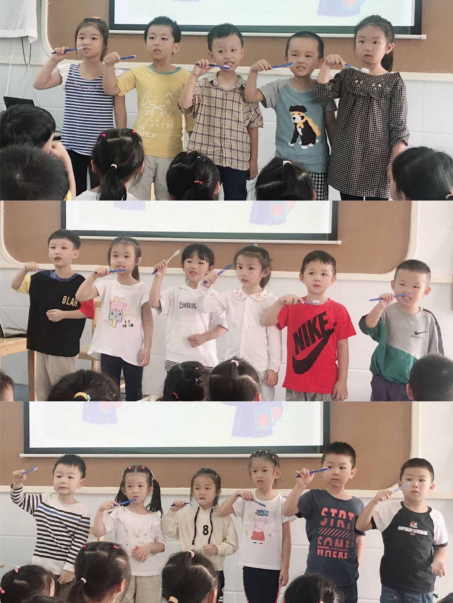 今天我们学习了健康活动《蛀牙王子》,通过此活动让幼儿知道刷牙的重要性,学习正确刷牙的方法,建立保护牙齿的意识,在以《蛀牙王子》故事导入时,孩子们都知道小王子是糖果吃得太多、不经常刷牙才导致长了很多蛀牙,通过医生的出现,引导幼儿了解刷牙的方法:牙齿前面刷一刷,上面刷完下面刷,牙齿后面刷一刷,外面刷完里面刷,门牙前后刷刷,后面牙齿刷刷,刷完牙后漱口水,牙齿洁白又健康。小王子在医生的嘱咐下,坚持正确的刷牙,终于他的牙齿变得洁白又健康。最后孩子们也分组尝试了一下刷牙的步骤,在过程中理解了刷牙的方法,从而体会到牙齿健康的重要性。
