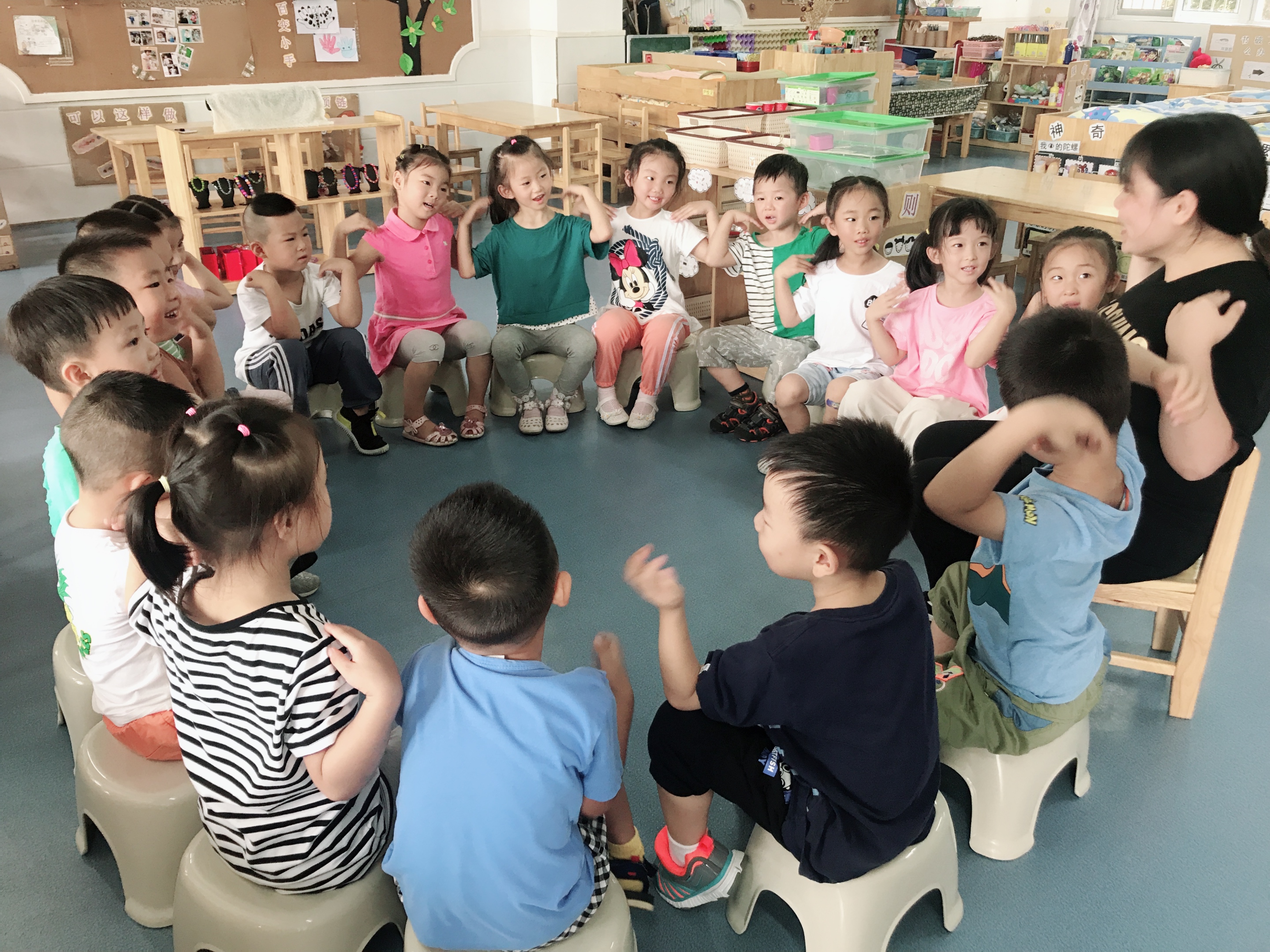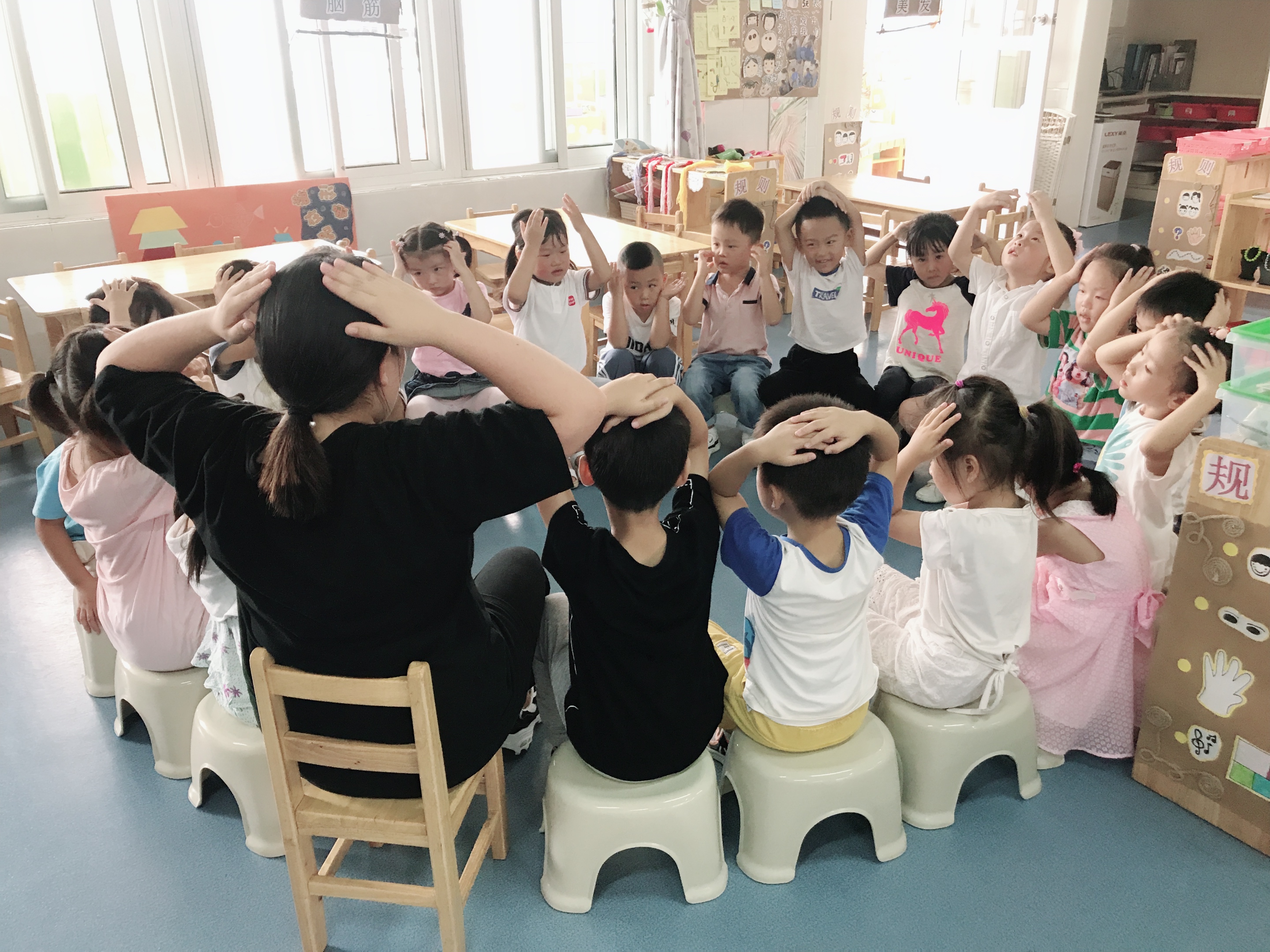 今天我们学习了音乐韵律活动《头发肩膀膝盖脚》,这首歌曲歌词简单多重复,歌词内容直接描述动作过程,具有直观、形象性。为更好地在教学中发挥幼儿参与活动的积极性、主动性,让教学活动变得生动活泼和富有情趣,我尝试引导幼儿从最感兴趣的动作开始,引导幼儿在愉悦的氛围中感知身体的部位,感受歌曲欢快、活泼的旋律,在理解和感受到节奏后,我们又加了一个创编的环节,孩子们都想到很多部位:手、肚子、胳膊、腿等,在创编的过程中感受到音乐的趣味性,整个活动孩子们都是积极的、开心的!