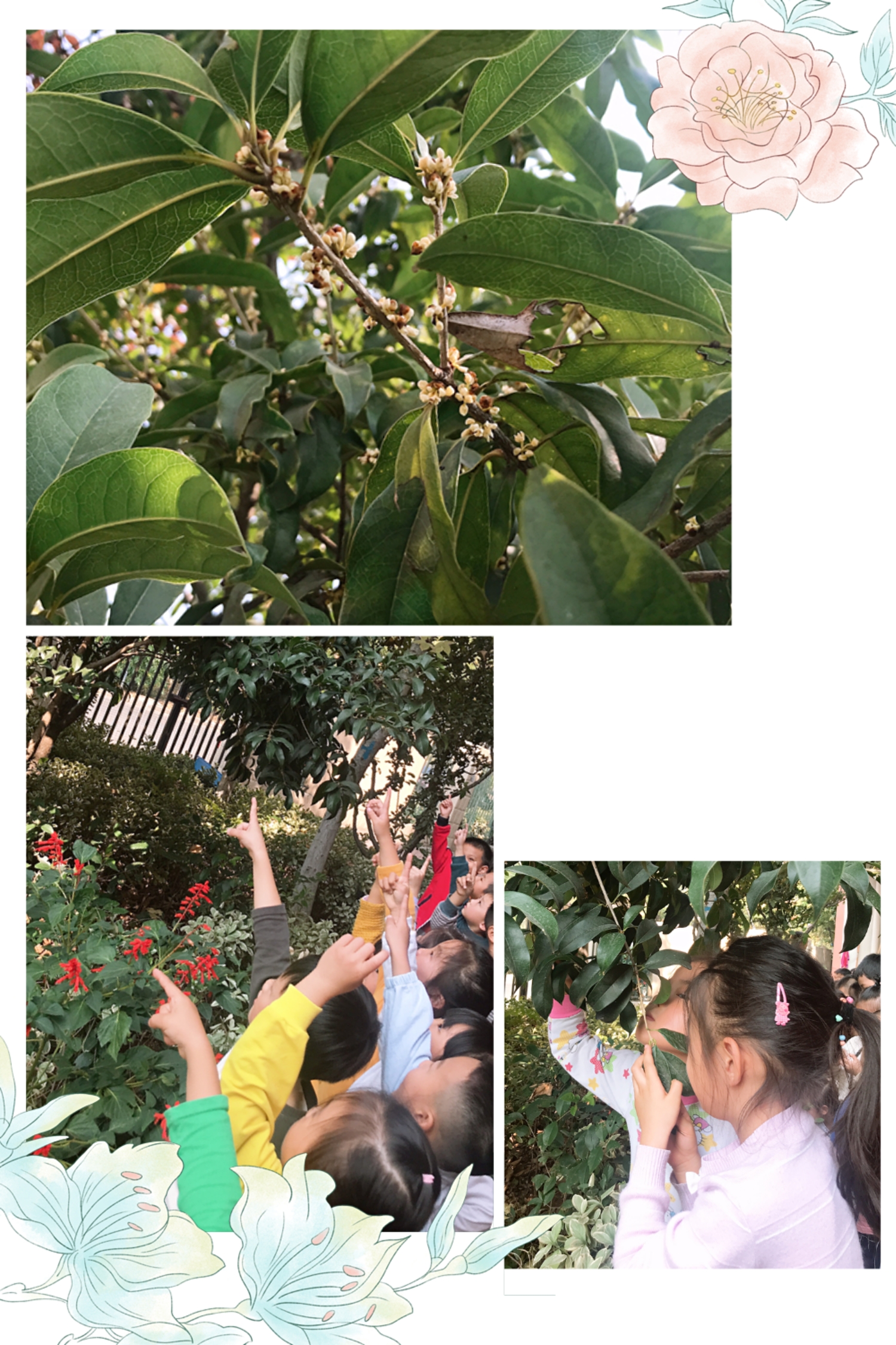 又是一年金桂飘香的季节,幼儿园里的桂花树繁花满枝,清香四溢,小朋友们和老师一起去欣赏,我们开展了一次“寻香之旅”,与桂花来了一次亲密接触,感受秋意的香甜。