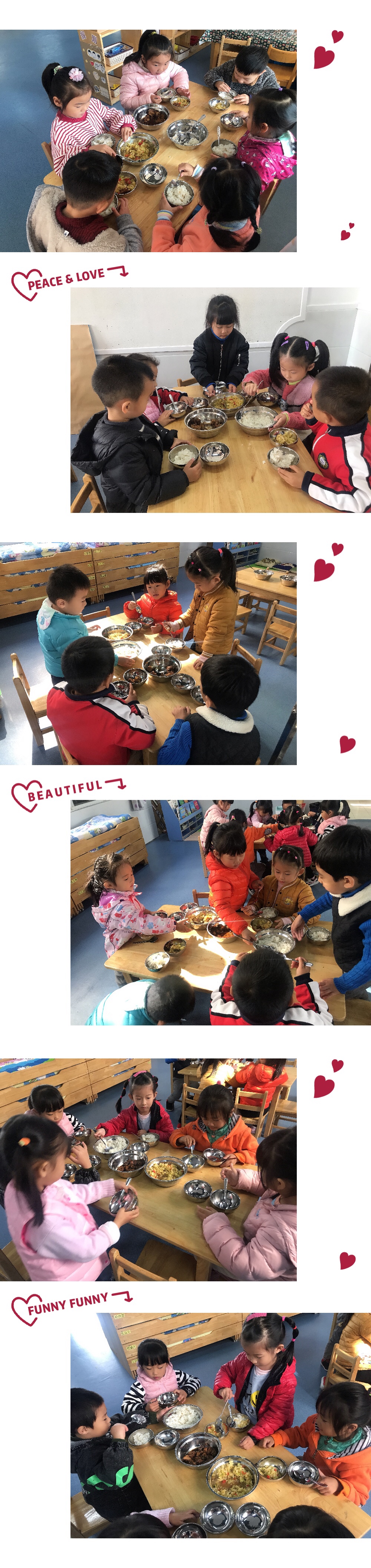 《指南》中也曾提到:从小培养幼儿的独立生活自理能力是完整人格的重要组成部分,为了培养幼儿的自理能力,就要让幼儿自己动手做自己的事情。老师真正把学习的自主权、自由权还给幼儿,使每个幼儿自己去主动参与、主动体验、主动创造,才能真正发展幼儿的自主自助能力,就这样我们进行了自主自助,快乐用餐。