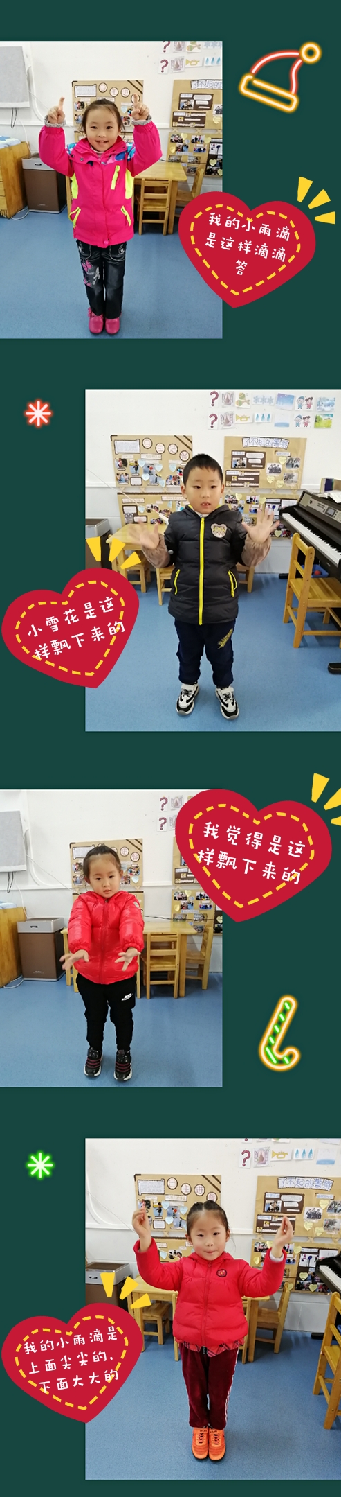《雪花和雨滴》是一首抒情优美的歌曲,告诉小朋友们雪花轻轻从天空中飘下来,是冬天来到了。雨滴从天空中落下来,是春天来到了,歌曲内容简单,为了更好地帮助幼儿理解、体验和记忆,我根据歌词内容绘制了形象的图谱,在活动中以生动的表情、优美的动作将自己对音乐的感受表露出来,会带动并感染幼儿,使其产生强烈的内驱力,引起幼儿的情感共鸣,从而使幼儿更好地把握歌曲所表现的意境,通过多种形式让幼儿感受作品并创编自己喜欢的动作。