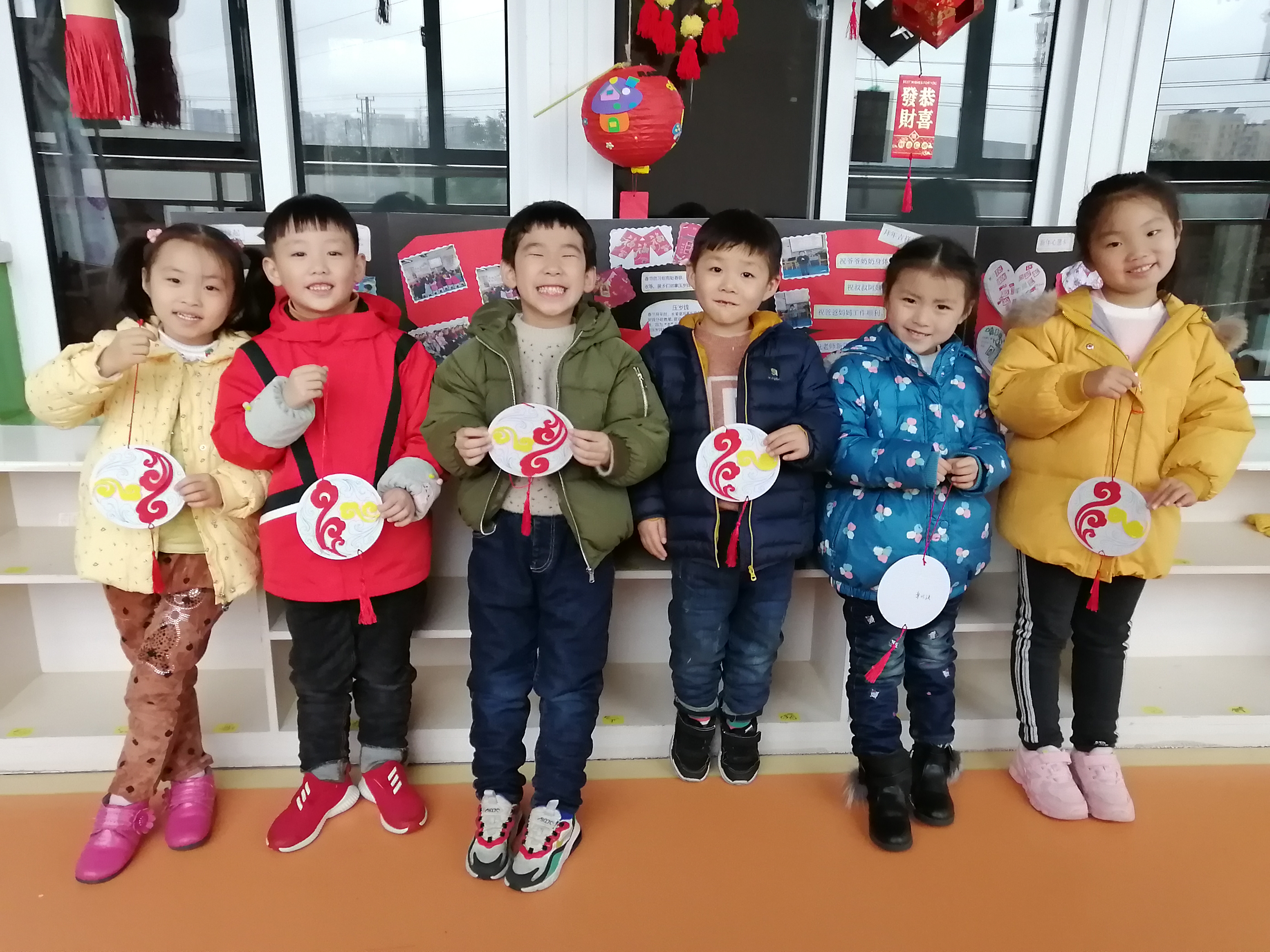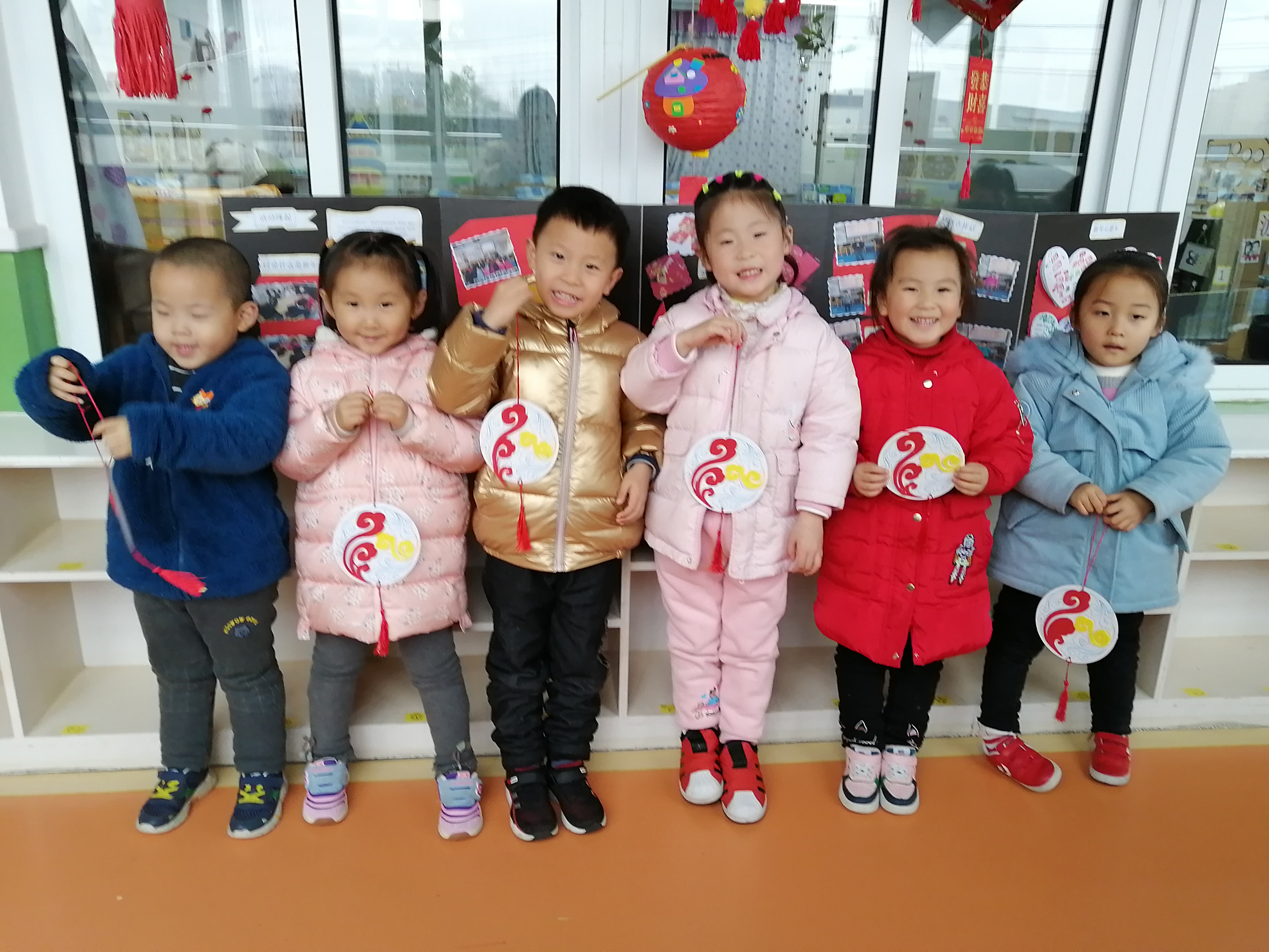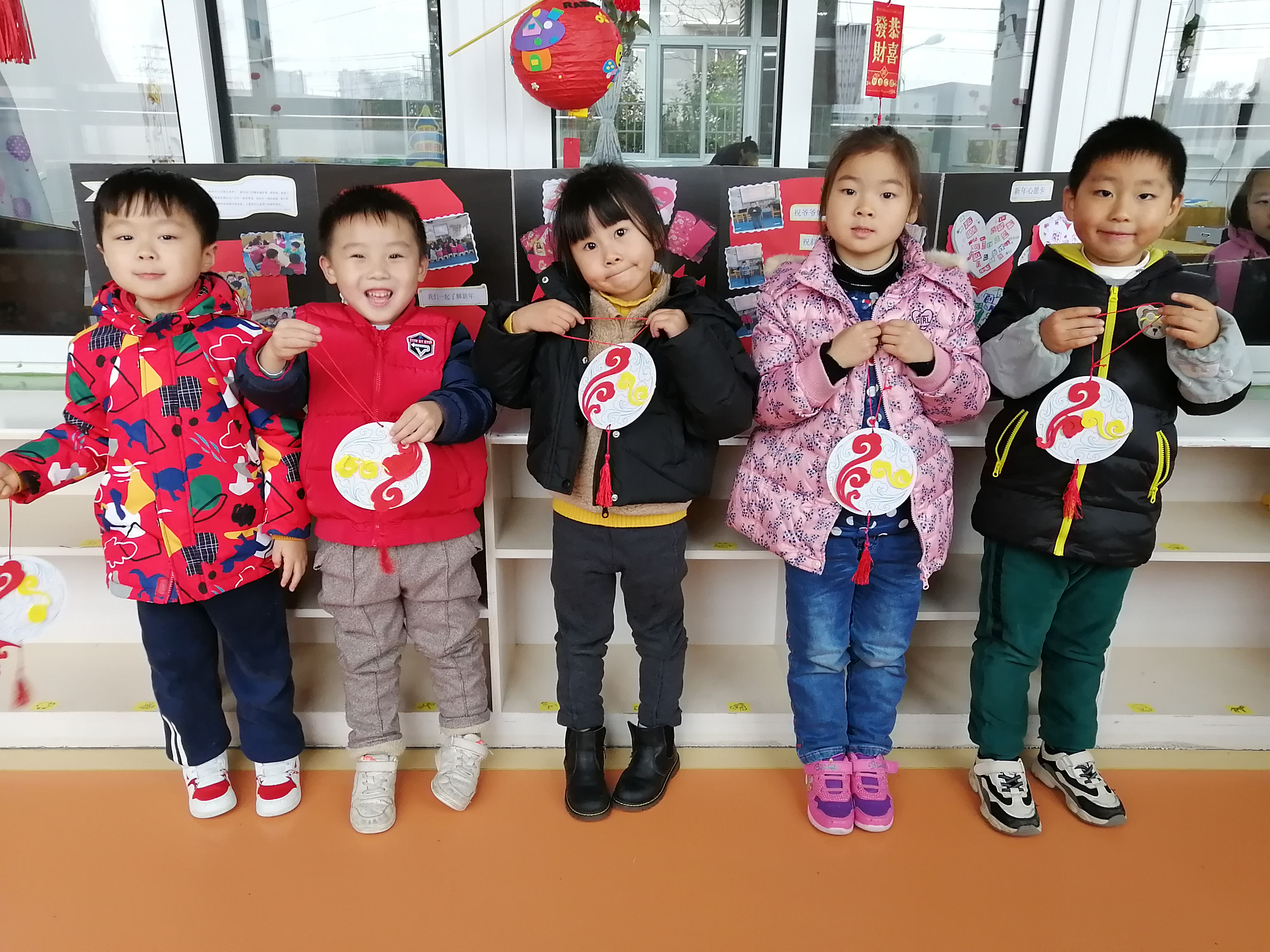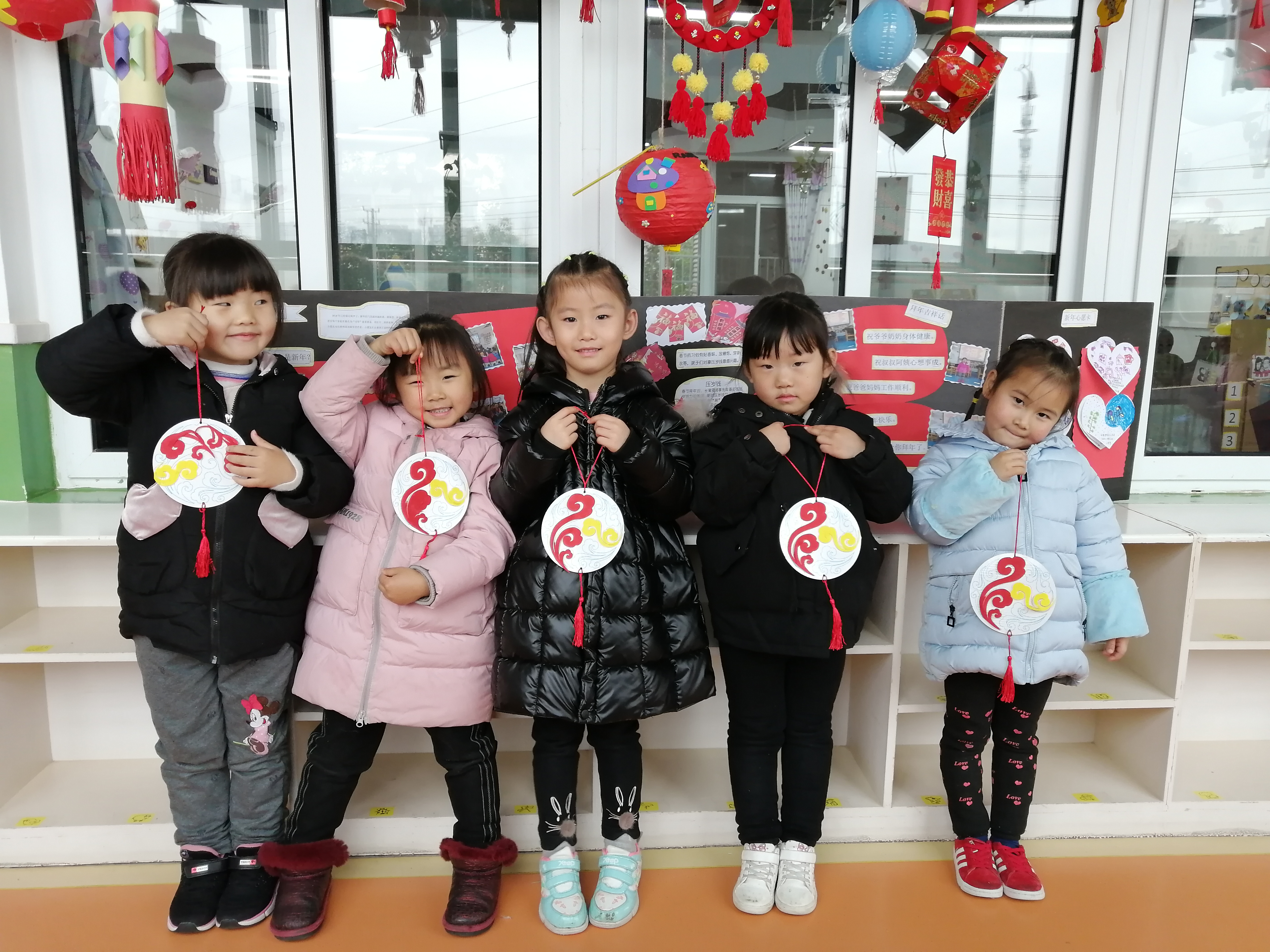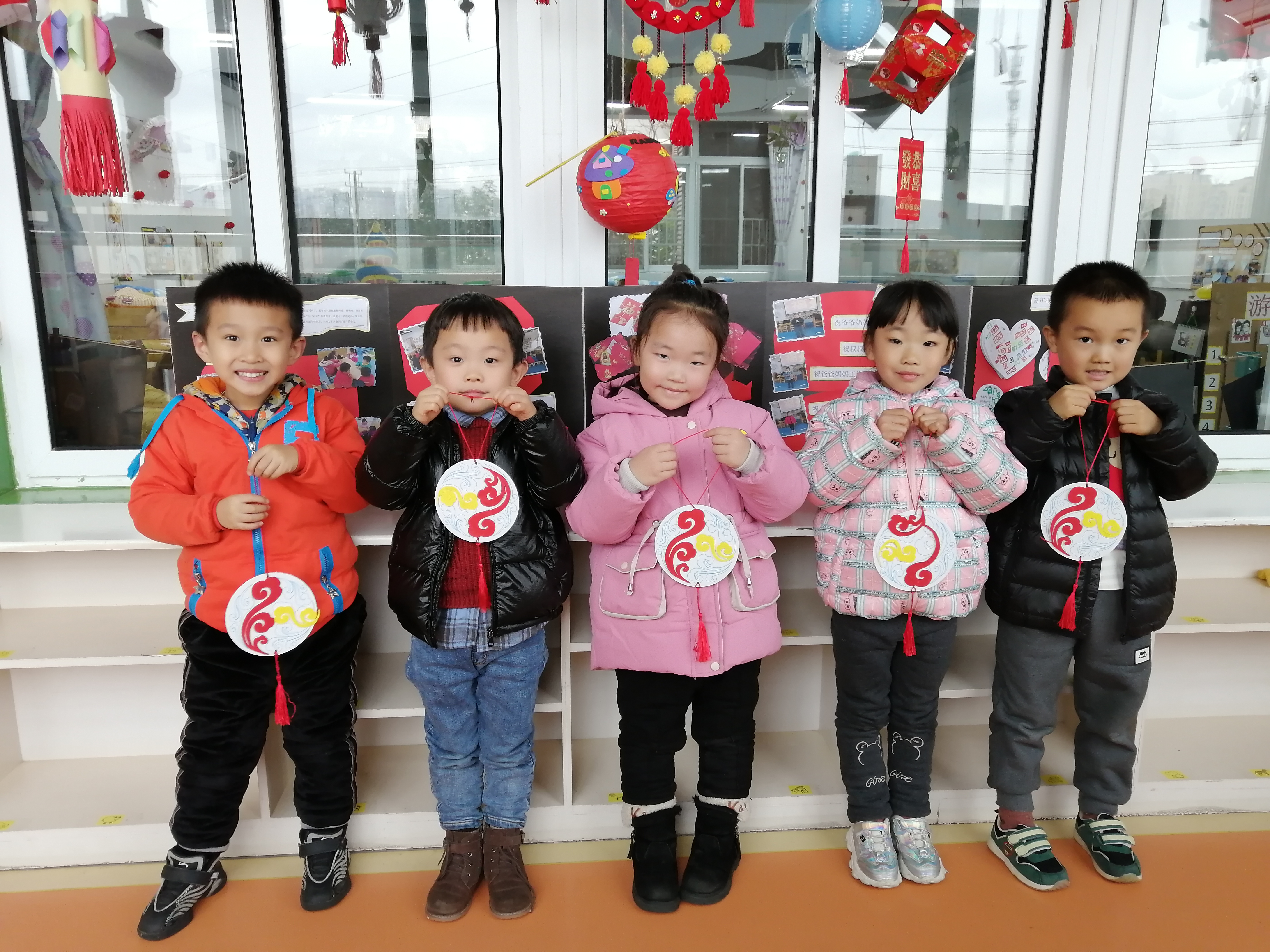 美工活动需要幼儿手、眼、脑并用,对幼儿视觉、动觉、触觉和大脑的发展有重要作用。可以促进大脑对手肌肉群的控制,使幼儿手部小肌肉逐步发育成熟,手的动作的灵活性和精巧度得到提高。同时,手的锻炼和动手能力的提高也可以促进大脑的成熟,从而有助于幼儿手、眼、脑的逐步协调发展,结合新年这浓浓的节日氛围,我们制作了祥云挂饰,本次美工活动中涉及撕、贴、连接、穿孔、打结等基本技能和使用双面胶等工具的基本方法,这些也是日常生活中所需的简单而基本的技能。通过美工活动,幼儿便可以在愉快而专注的操作过程中不知不觉地掌握这些基本技能和方法,孩子们在展示作品时都露出了开心的笑脸。