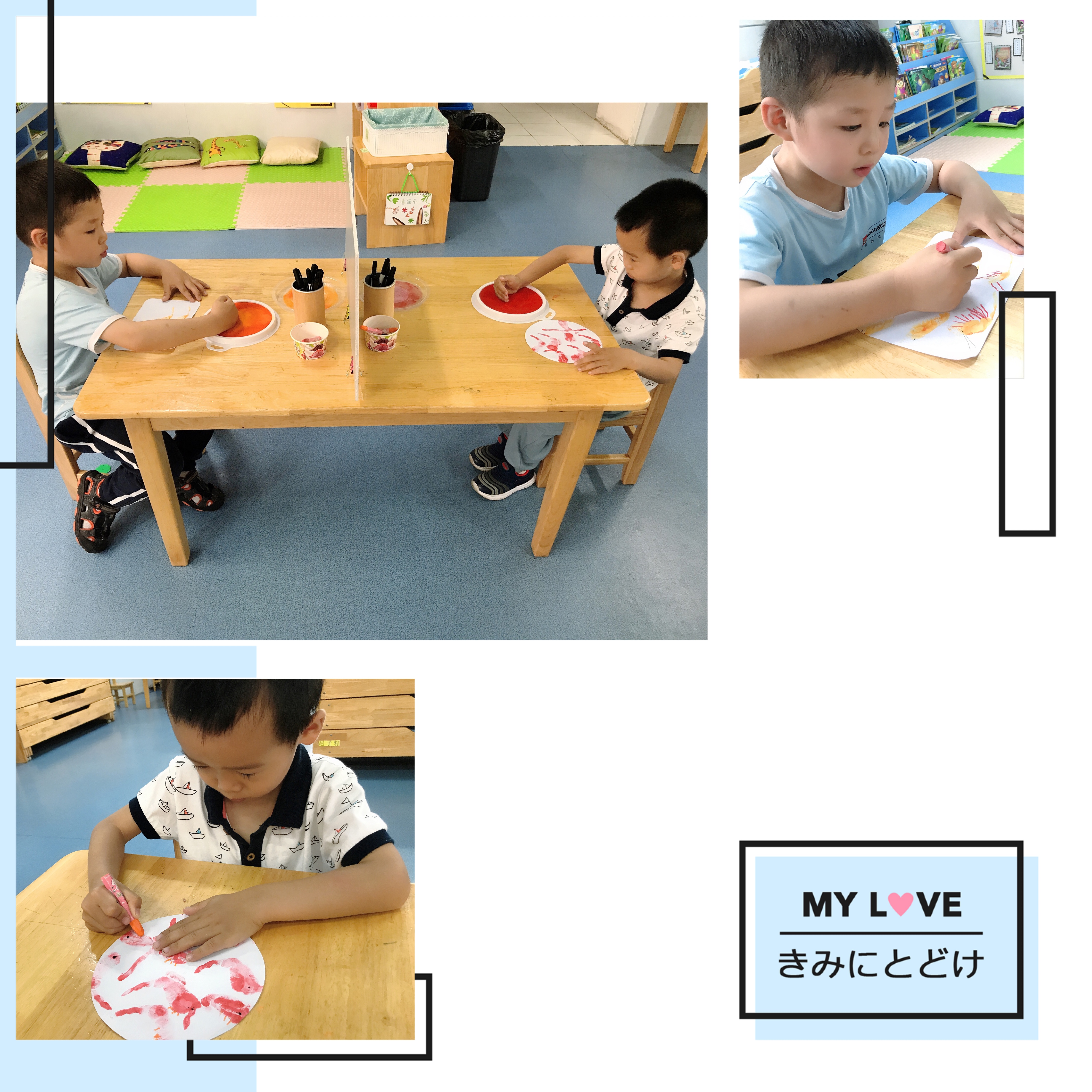 虾对于孩子们来说并不陌生,孩子们喜欢吃,同时对虾也有很多的好奇,带着这份好奇我们开展了这节美术活动《虾宴》。活动中带孩子们观察虾的外形特征,感受和欣赏虾独特的形态美之后,幼儿尝试运用手掌侧面形态的变化大胆创作,表现虾的不同形态并画细节特征,孩子们对创作不同造型的虾非常感兴趣,因此在活动中也体验了与同伴一起作画的乐趣!