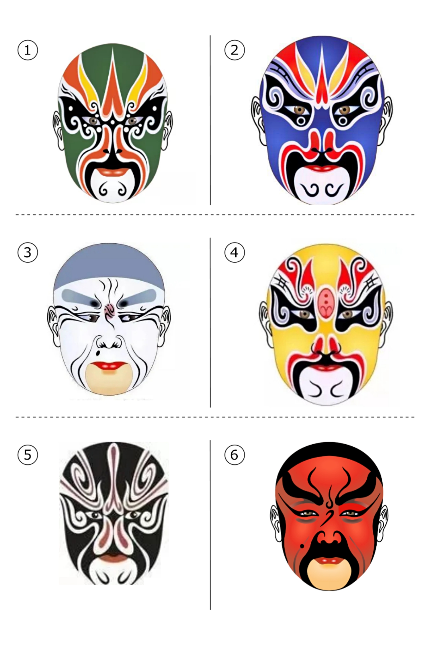 白脸:分水白脸和油白脸。水白脸表示阴险奸诈、善用心计,如曹操、赵高等;油白脸多为刚愎自用的狂妄武夫,如高登、马谡等。