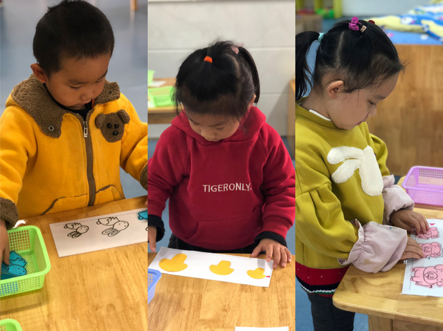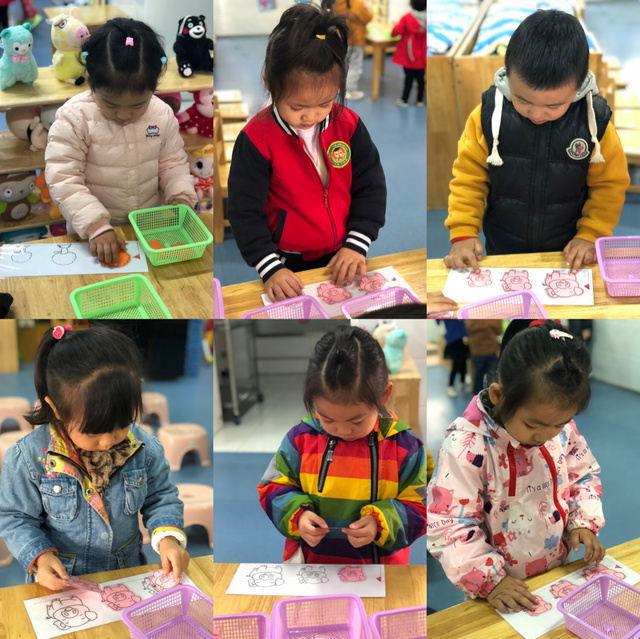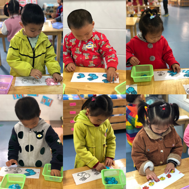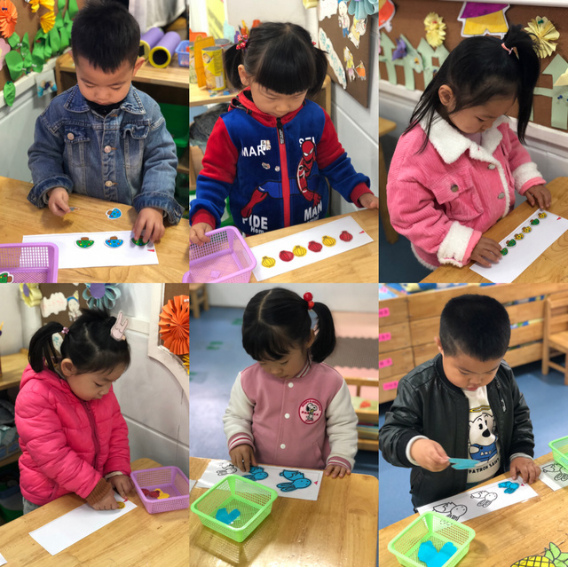 “按颜色分类”、“送玩具回家”,按标记进行归类,知道把相同的实物玩具放在一起。