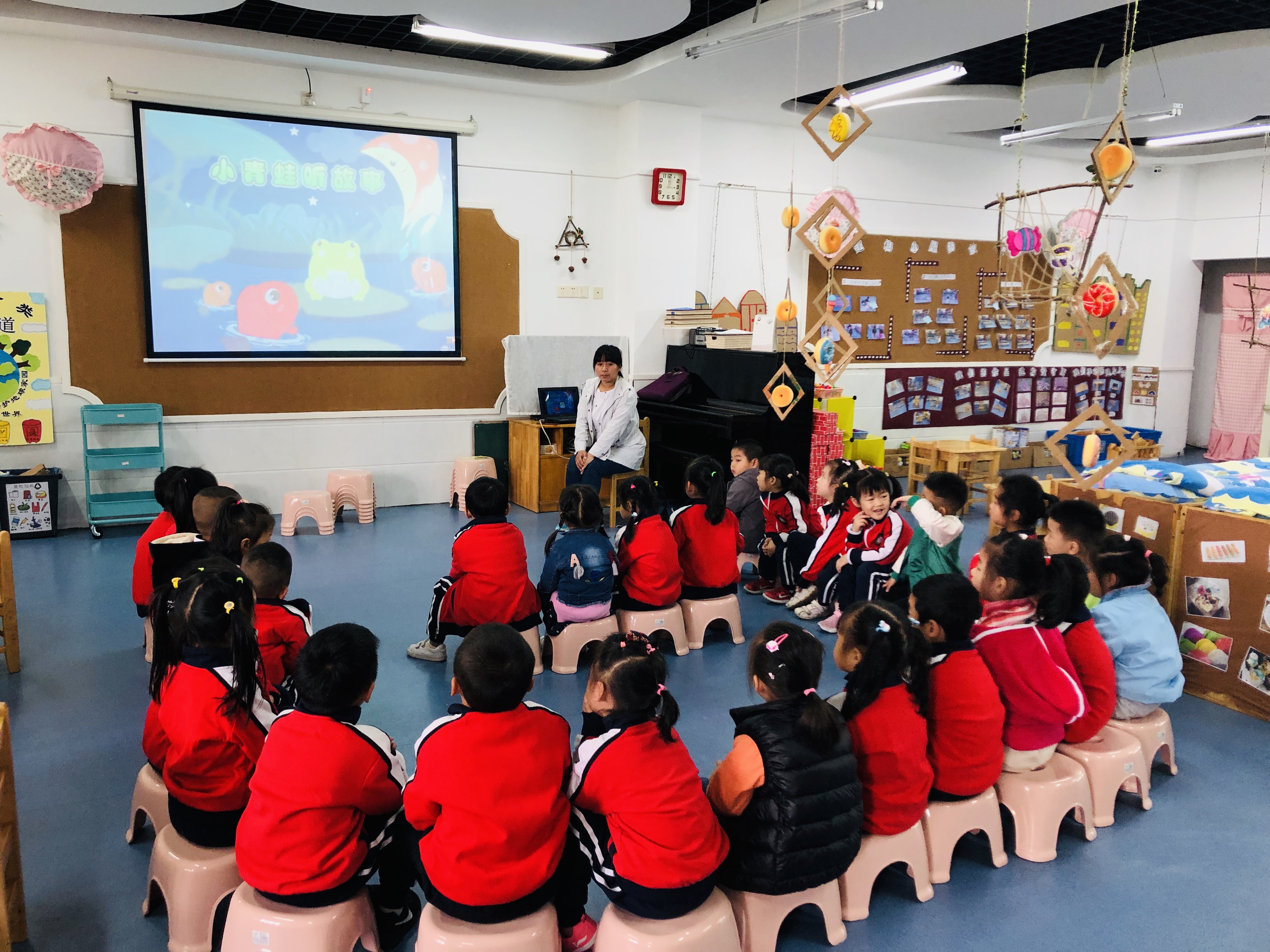《小青蛙听故事》这个语言活动选用了小朋友生活中比较熟悉并喜欢的小青蛙和鱼儿、月亮为角色,讲述了一个小青蛙听故事时不安静、乱插嘴的故事,特别是小青蛙认真听故事的这个情节既让人觉得有趣又很符合小班小朋友的年龄特点。《指南》中语言领域的目标:“要创造自由、宽松的语言交往环境。”“幼儿要注意倾听同伴讲话,并能大胆、清楚地说出自己的想法和感受。”等。