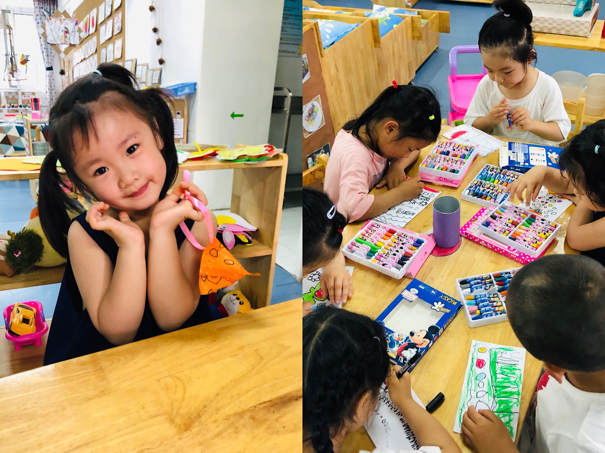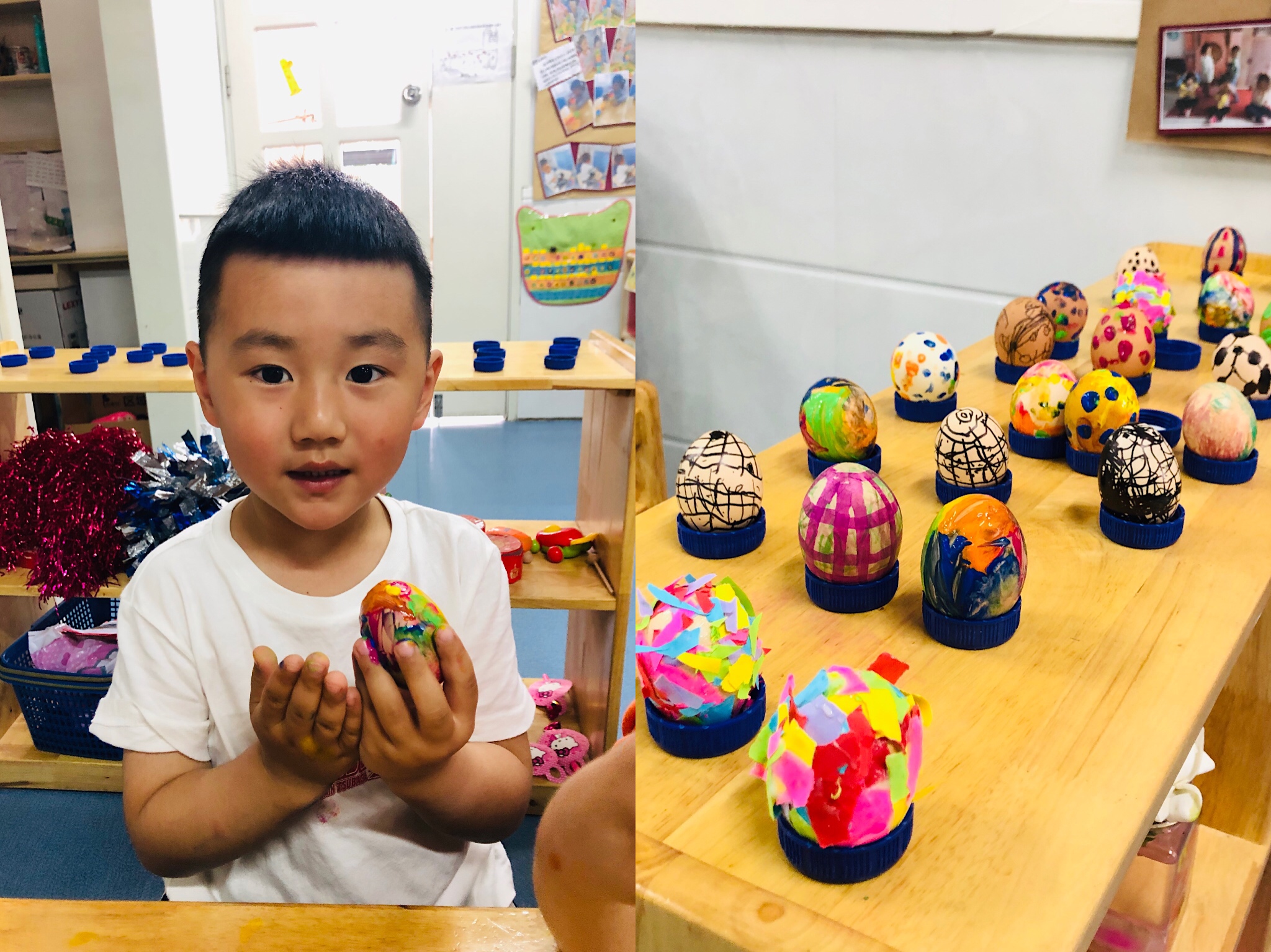 我们还在班级开展了装饰五彩蛋的活动,孩子们用碎纸片粘贴,水彩笔装饰,颜料装饰,勾线笔装饰,四种方法来装饰。