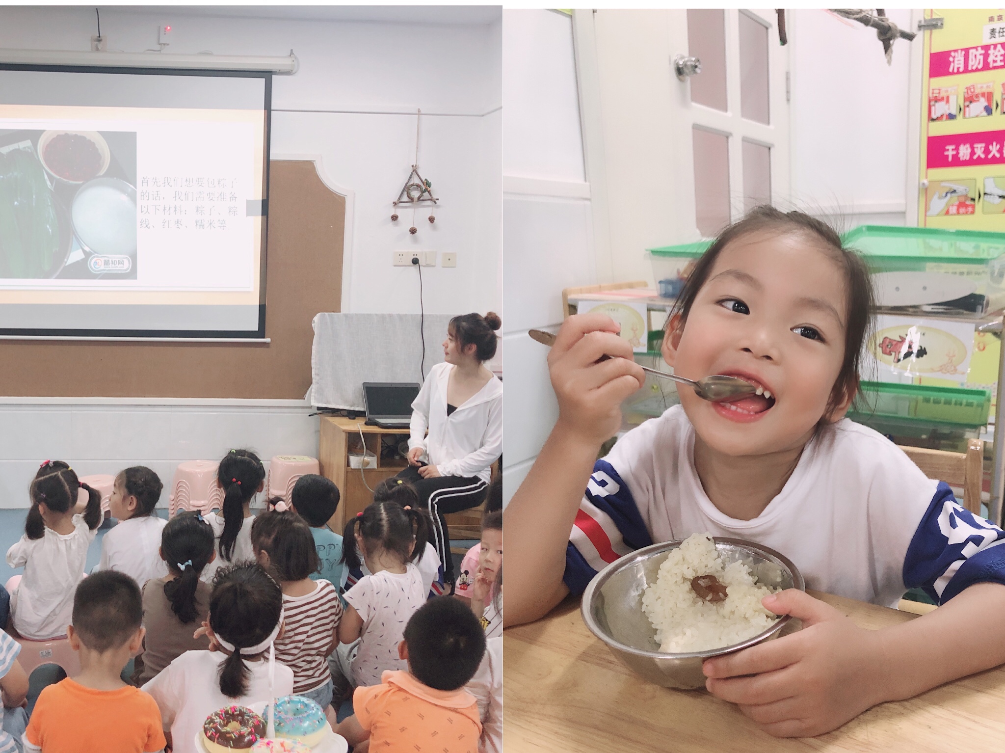 端午节粽子是肯定要品尝的啦,吃粽子前樊老师对我们介绍了粽子是怎么包的,粽子有哪些口味的,包粽子前需要准备些什么。知道答案的我们吃粽子吃起来更香啦!