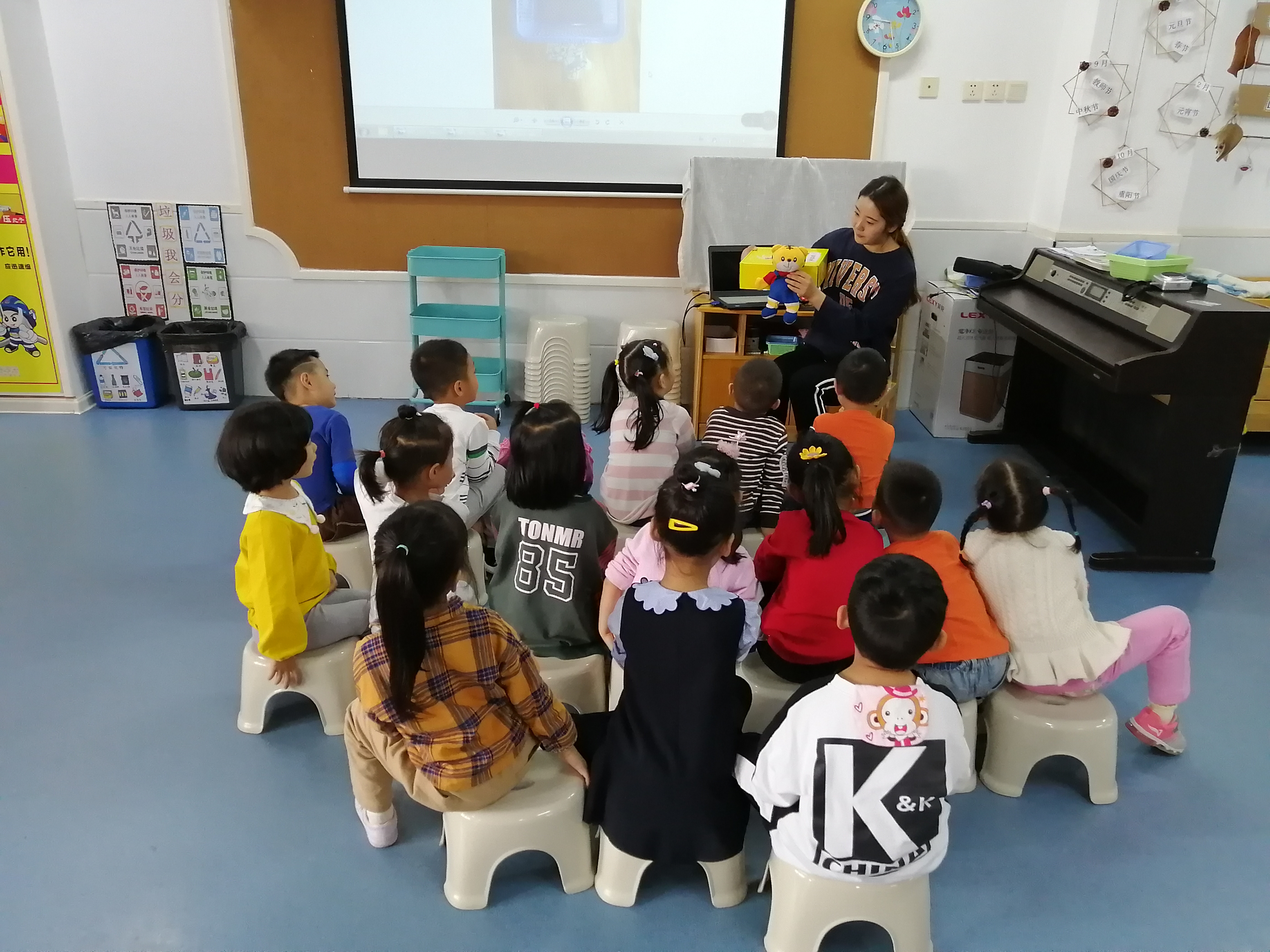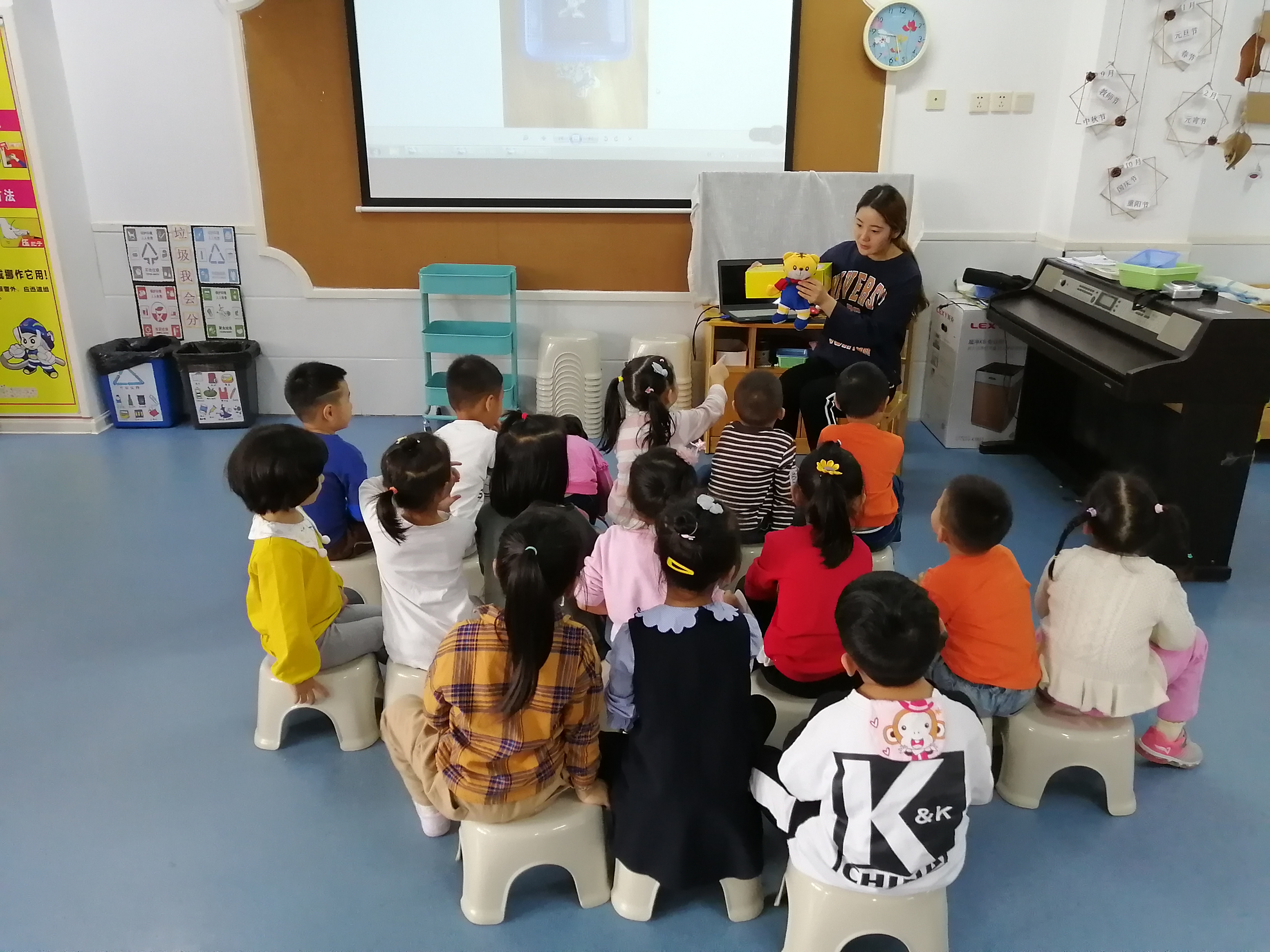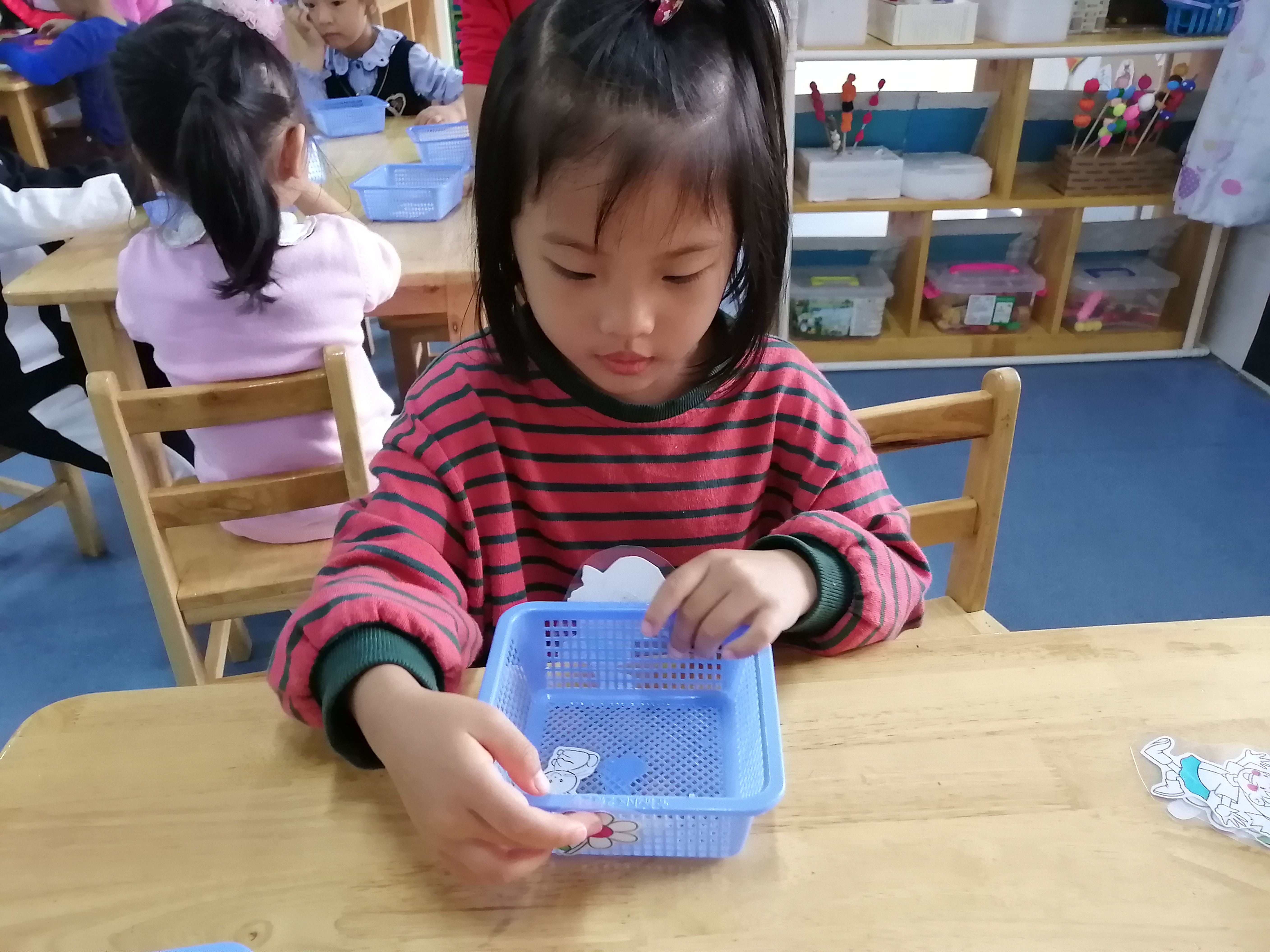 今天我们开展了数学活动——快乐的游乐场丰富幼儿空间方位识别经验,引导幼儿作用空间方位经验解决问题。刚开始通过“巧虎捉迷藏”帮助孩子认识方位:前面,后面,里面,外面。