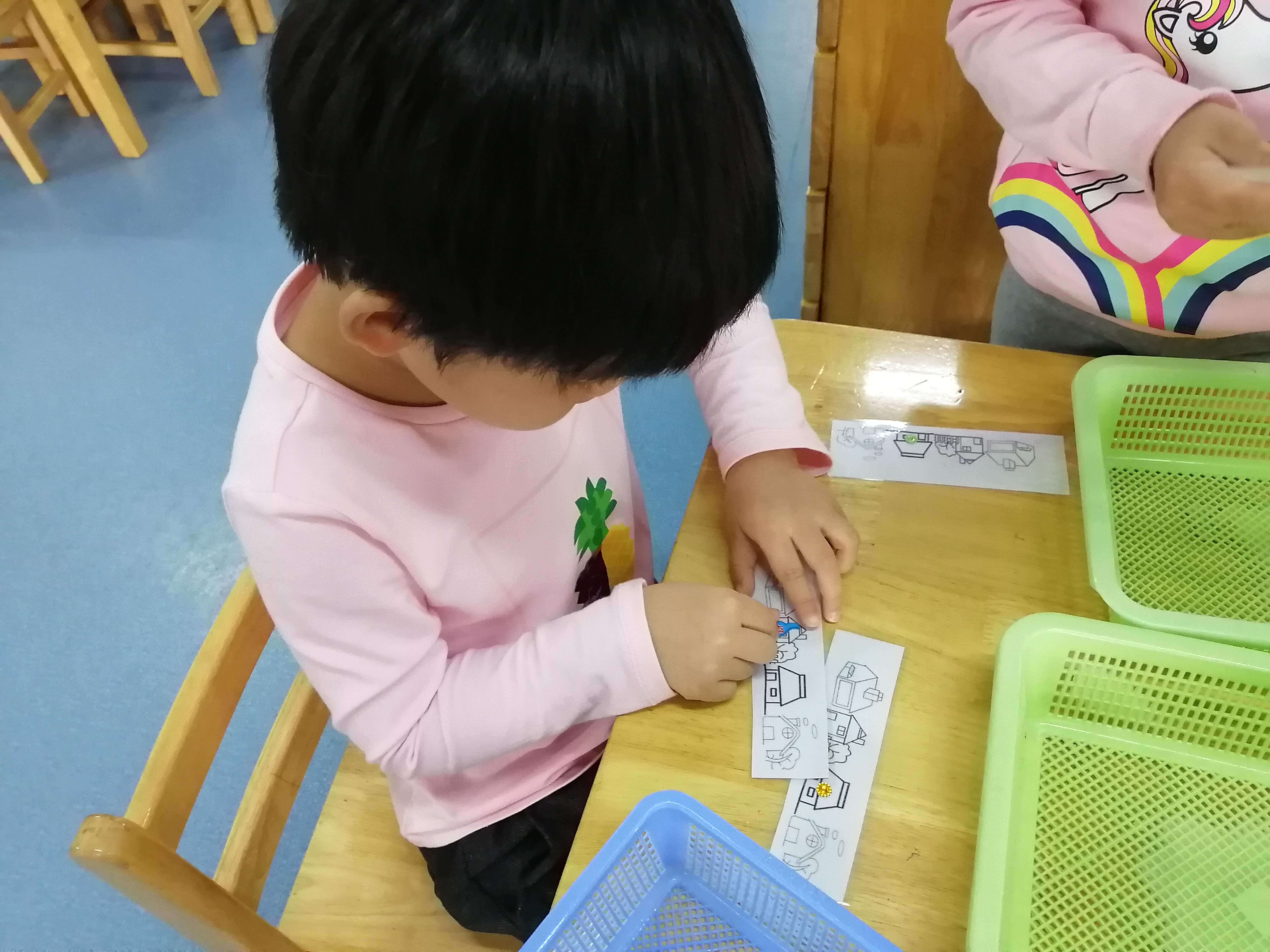 幼儿将贴画分别贴到从前往后数的第二个房子,从后往前数的第二个房子。