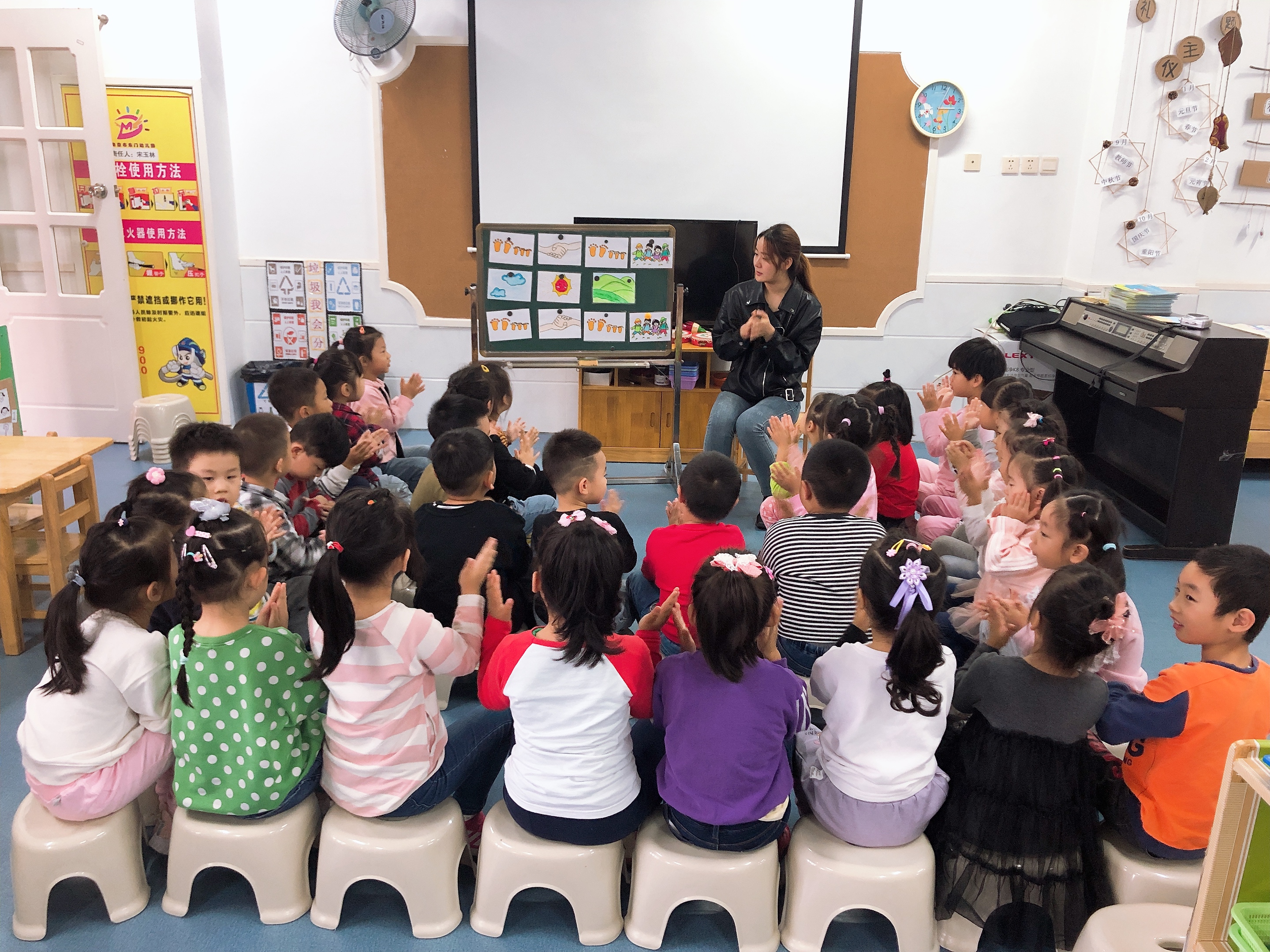 《郊游》这首曲子是大家耳熟能详的,它是aba结构,第一段和第三段是一样的,活泼欢快,中间第二段比较柔和,唱了郊游的风景。 活动开始我以谈话导入,引导幼儿说说郊游地的风景,根据幼儿的回答我用简笔画的形式画了下来,从而引出第二段歌词。接着我用动作引导幼儿说出了第一、第三段的歌词。歌词理解后,让幼儿通过听教师清唱初步熟悉歌曲旋律,然后再用钢琴伴奏,一句句学习歌唱。等唱了两到三遍后请幼儿编动作,边表演边唱,这样比较能帮助幼儿记住歌词。虽然大多数幼儿能大概将歌曲唱出来,但这样的教学方式让孩子们觉得兴趣欠缺。