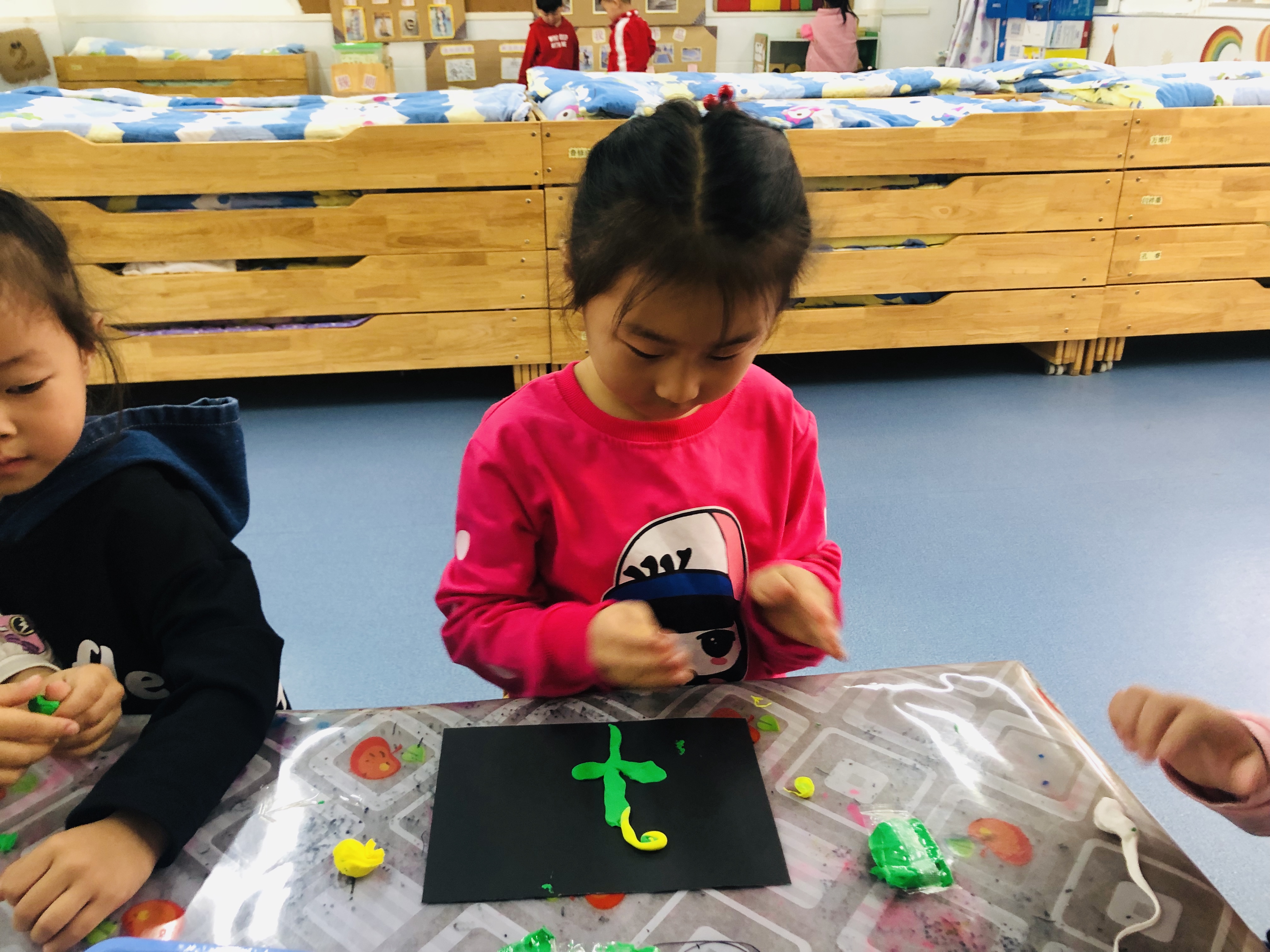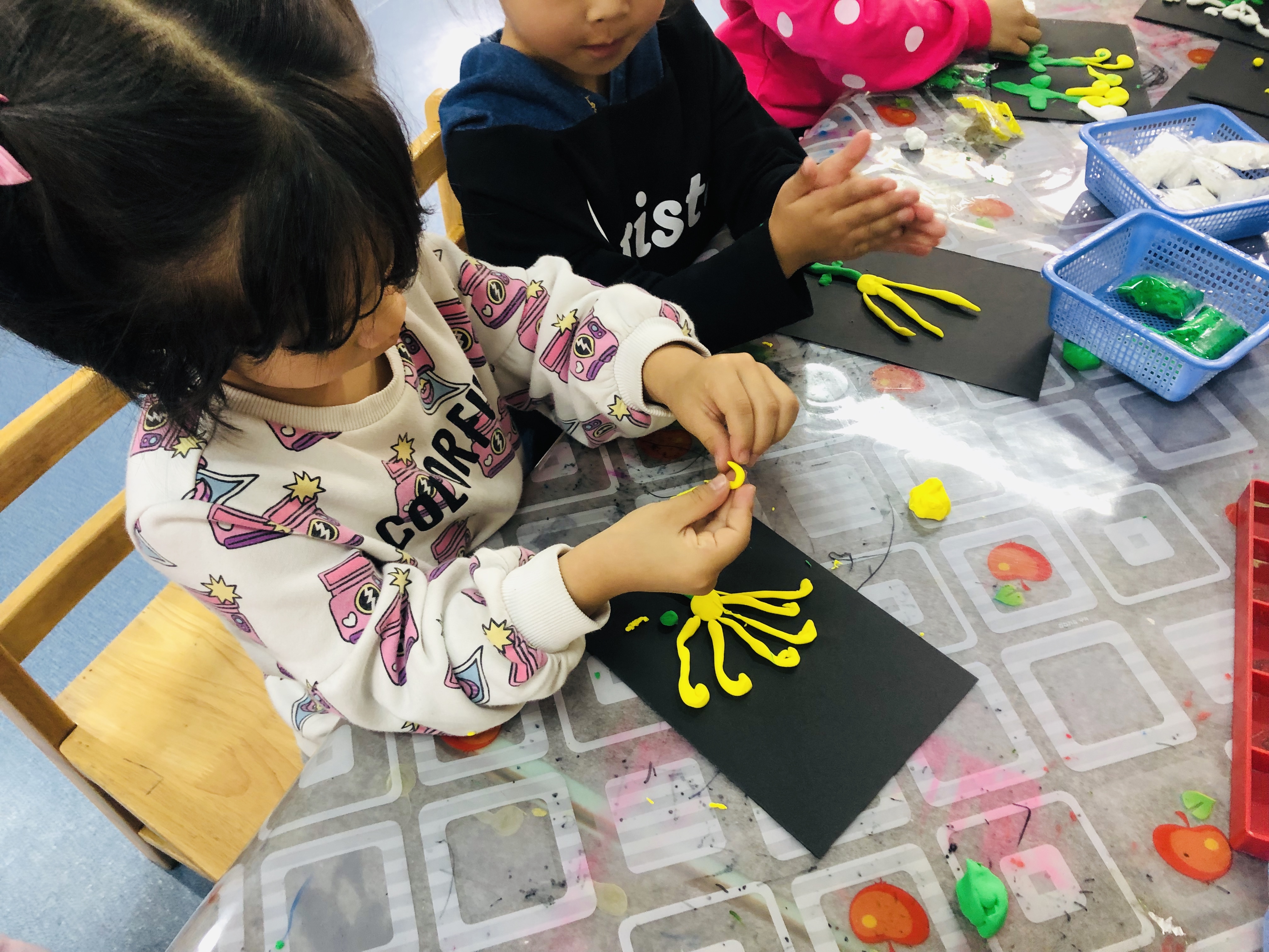 朵朵:“首先要用绿色的黏土搓一个长条做一个花根和花叶。然后我拿了黄色的黏土搓成长条把最前面用手把它往里面卷了卷添加菊花的花瓣。”