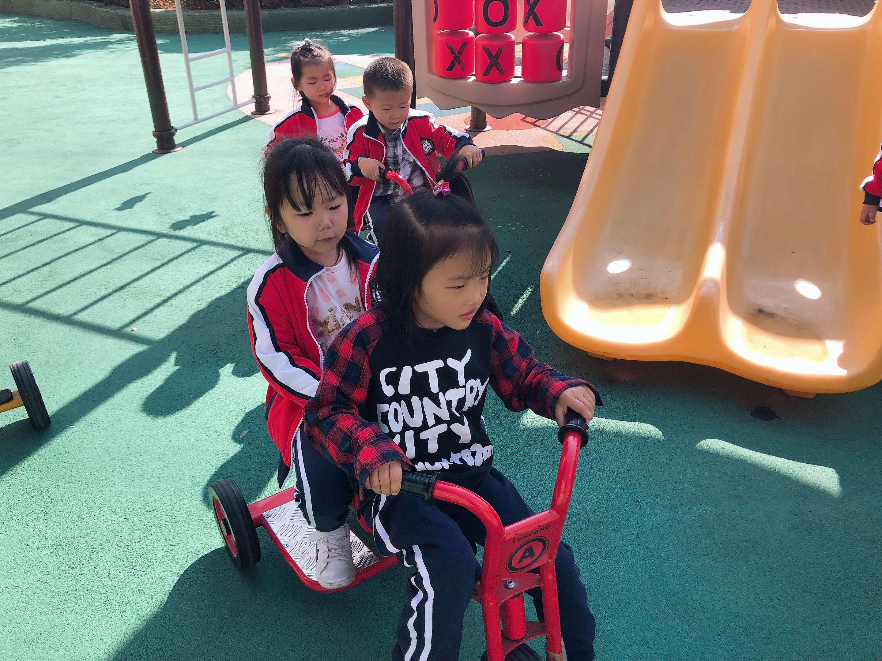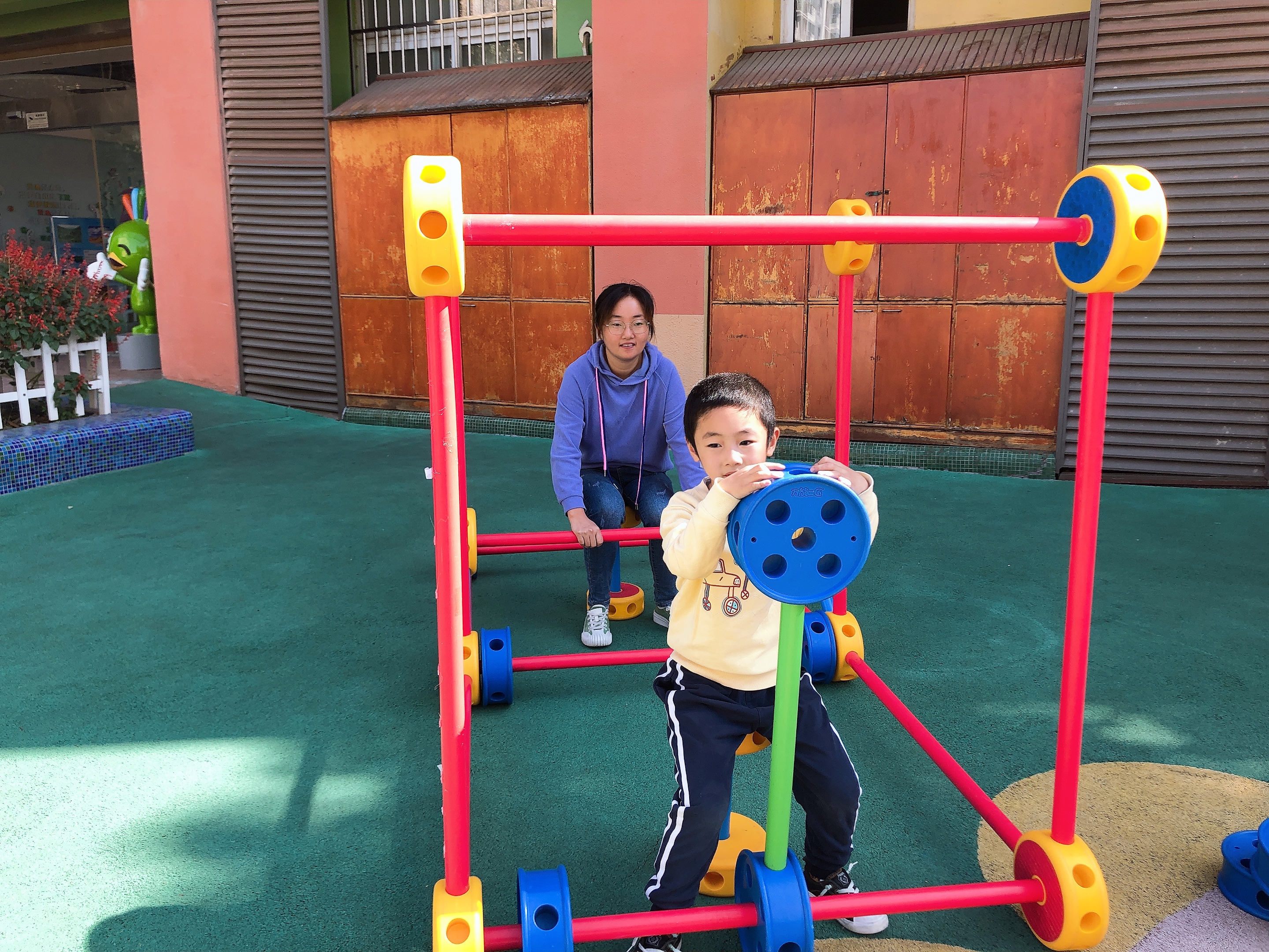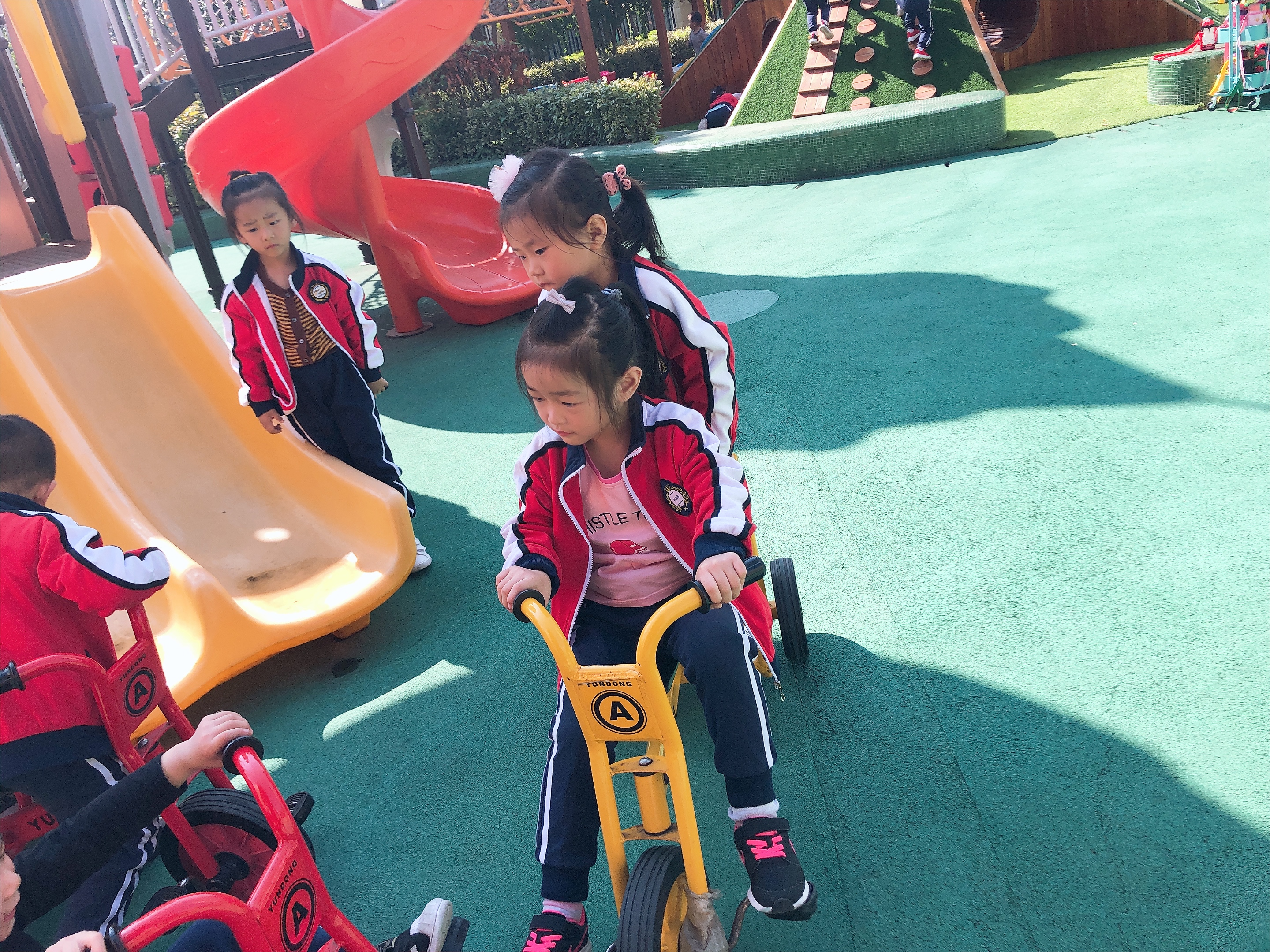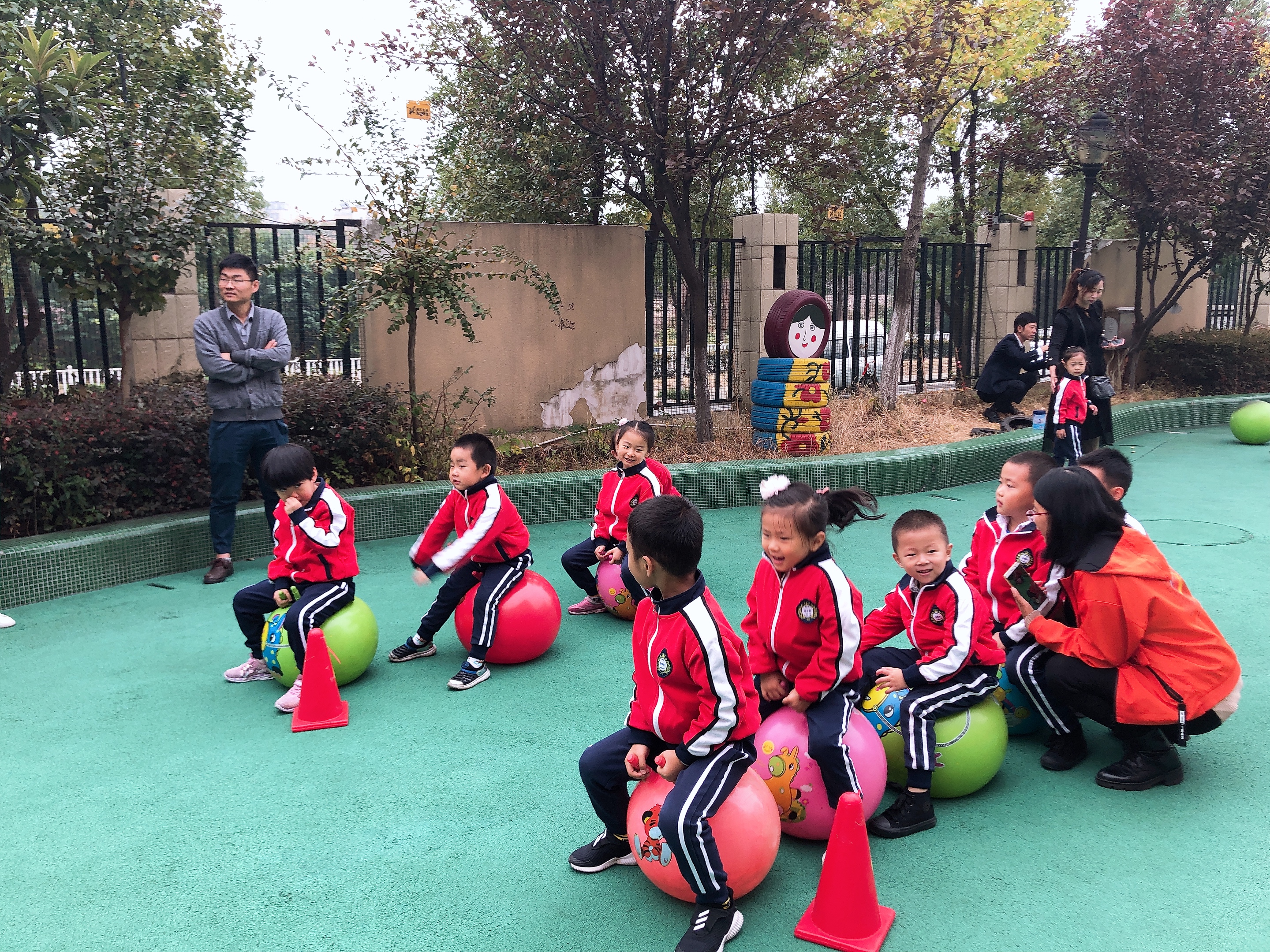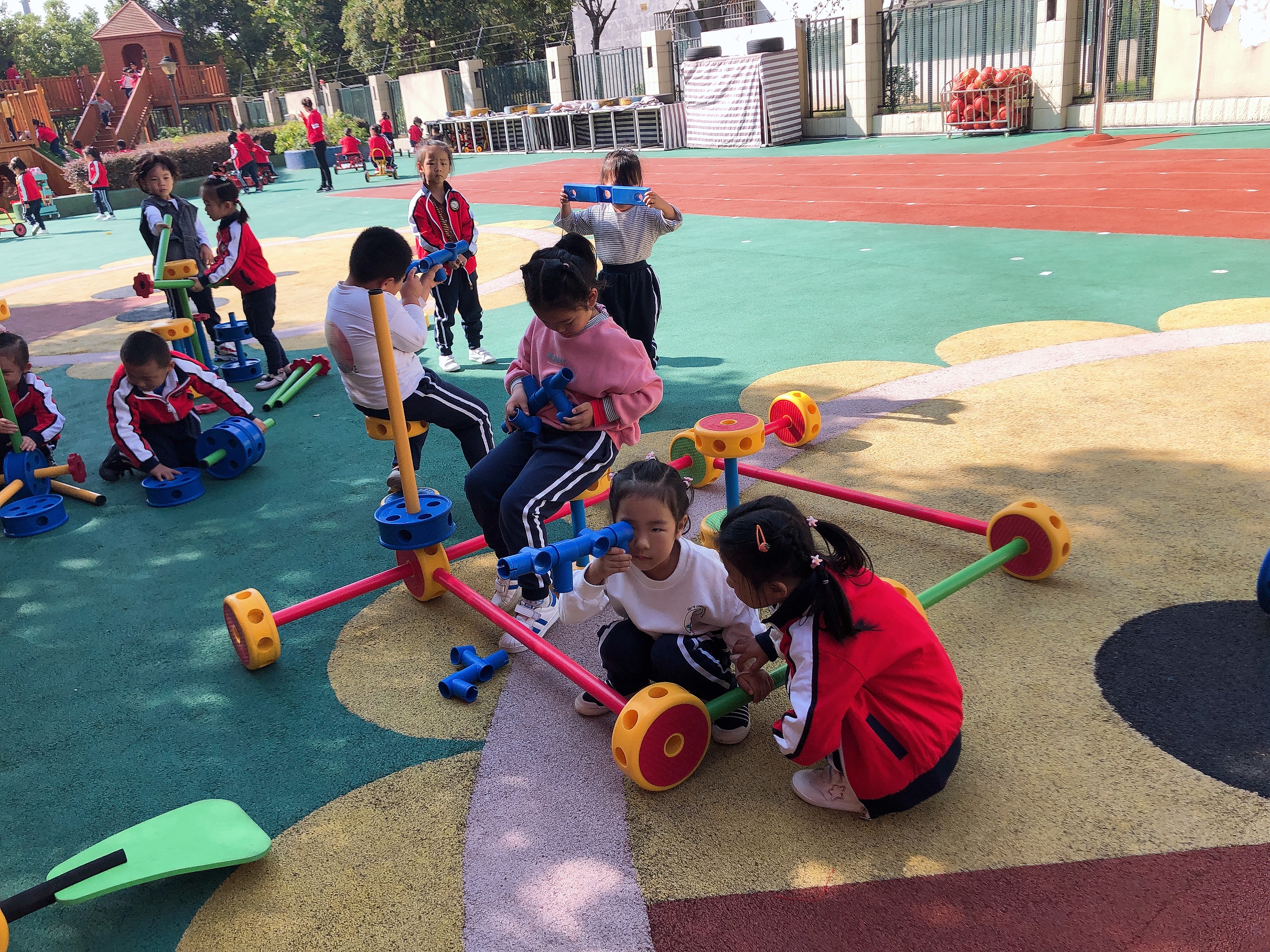 幼儿进行户外游戏:游戏一:幼儿尝试用万能工匠表现汽车的外形特征。大胆建构,体验建构成功的快乐。愿意在爸爸妈妈面前介绍自己的作品。幼儿二:骑小车,锻炼幼儿的平衡能力,与合作能力。