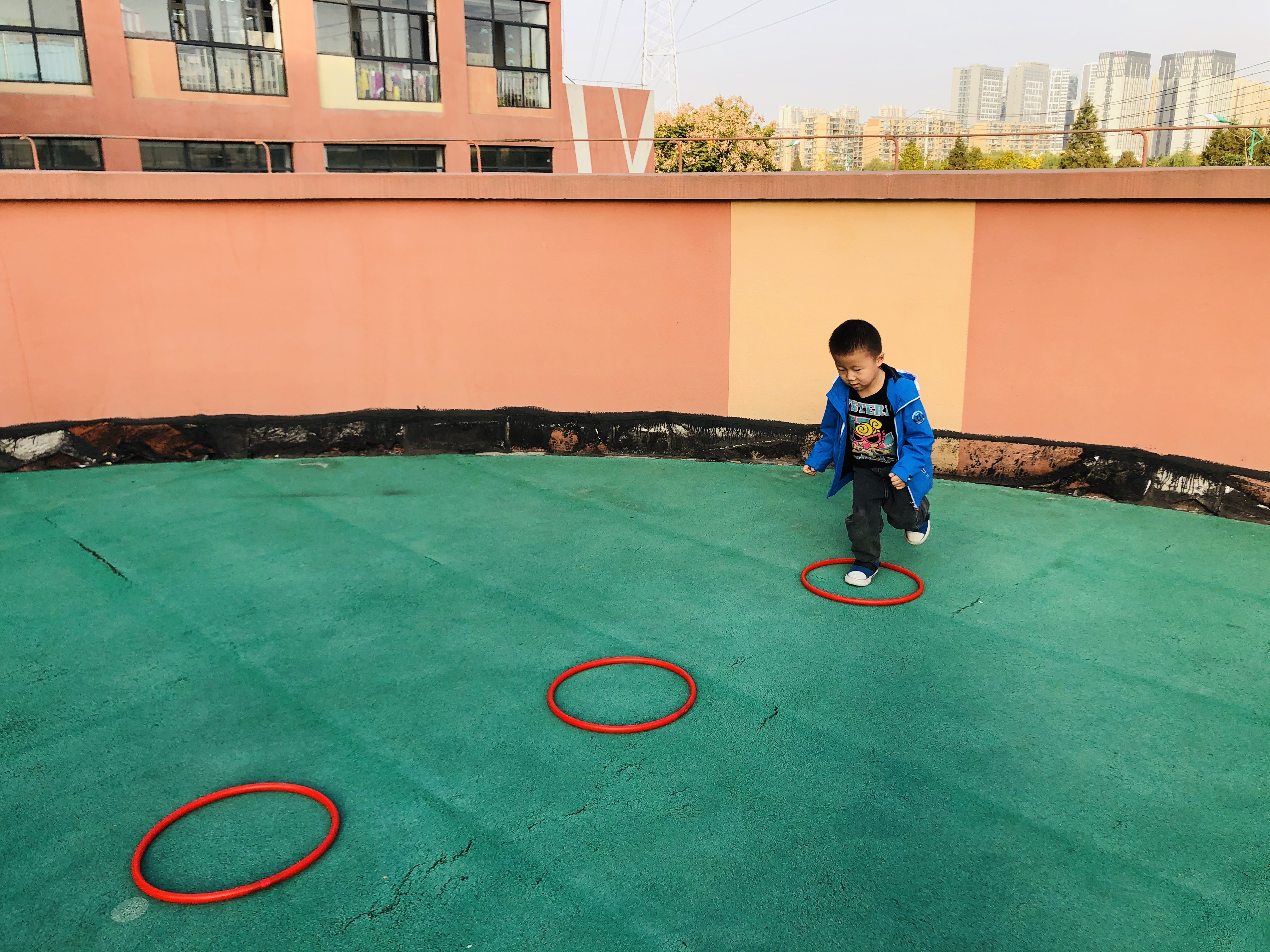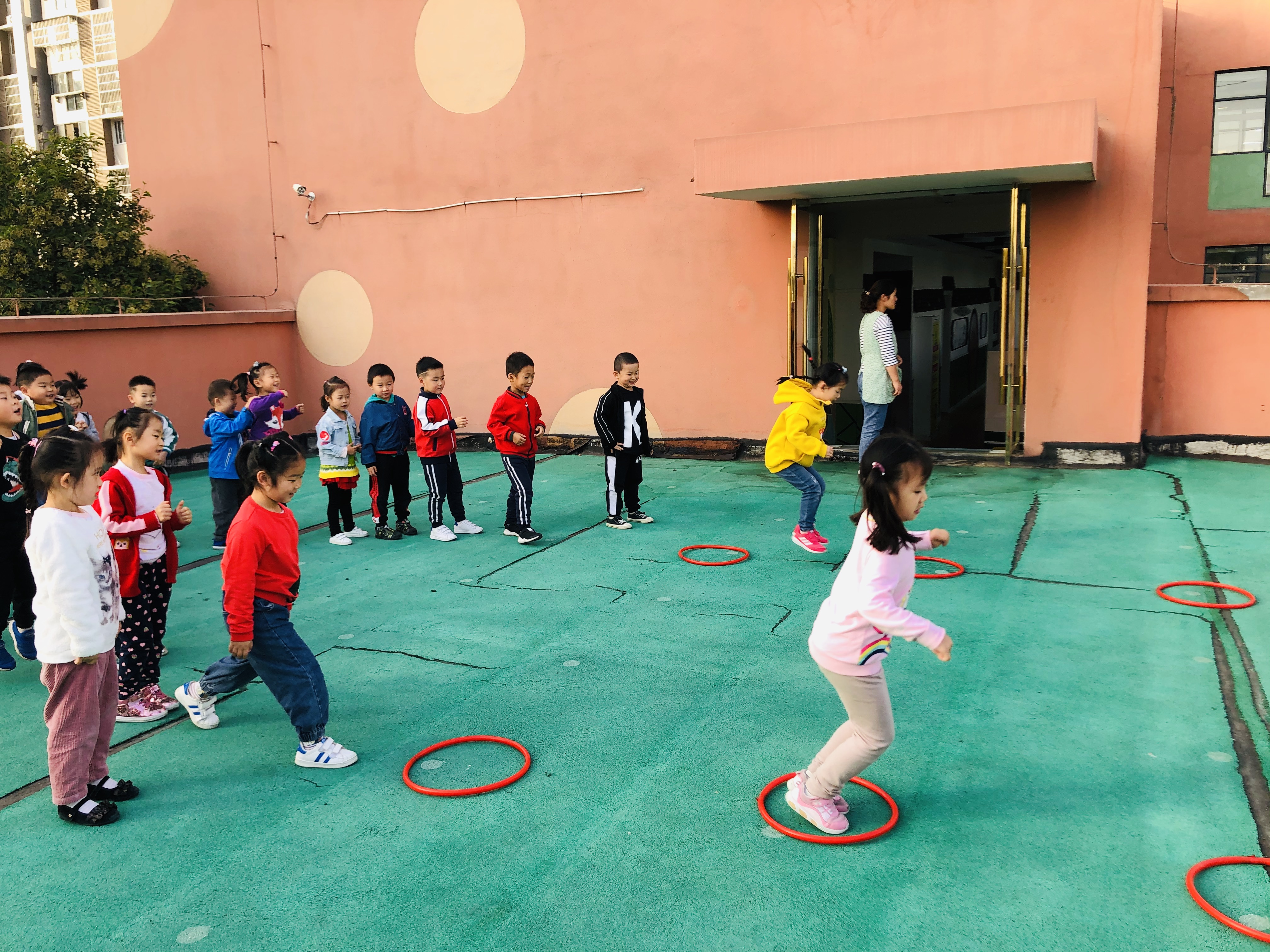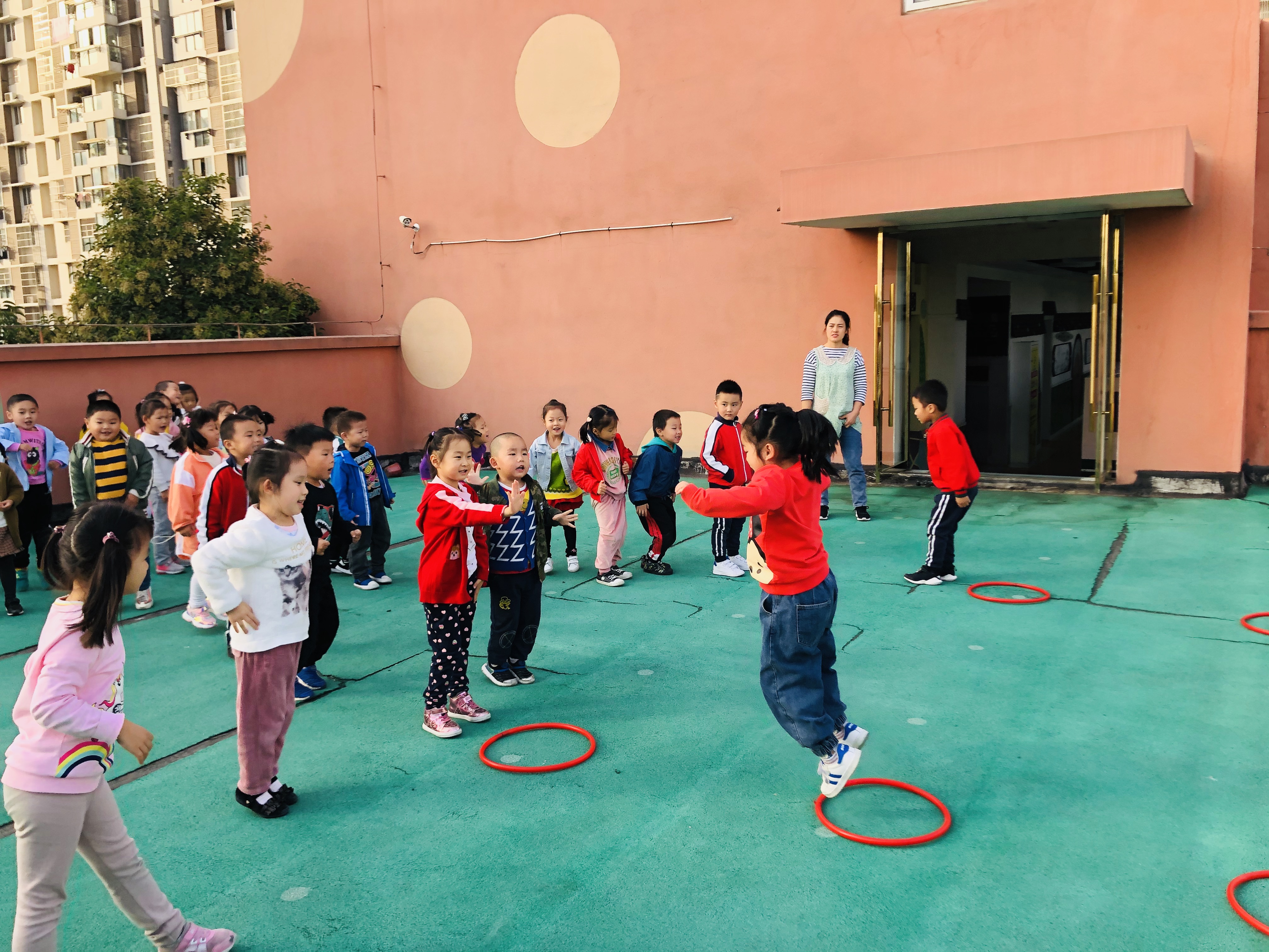 为了培养幼儿的身体协调能力和增加幼儿之间的合作意识,今天我们在户外开展了体育活动:跳圈比赛。游戏开始前教师带领幼儿热身游戏:秋风吹落叶。幼儿做落叶,老师扮演秋风。刮小风,幼儿慢慢走;刮大风,幼儿快快跑;风停了,幼儿停下来。