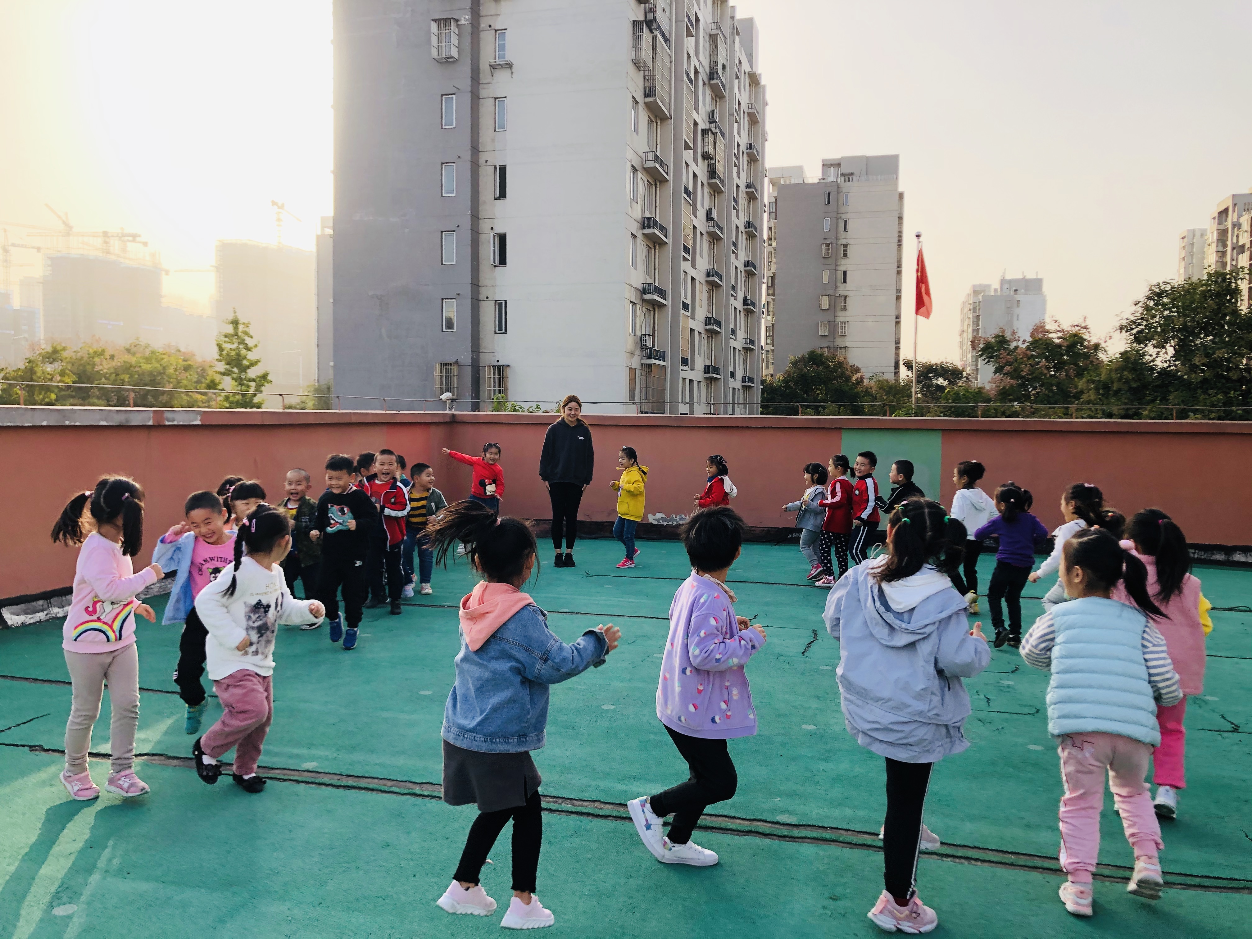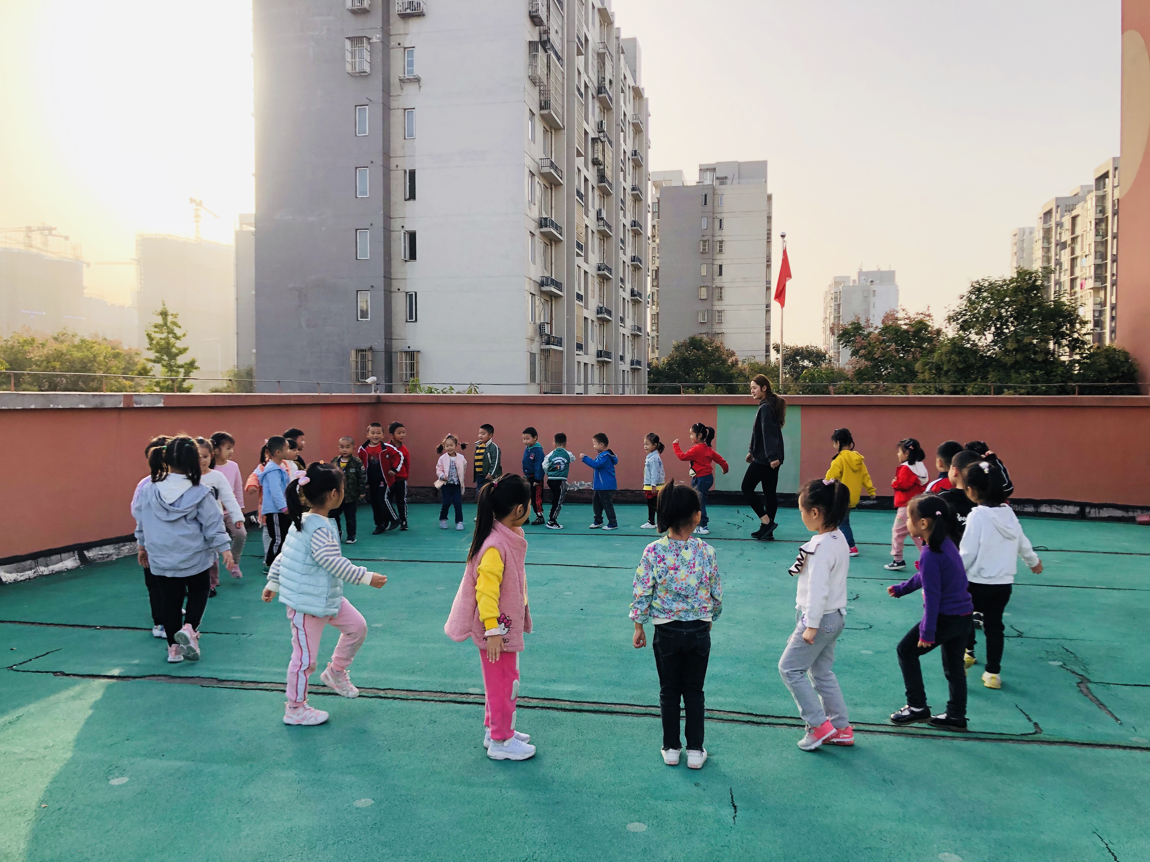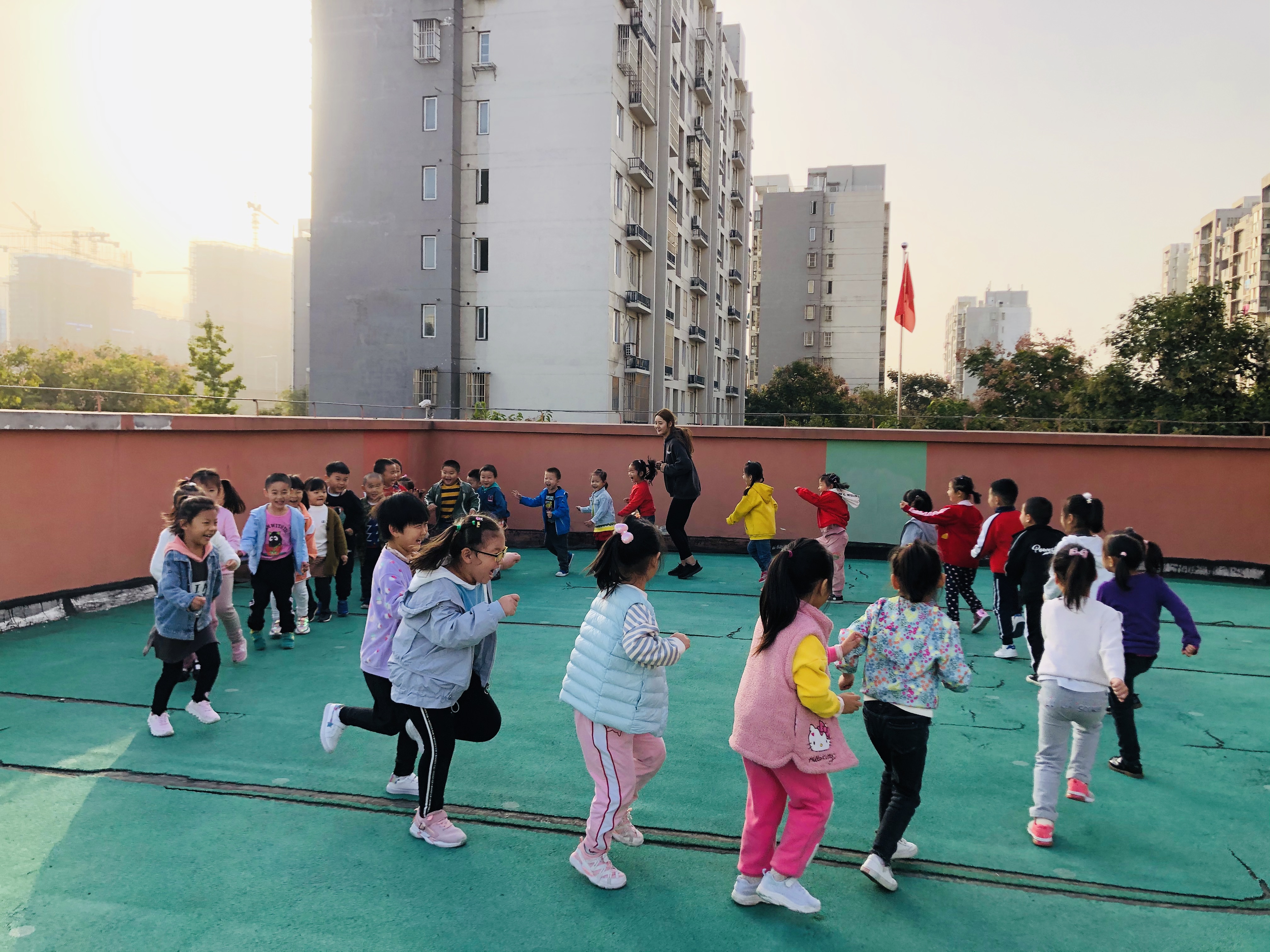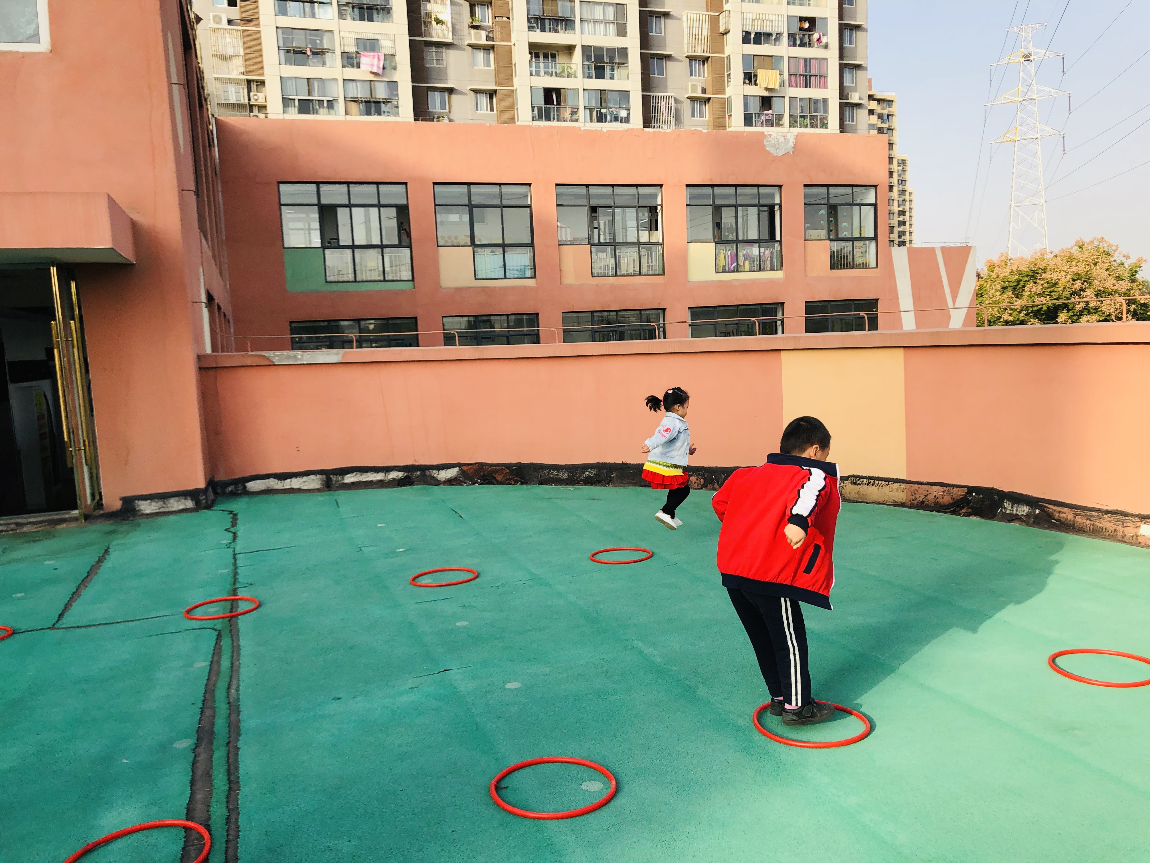 为了培养幼儿的身体协调能力和增加幼儿之间的合作意识,今天我们在户外开展了体育活动:跳圈比赛。游戏开始前教师带领幼儿热身游戏:秋风吹落叶。幼儿做落叶,老师扮演秋风。刮小风,幼儿慢慢走;刮大风,幼儿快快跑;风停了,幼儿停下来。
