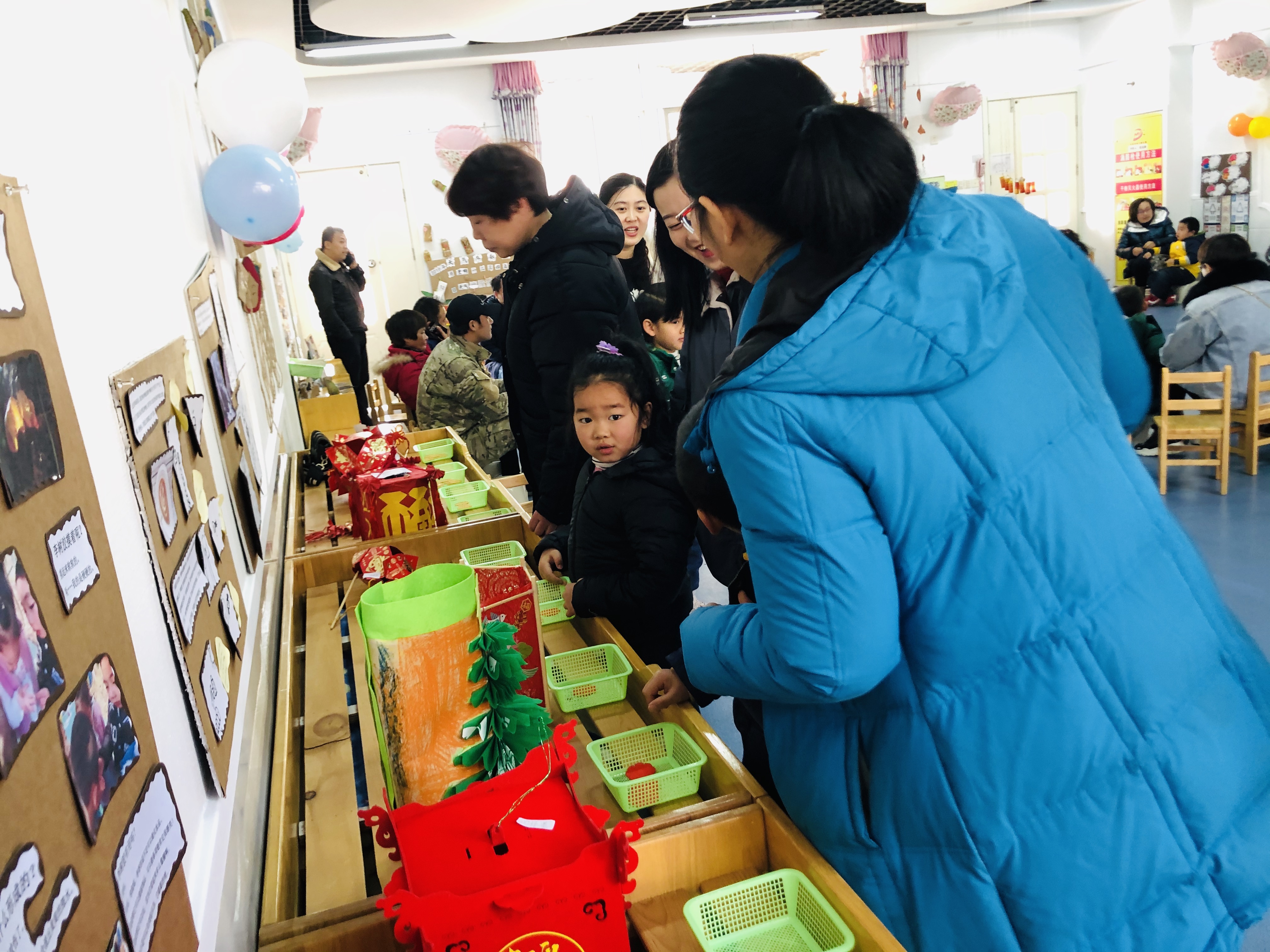 首先宝贝们和自己的爸爸妈妈带着自己制作的“迎新年”亲子手工作品进行了大型走秀活动:我祝大家新年快乐,年年有余……