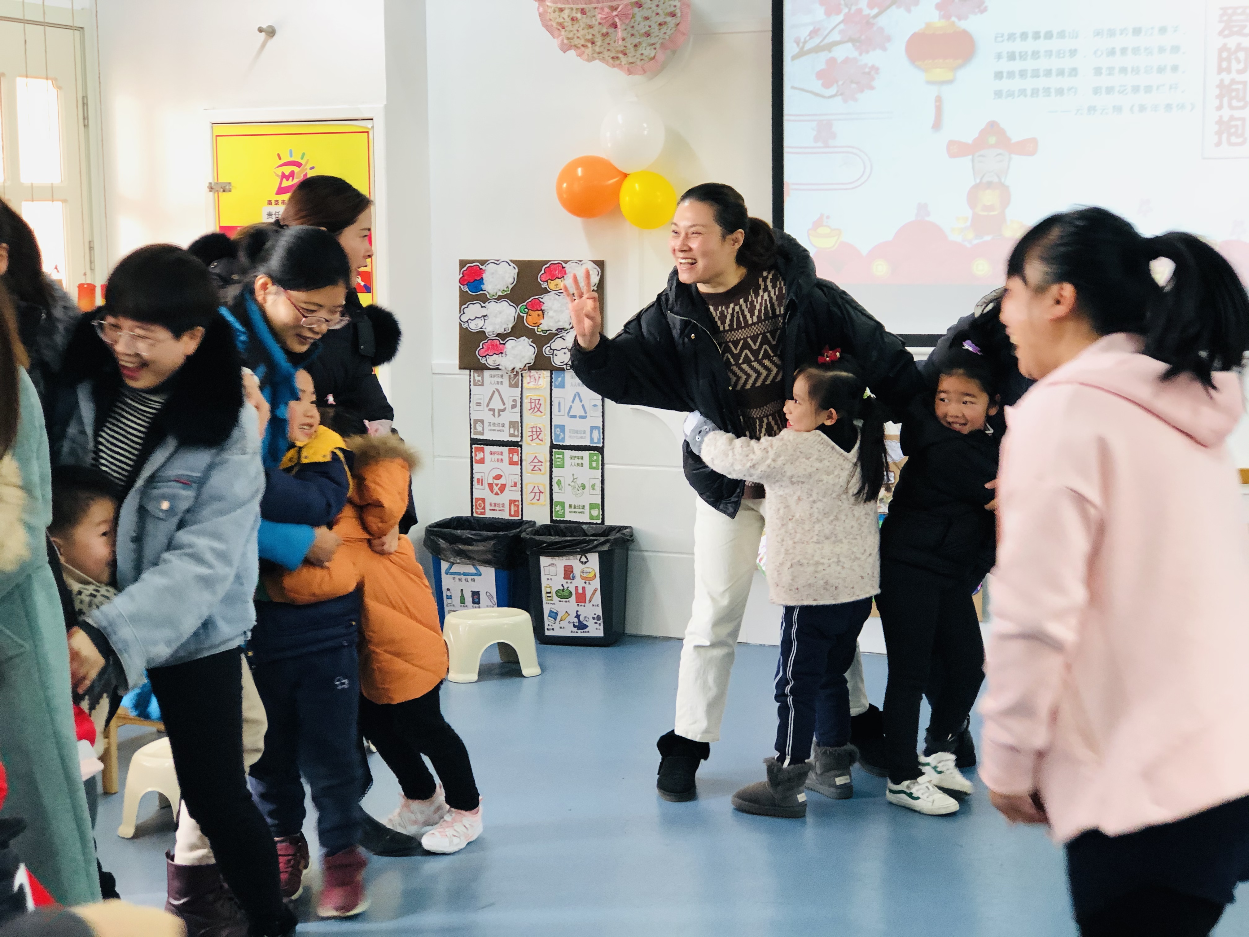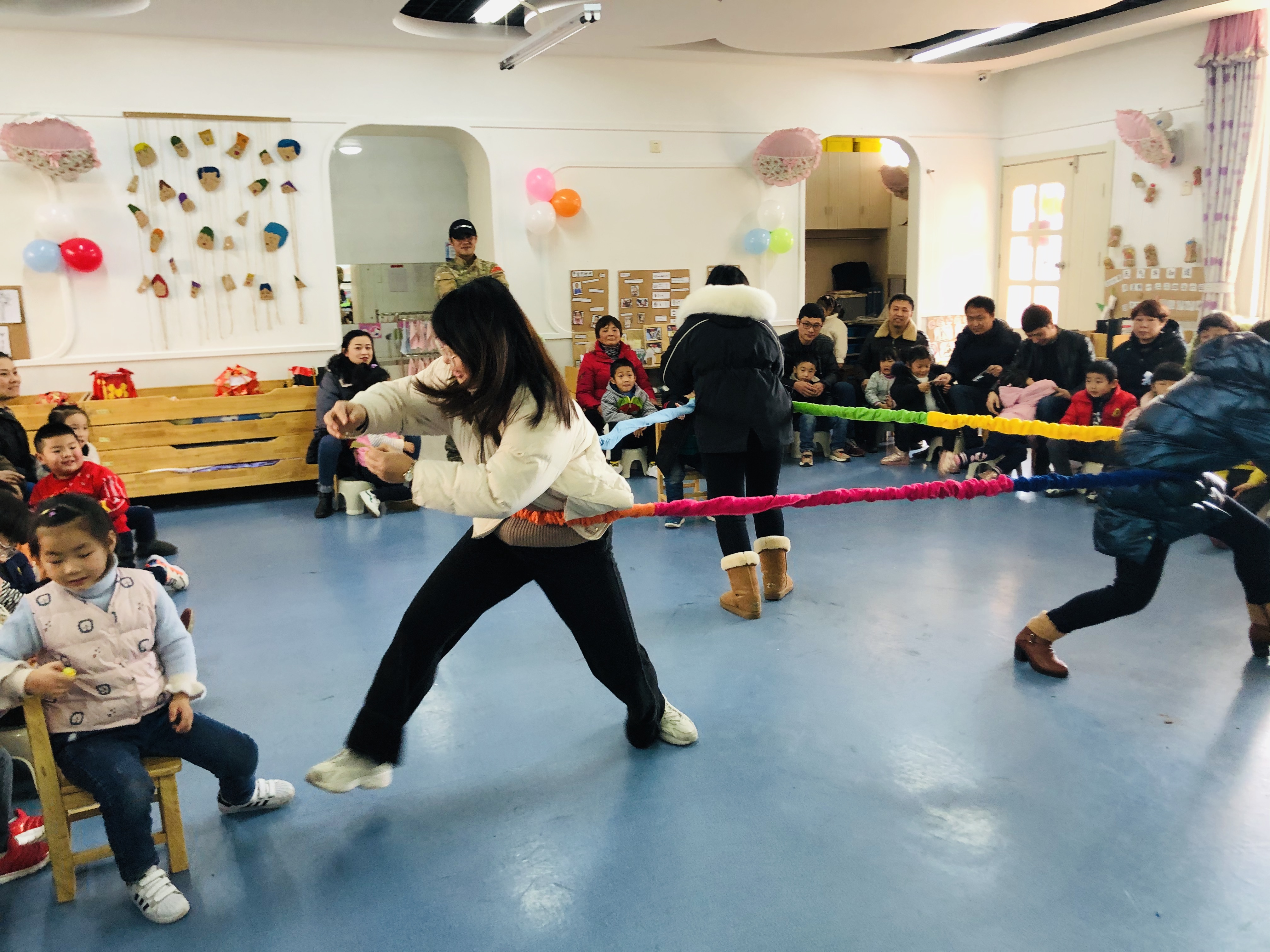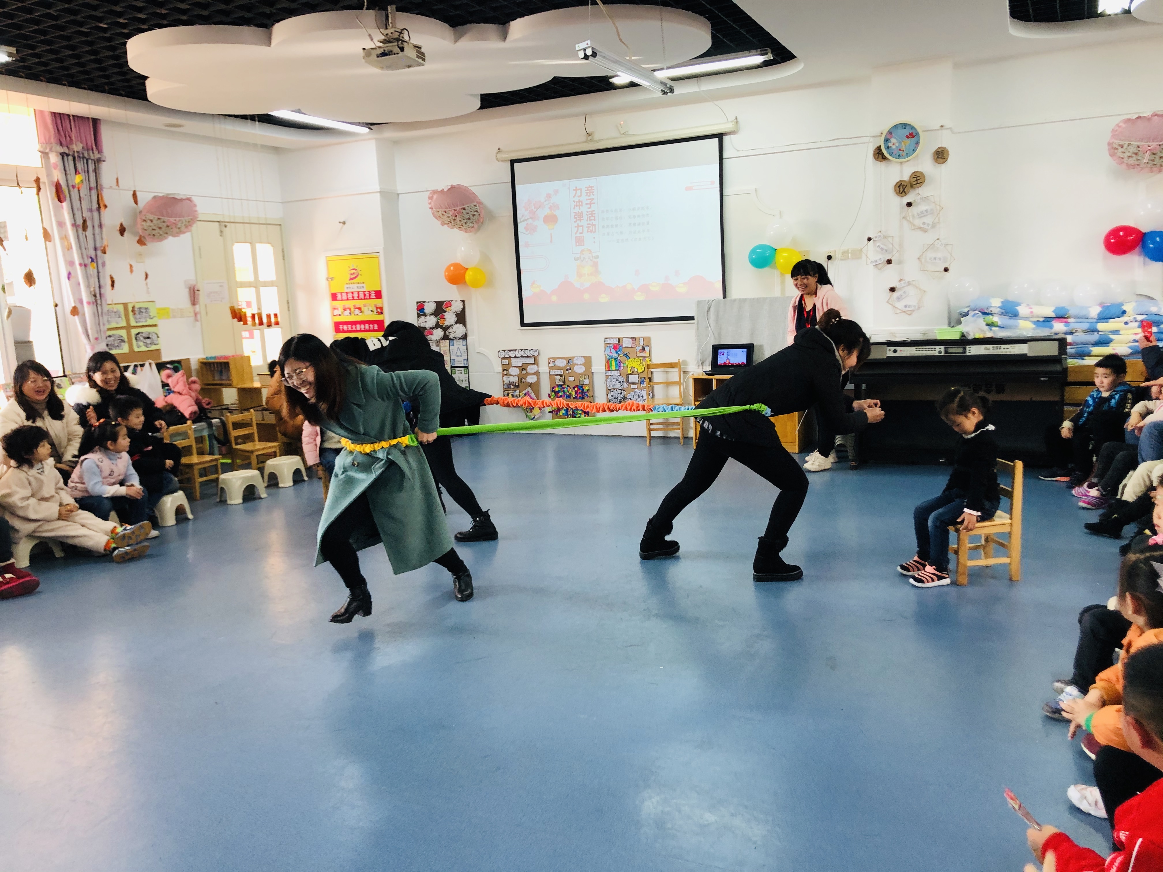 下面又进行了两个有趣的游戏:爱的抱抱,力冲弹力圈。努力的家长们让孩子们收获不少小奖品。