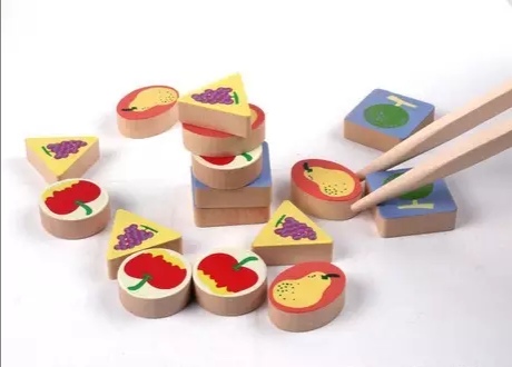 玩法:给孩子一双筷子,让他平着端好。你在筷子上放一些比较轻的东西,让孩子平端着筷子从桌子的这一边搬运到另一边去。