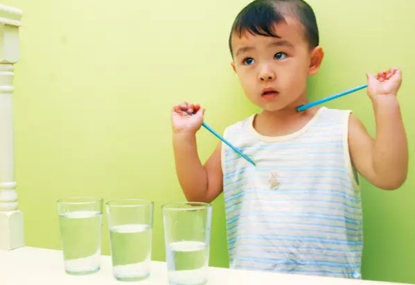 玩法:准备几个透明的玻璃杯,分别装上不同量的水,按水量的多少依次排列摆放。让孩子用筷子去敲击,注意听水量不同的杯子,发出的声音有什么不同。