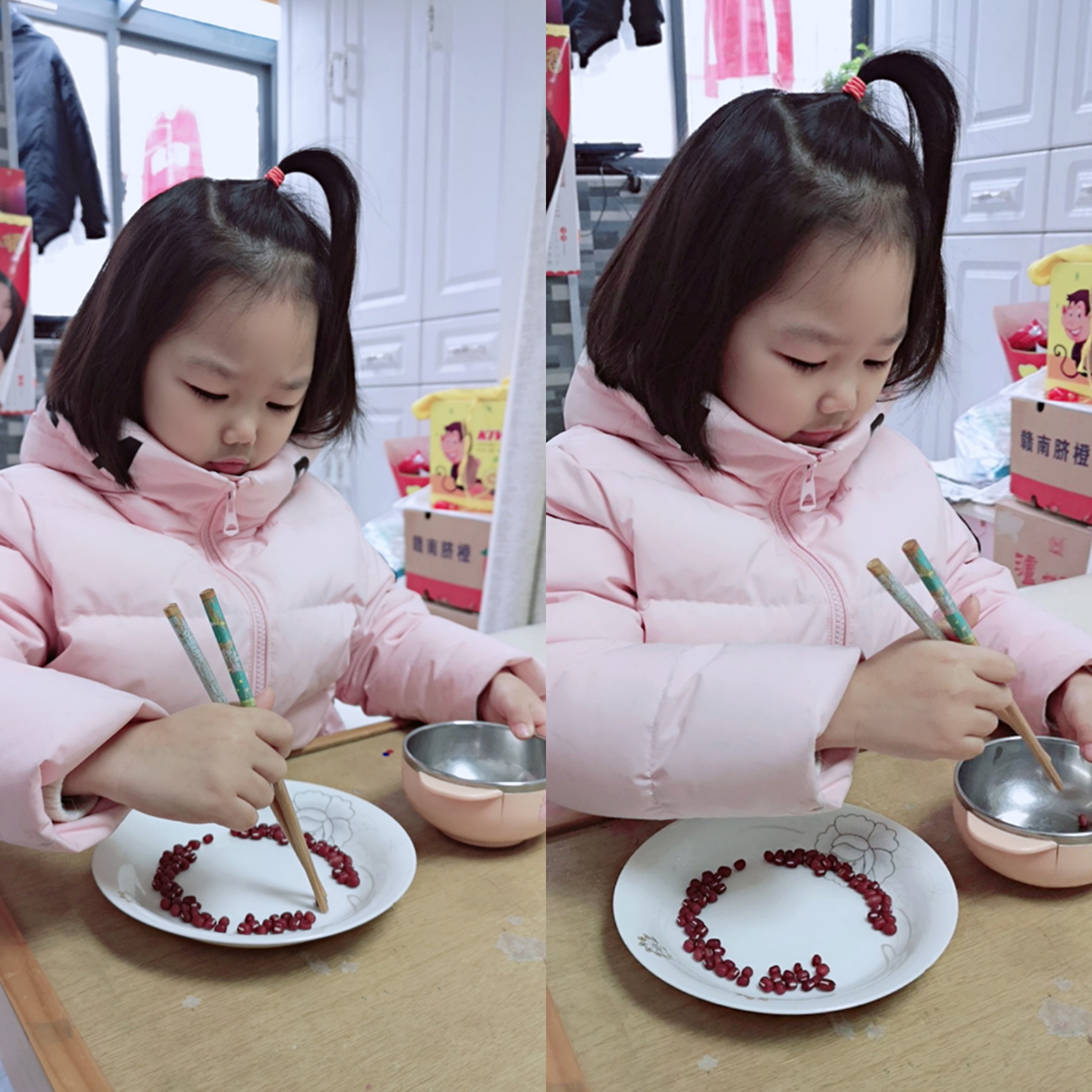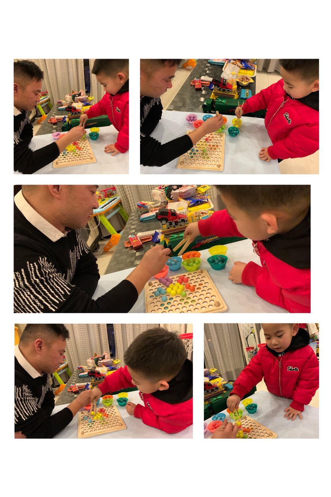 亲爱的的爸爸妈妈们放下手机,和宝贝们共同在生活中寻找材料,有弹珠、花生米、巧克力豆、玩具、豆子等,大家一起来比赛!瞧,学习的快乐就是在父母的陪伴中体验、获得新的经验,增进亲子感情还锻炼了生活自理能力,棒棒哒!