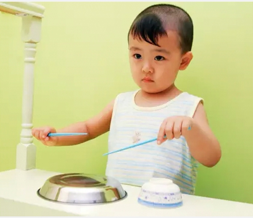 玩法:把厨房里的锅碗瓢盆拿出来,让孩子用筷子尽情地敲击,从中感受不同物体发出的声音。