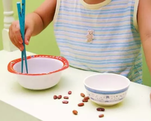 玩法:准备两个盘子,在其中的一个盘子里放上一些豆子,让孩子用筷子把豆子夹到另一个空盘子里。如果孩子还不太会用筷子,可以先让他夹比较容易夹的东西,如棉花球、爆米花等。