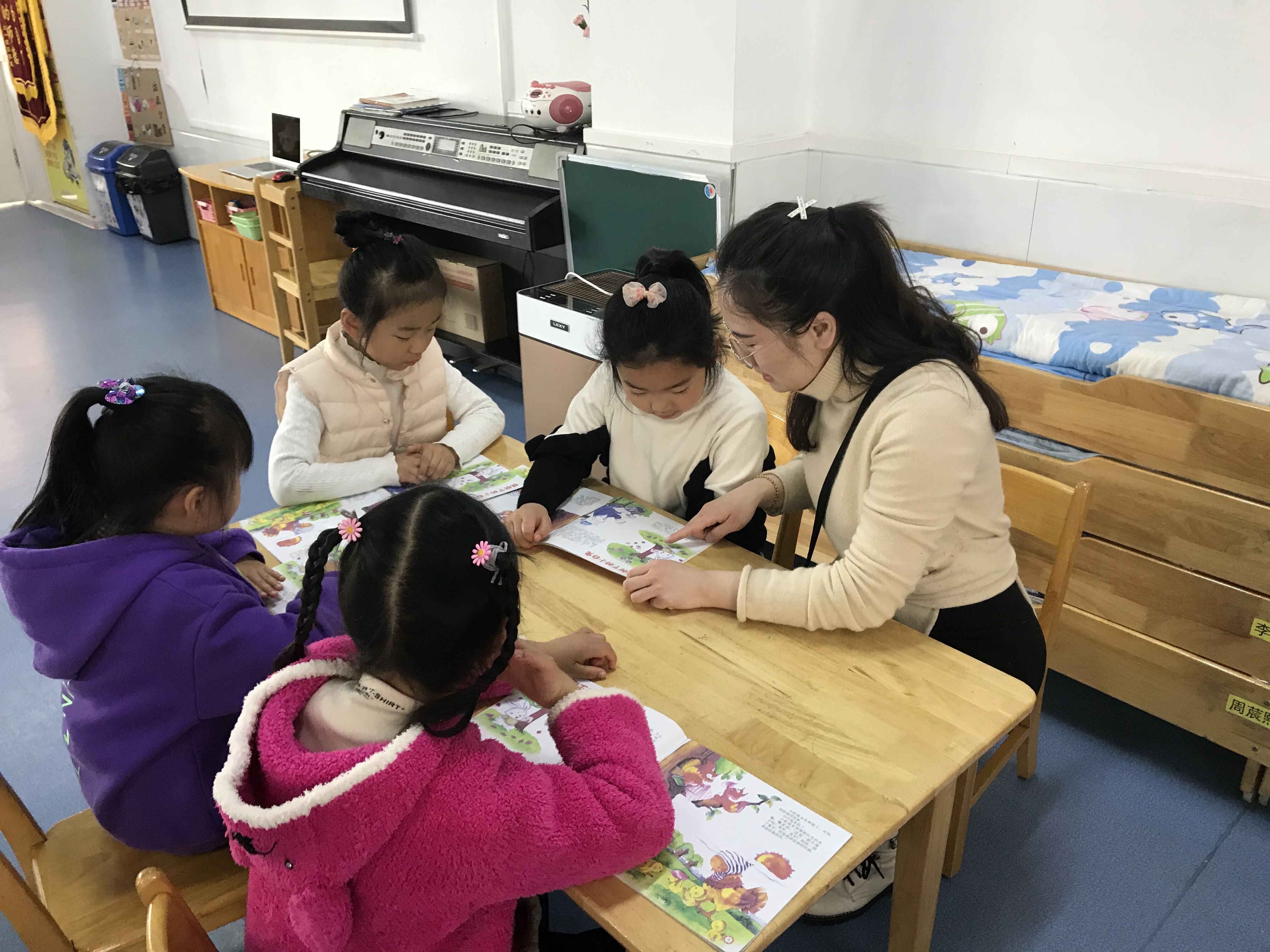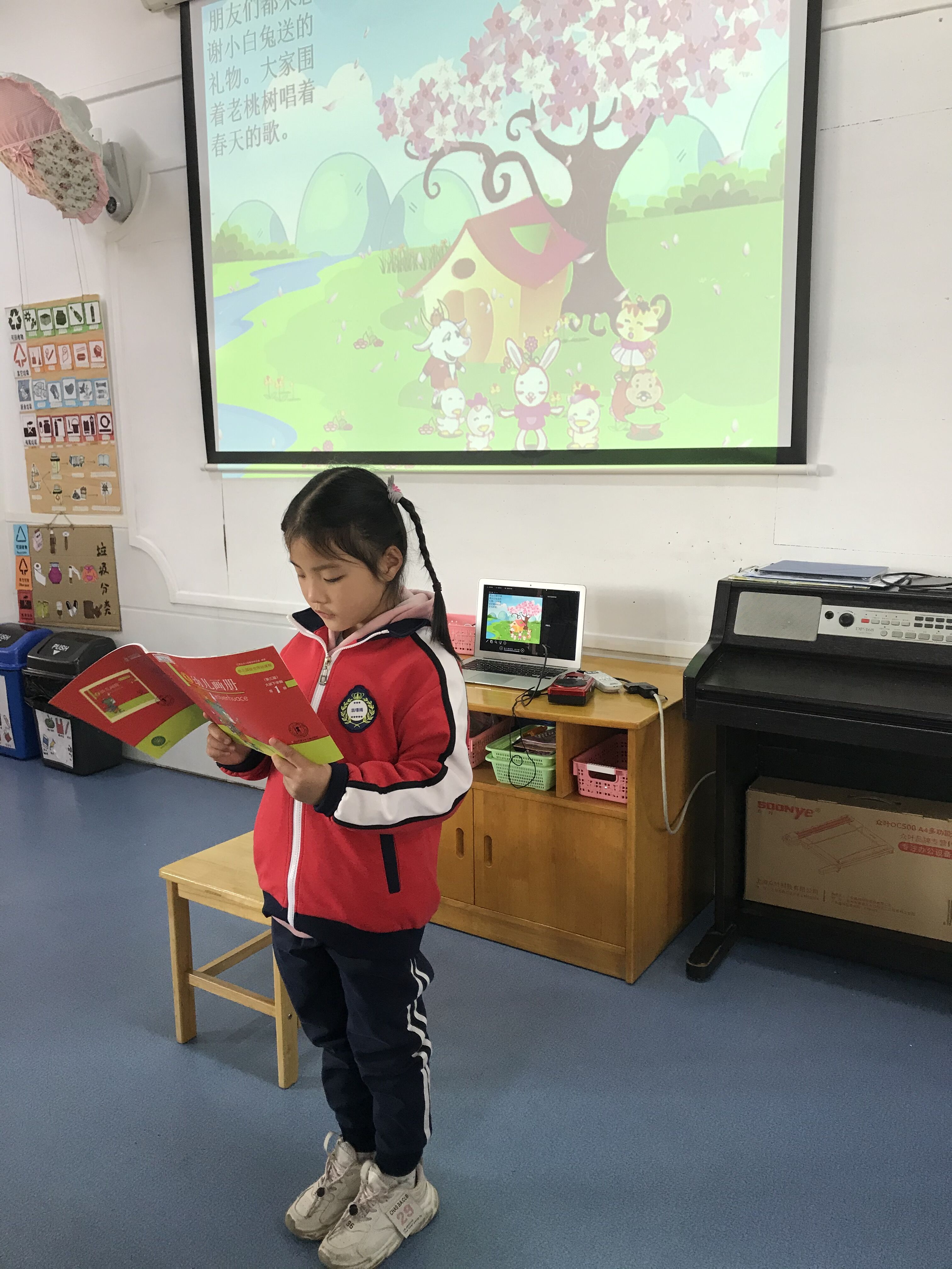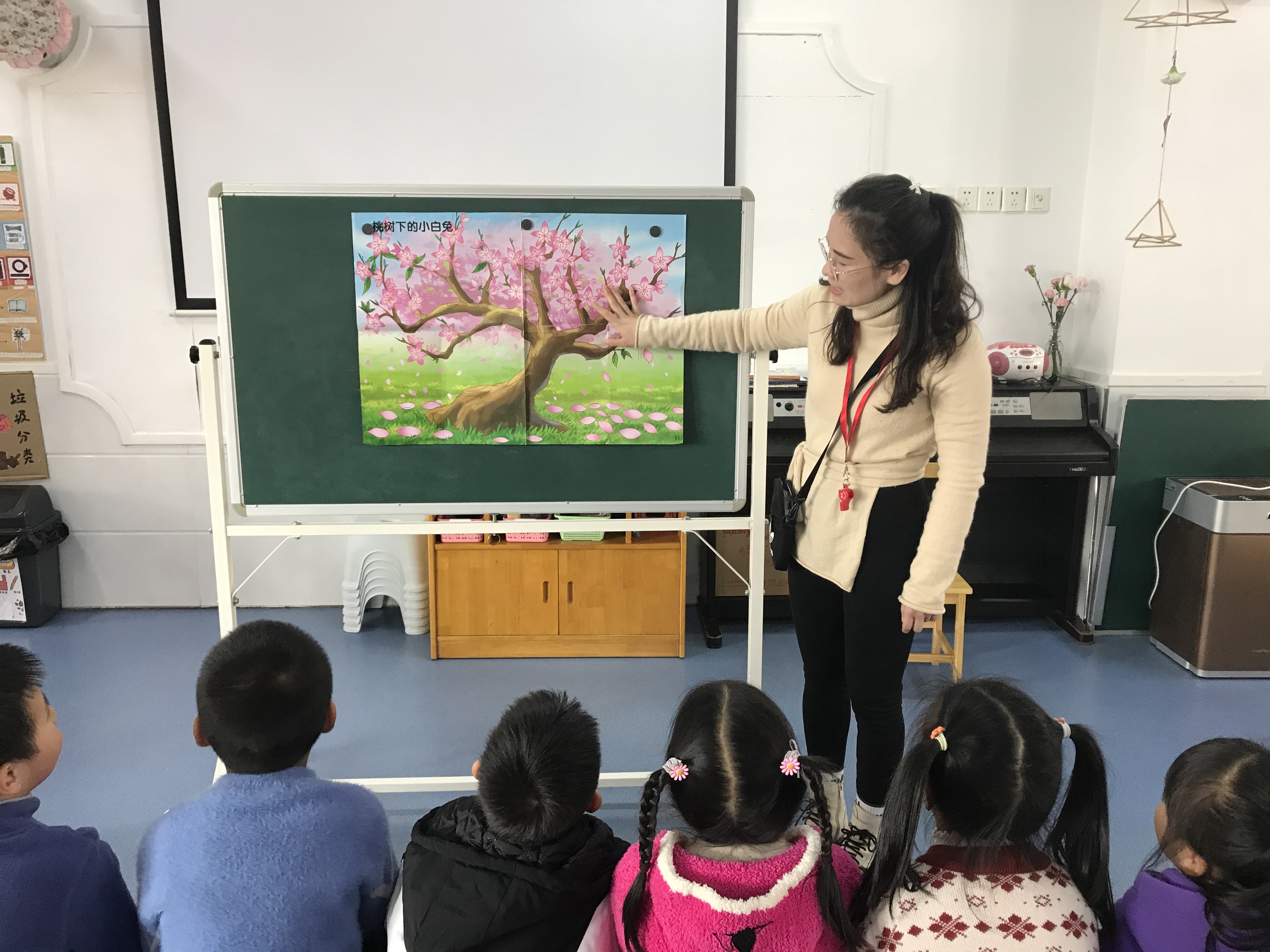 《指南》中语言领域目标中指出5-6岁的幼儿要具备喜欢听故事、看图书的能力,幼儿能专注阅读图书、喜欢与他人一起谈论有关图书和故事的有关内容,为了激发幼儿的阅读兴趣,培养阅读习惯。本周开展了语言教学活动《桃树下的小白兔》。