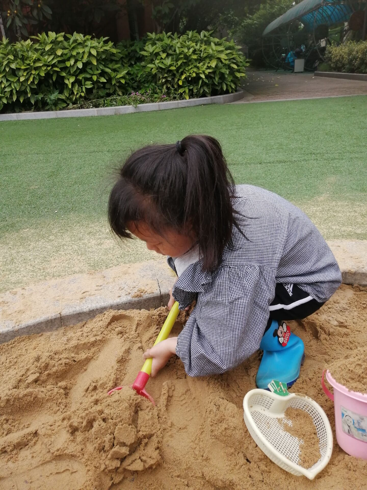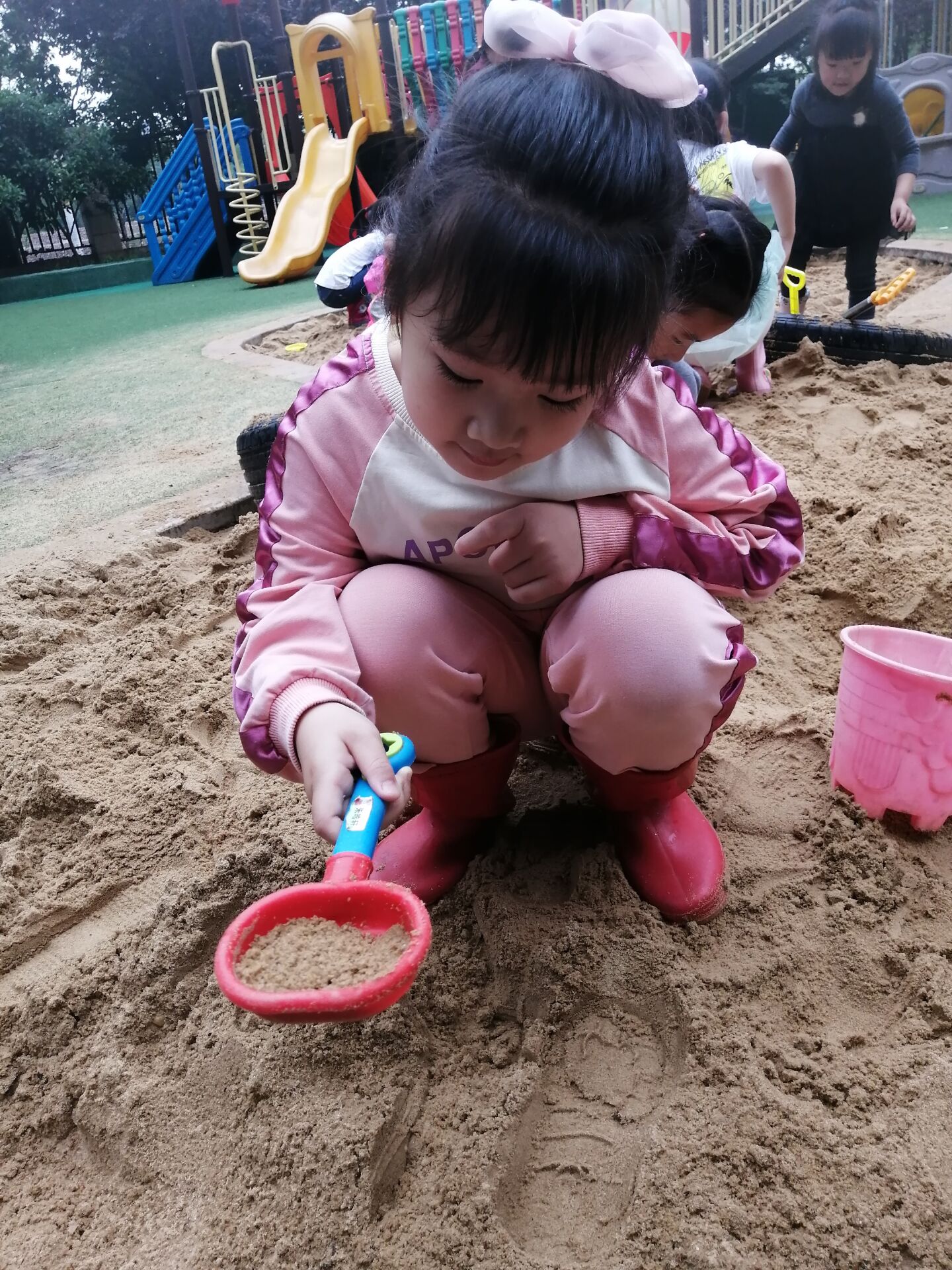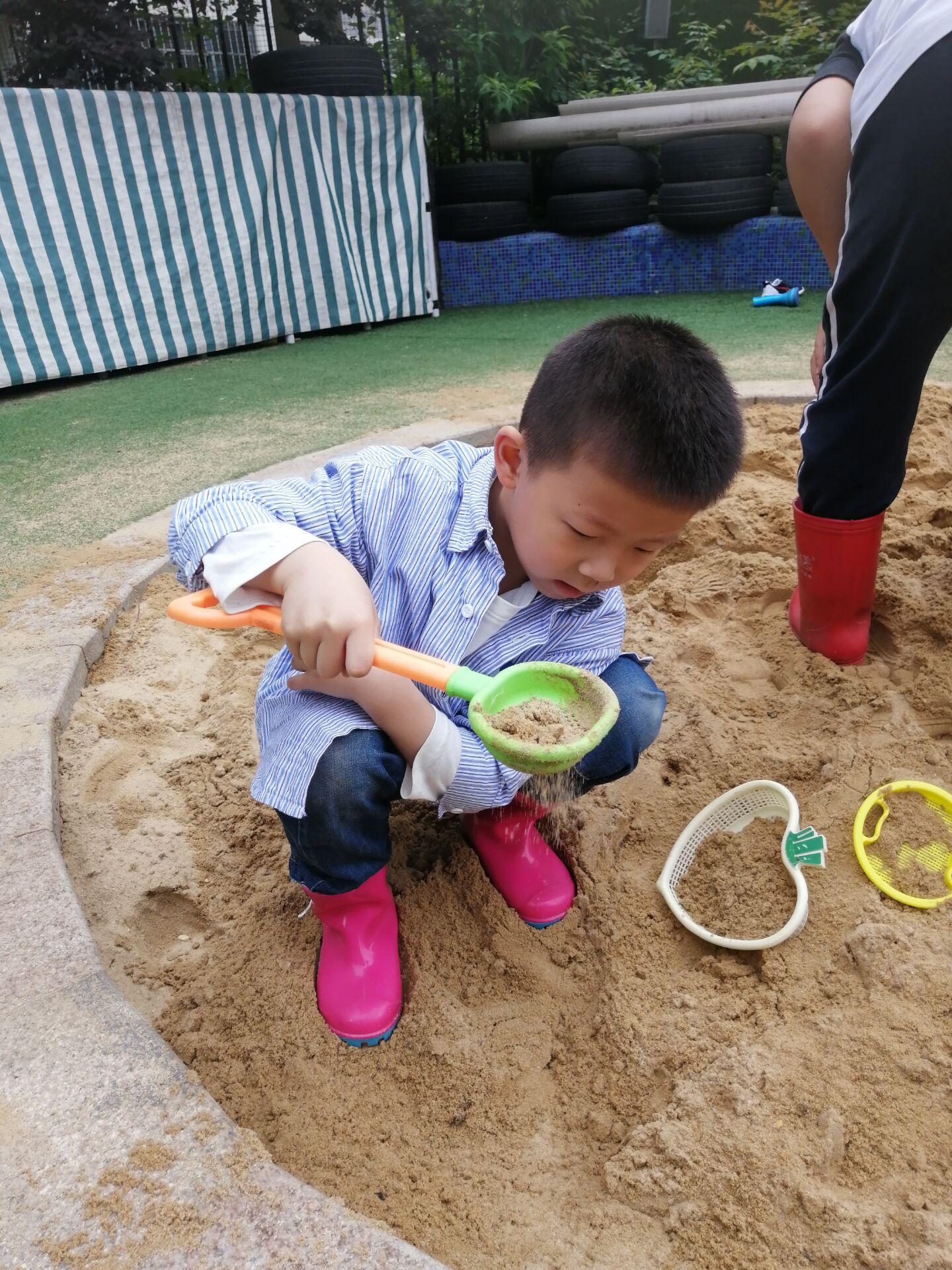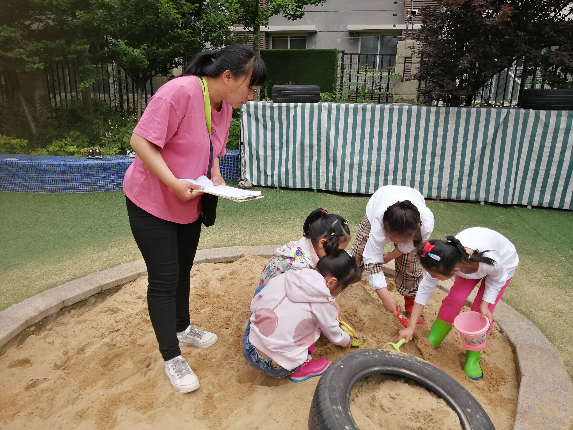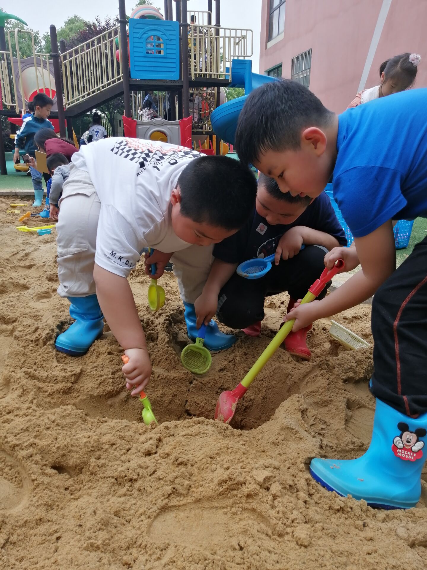 本次用工具比赛活动中,以小朋友们熟悉的挖沙工具为媒介,通过征集小朋友们的意愿,我们一起使用挖沙工具,在挖沙的过程中,小朋友们能熟练的使用各种工具,尝试合作挖渠道,利用沙漏等工具进行干湿分离,体会合作的快乐。小朋友们在探究中锻炼,在探究中思考,在探究中合作,在探究中成长!
