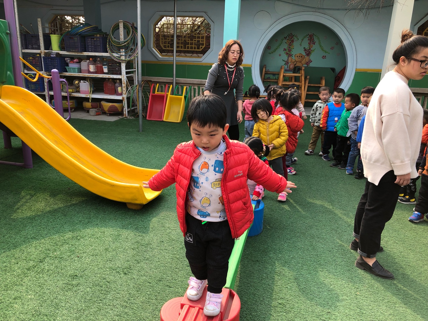 相片描述:户外活动走平衡木