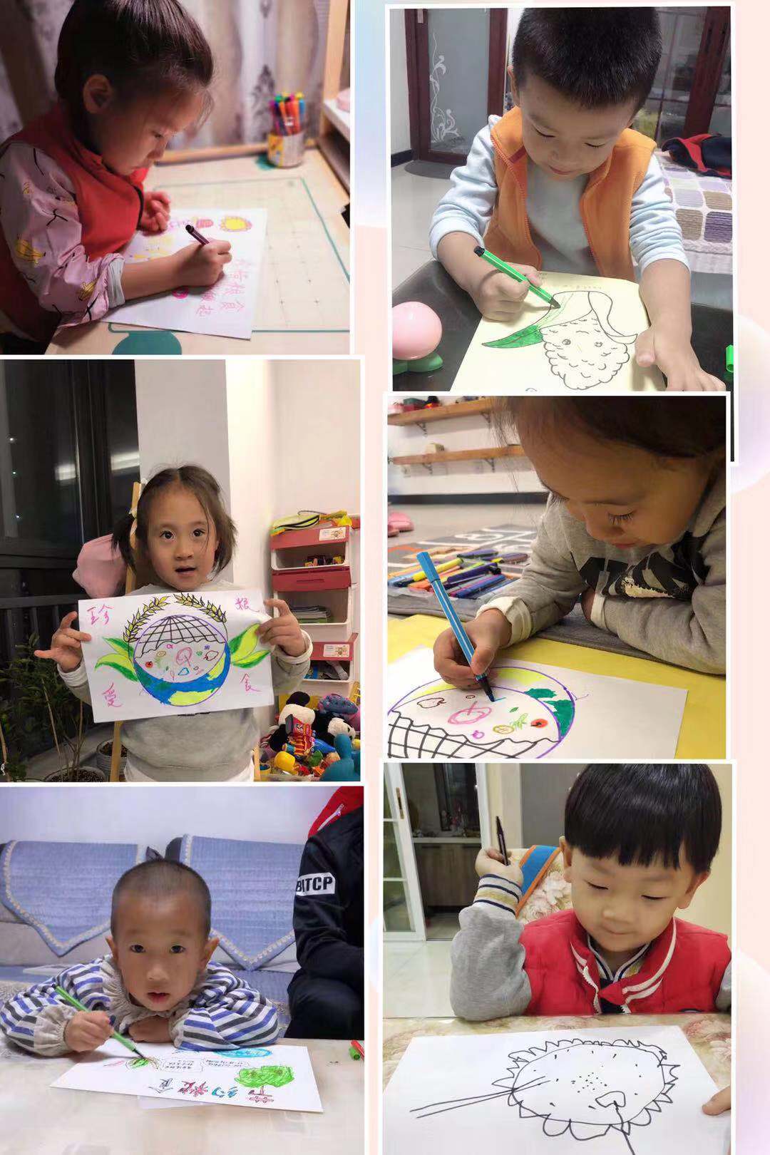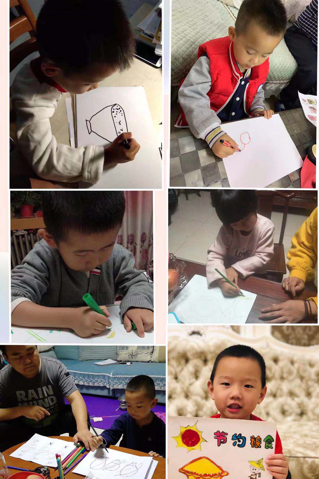 活动二:利用晚上时间,亲子一同制作了各具特色的“爱惜粮食,从我做起”宣传画,带来幼儿园进行展示、讲解、宣传,提醒小朋友们每天都要节约粮食。