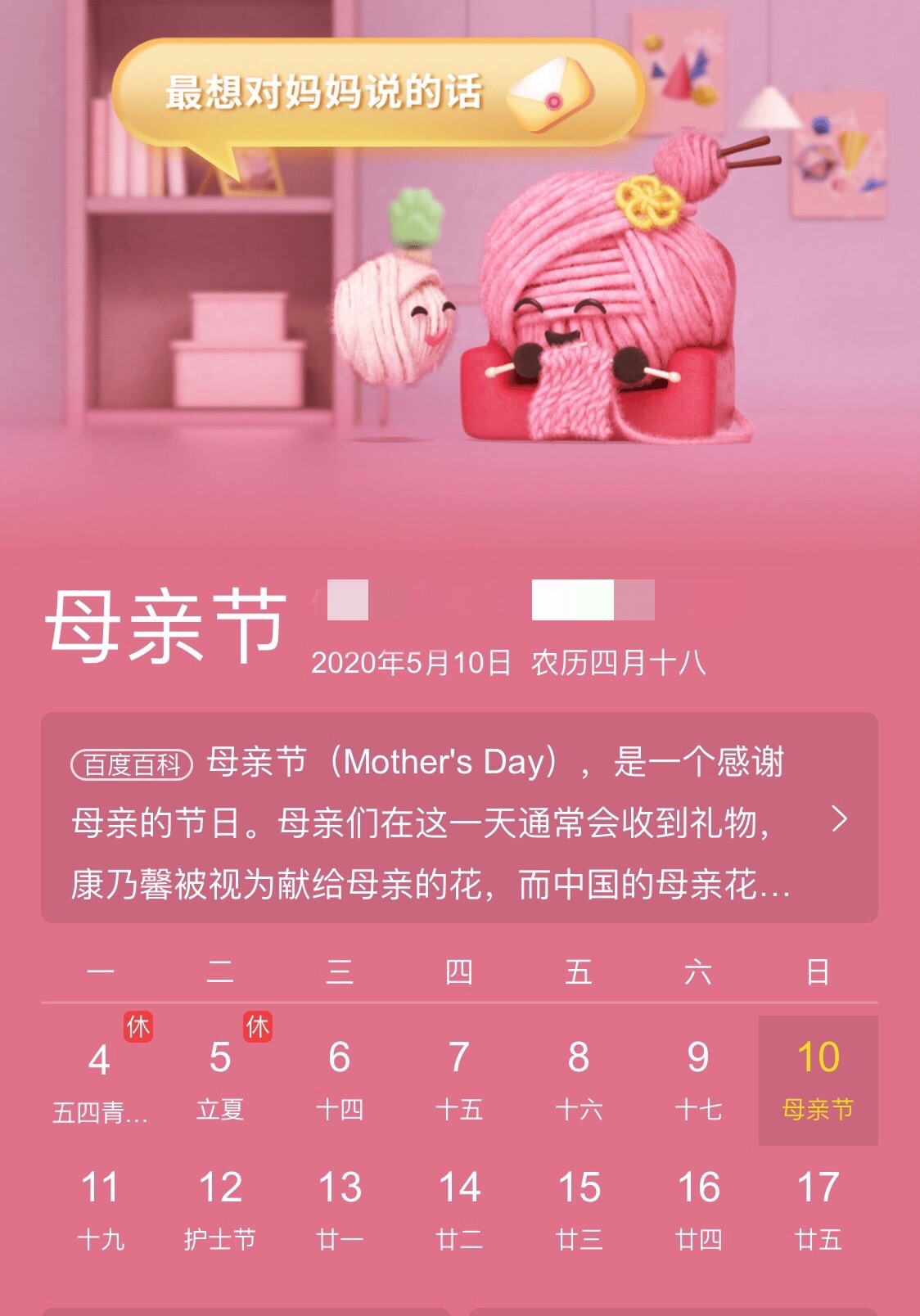 母亲节,是一个感谢母亲的节日。这个节日最早出现在古希腊;而现代的母亲节起源于美国,是每年5月的第二个星期日。今年的母亲节是5月10日。