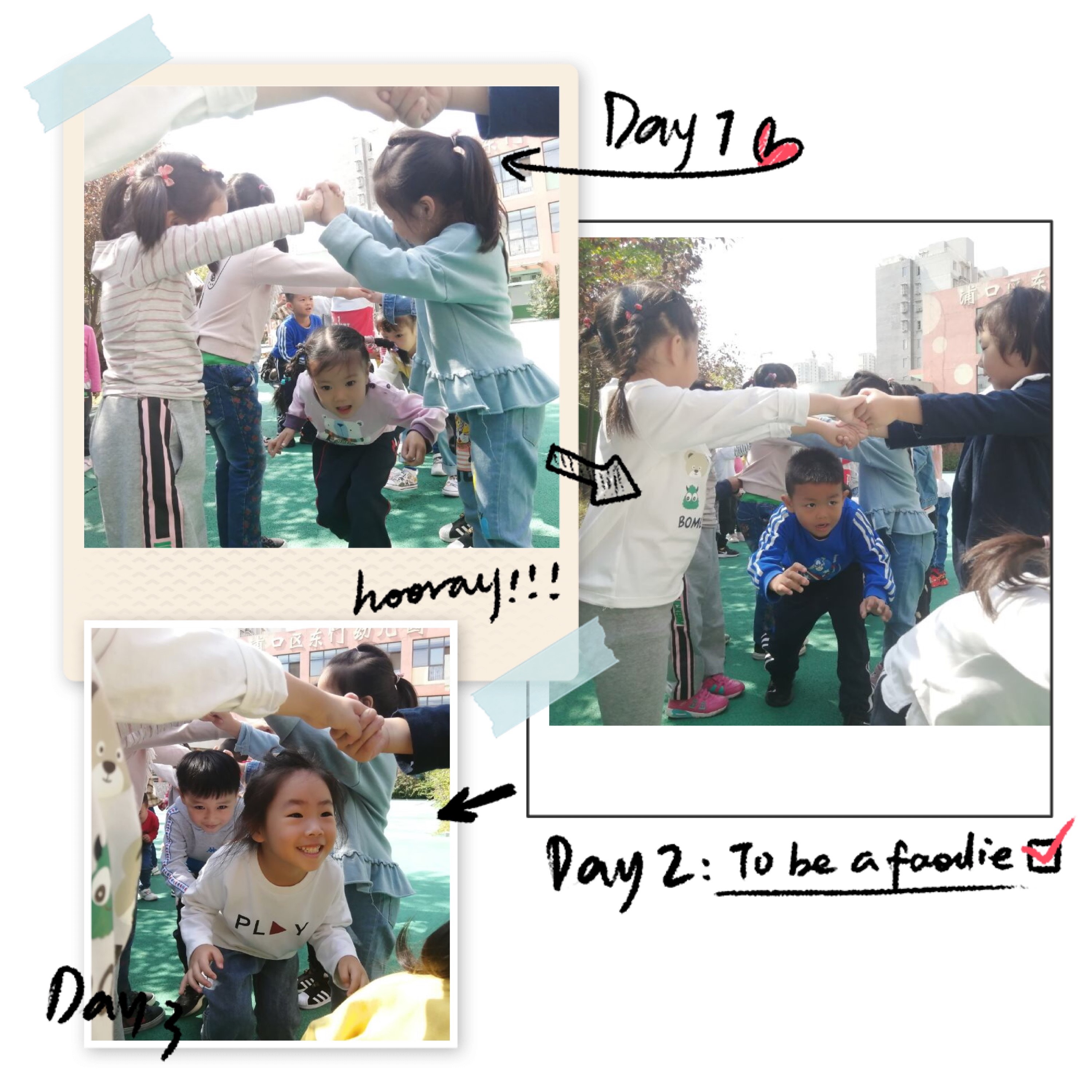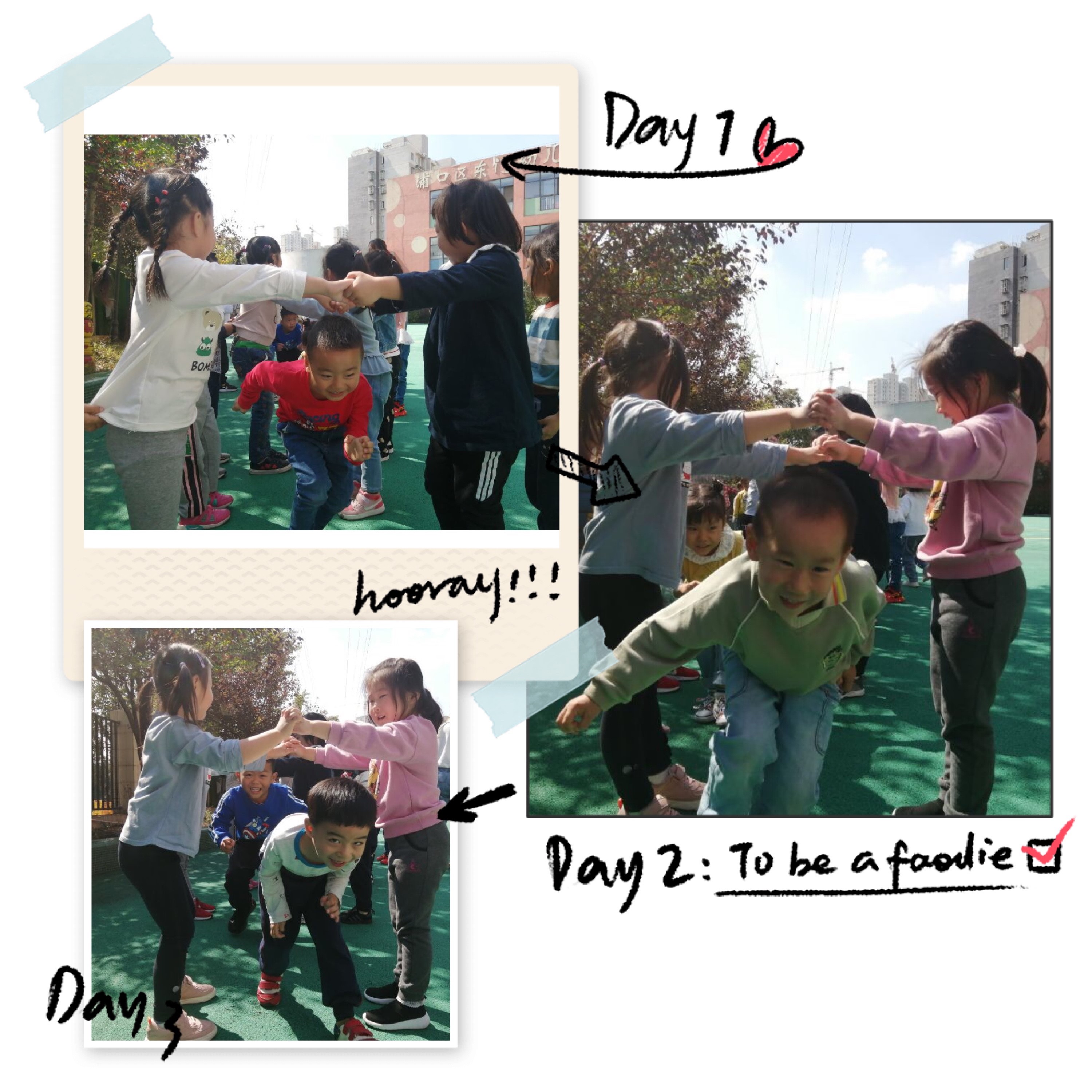 宝贝们双手开始搭起城门,宝贝们一个跟着一个走。
