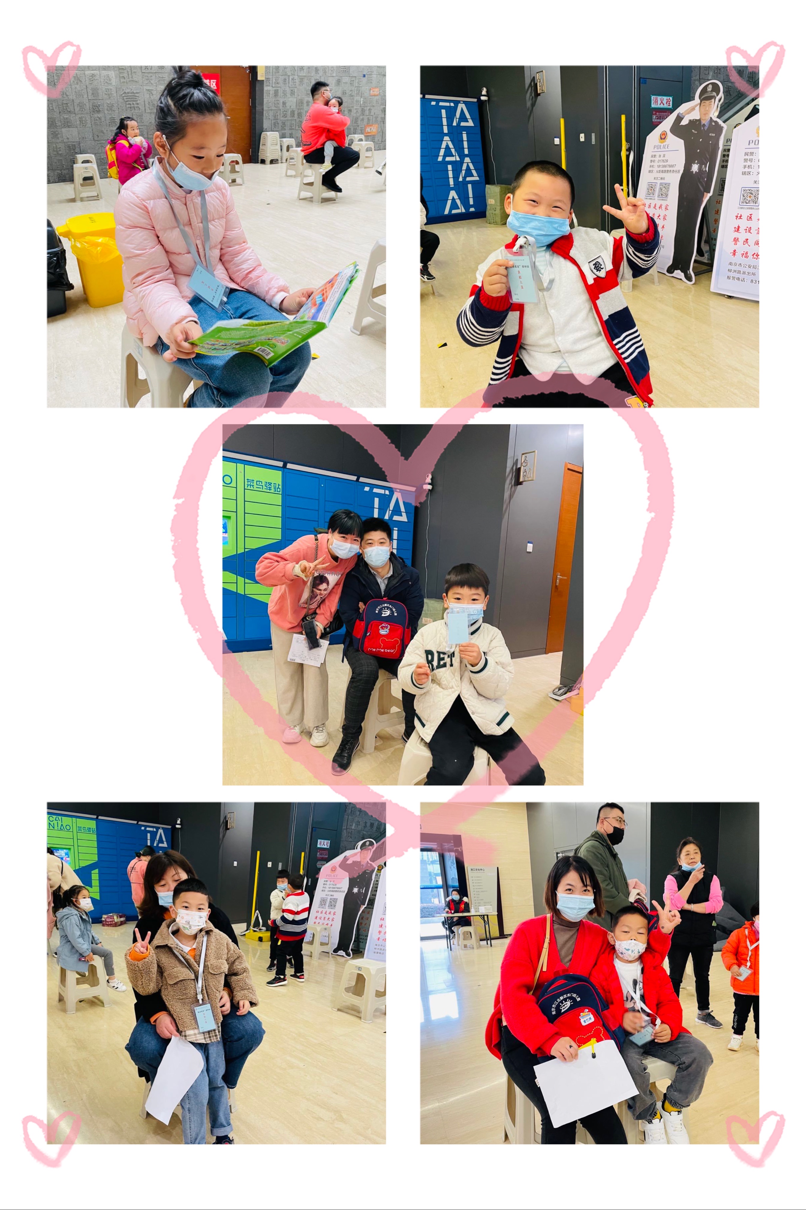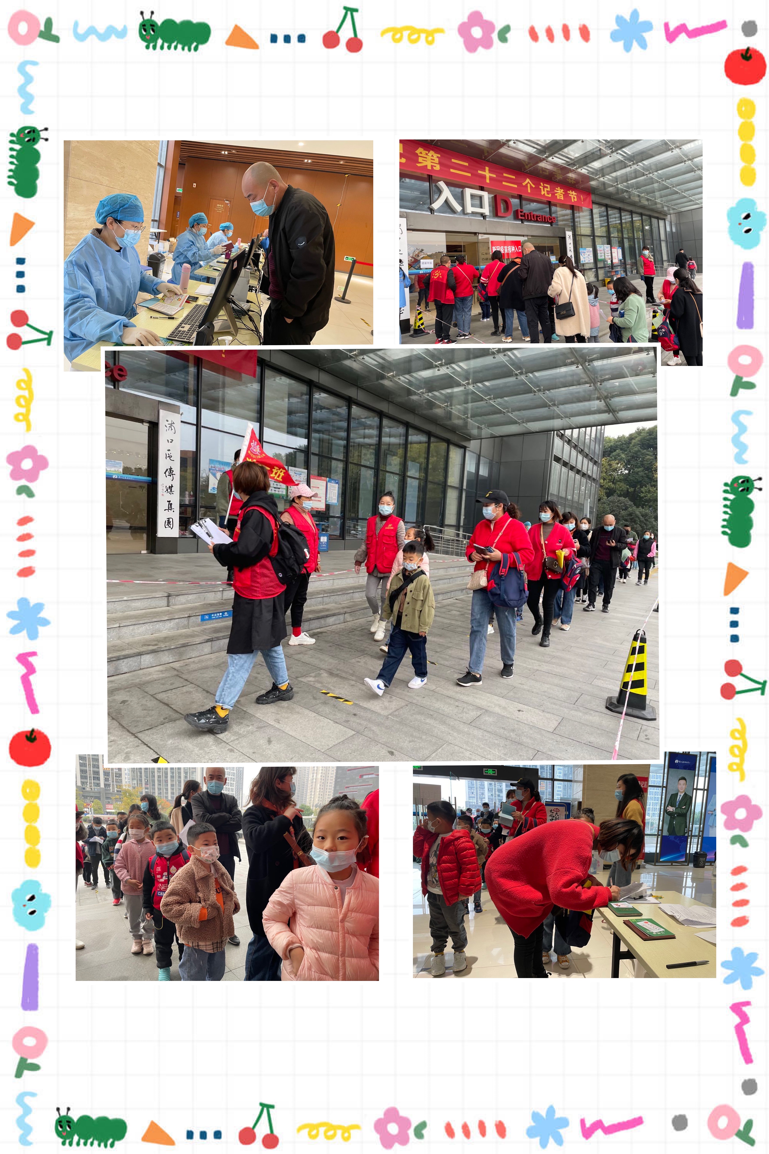 家长和孩子们在老师的带领下有序排队等候,入场登记疫苗接种信息。