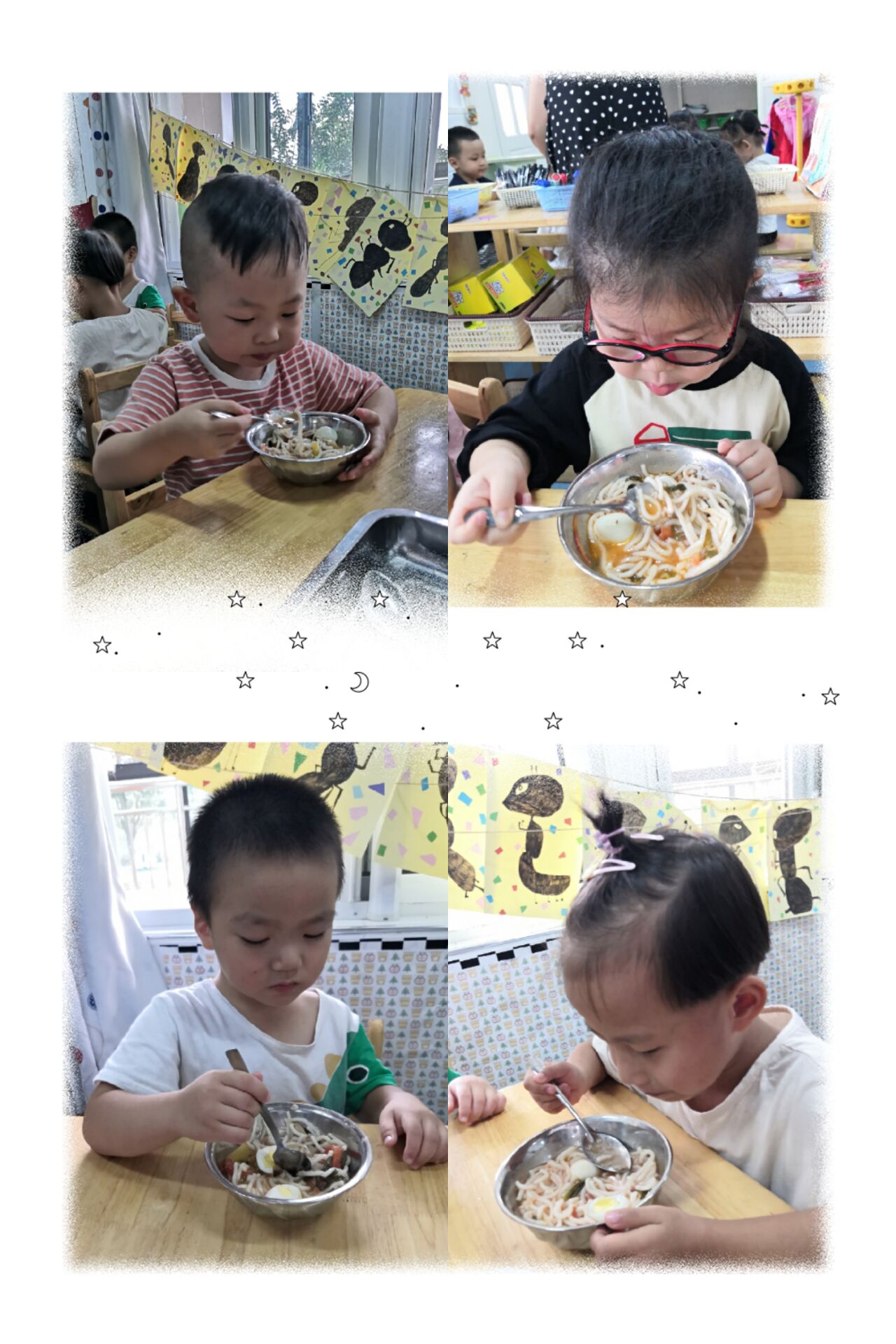 午餐时间到啦!可口的五彩面条让我们好满足呀!饭后要散步帮助我们消化哦!