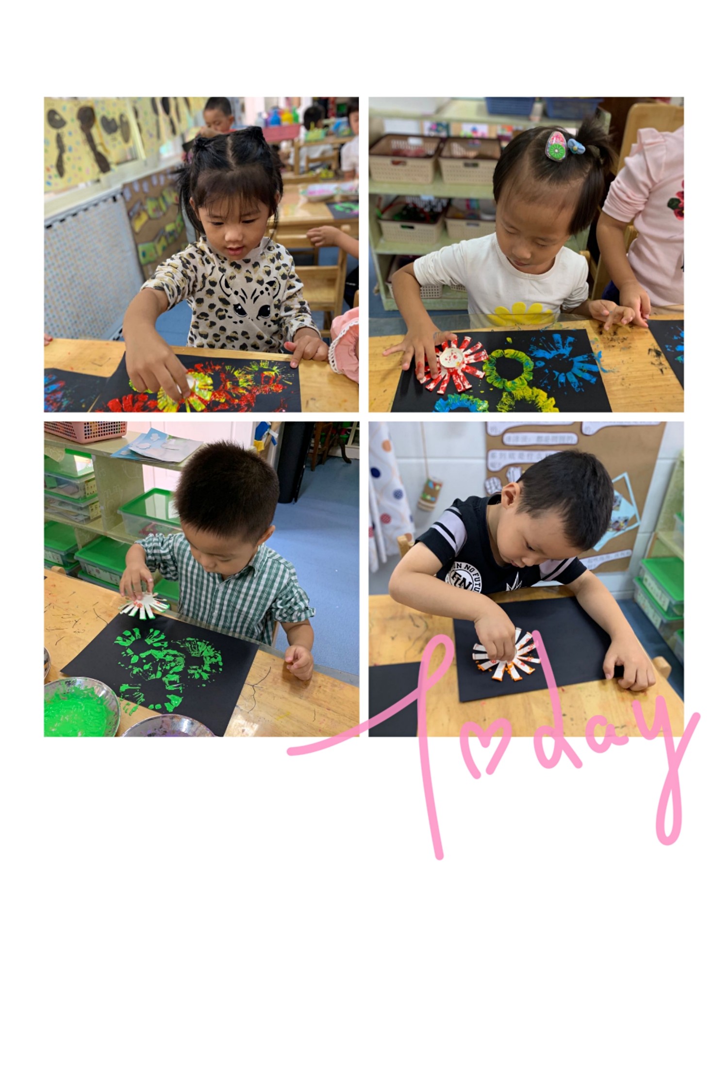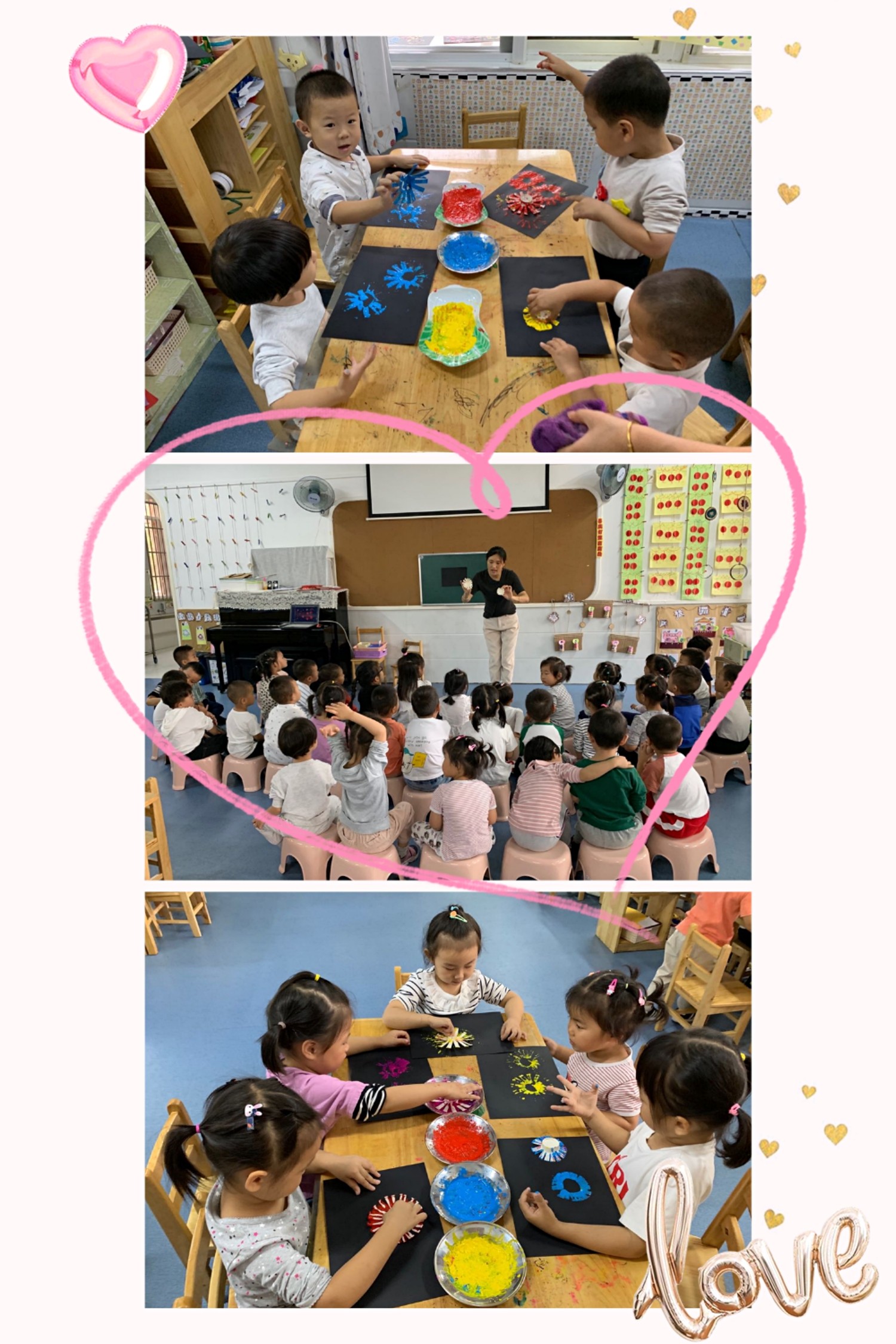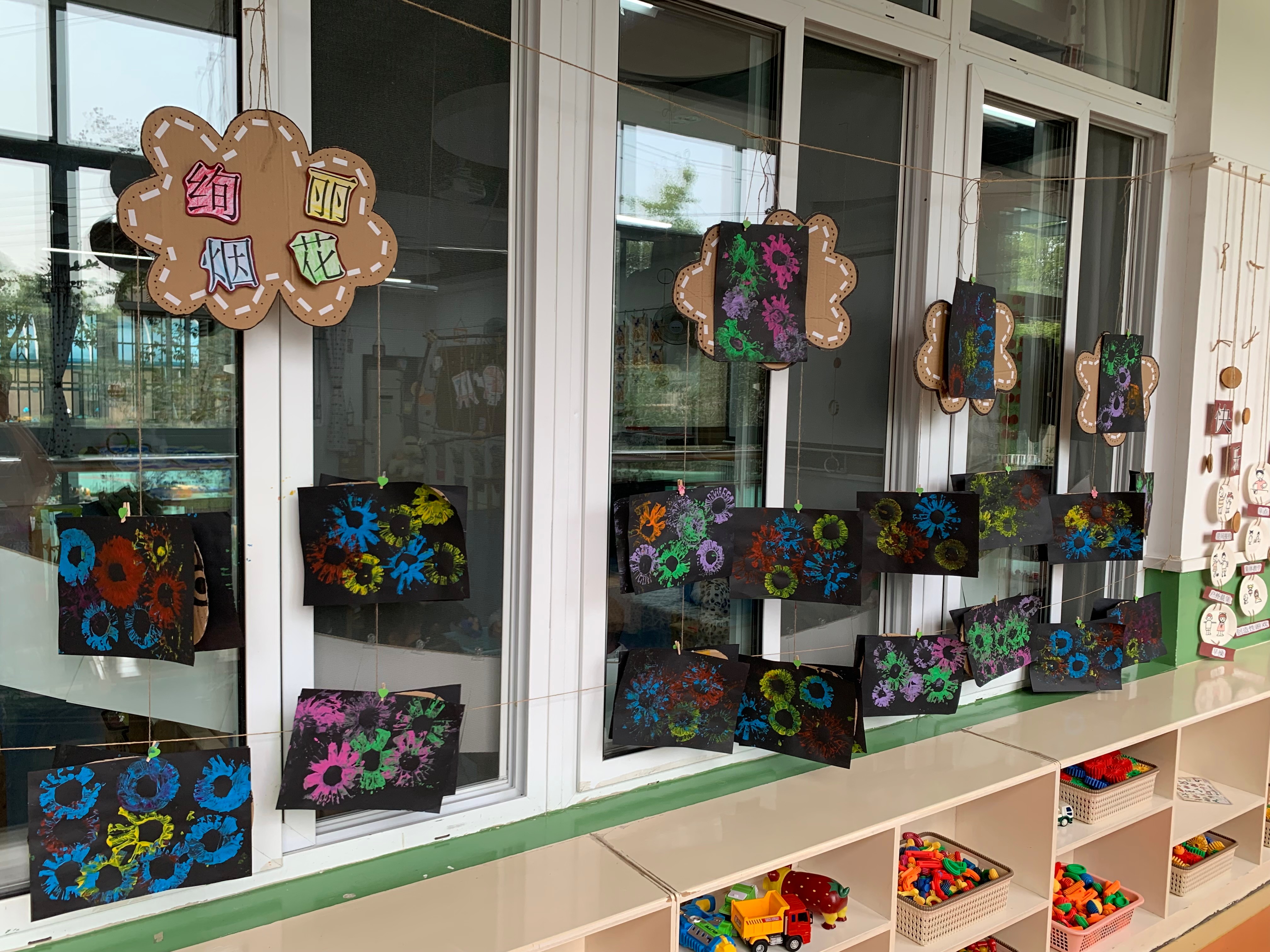 一颗颗五颜六色的火花飞升降落,时而如天女散花,时而如信号弹飞射,忽明忽暗,将夜幕点缀成鲜花的世界,这就是烟花的精彩。今天,我们把烟花带到了画卷之上,用不同种的色彩表现烟花的绚丽,用印画的形式表现出美丽的烟花。绽放美丽的烟花,祝祖国生日快乐!