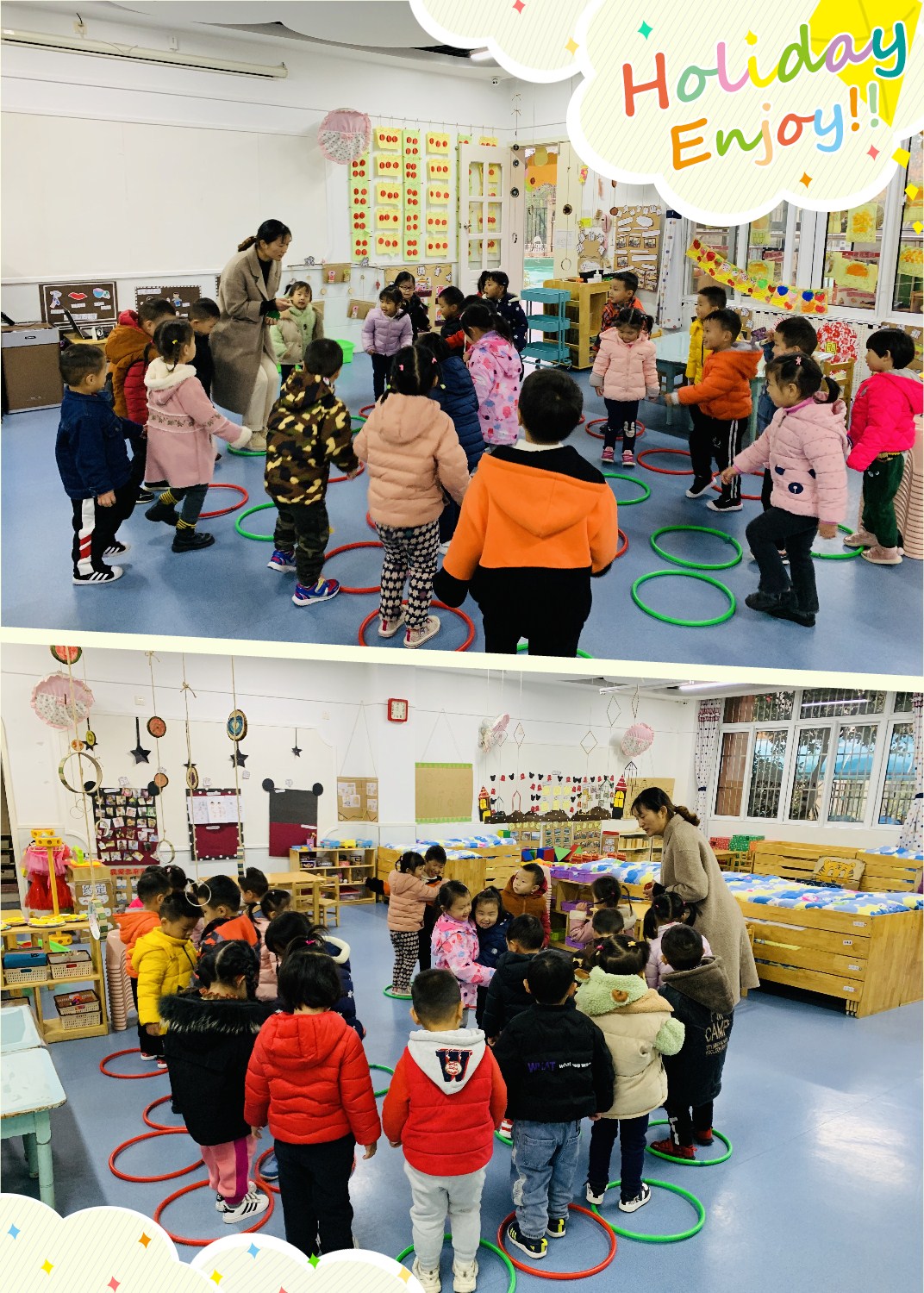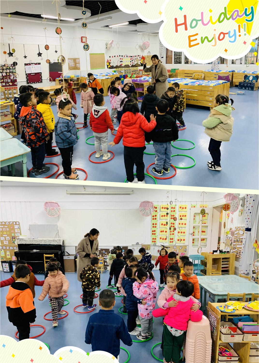 今天我们开展了音乐游戏《五彩圈》,在好听的音乐声中我们都变身成小鸡宝宝和鸡妈妈一起找虫子吃啦!我们会通过听、看信号,在音乐结束后迅速找到相应颜色的家找到虫子吃呢,瞧!我们在游戏呢,好开心呀!