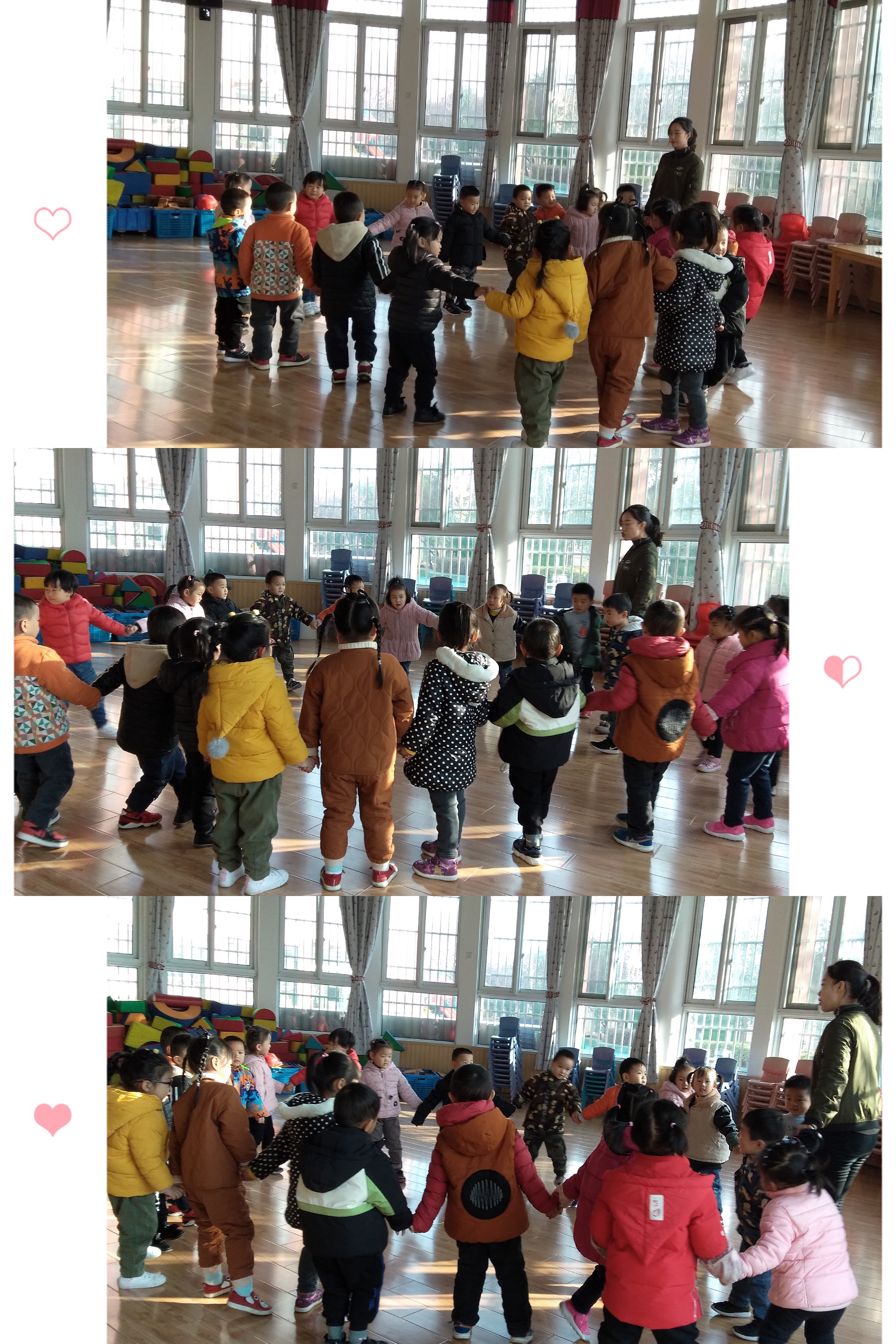 今天开展了一节音乐游戏:《圆圈舞》。活动中,幼儿能够手拉手拉成大圆圈,分别按照顺时针、逆时针的方式旋转,能在间奏中寻找朋友,在圆圈上进行舞蹈。情绪欢乐,学习积极性高,兴趣浓厚。