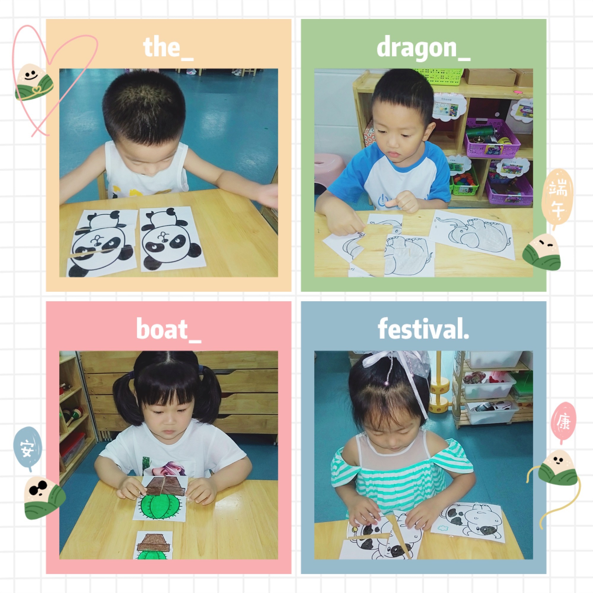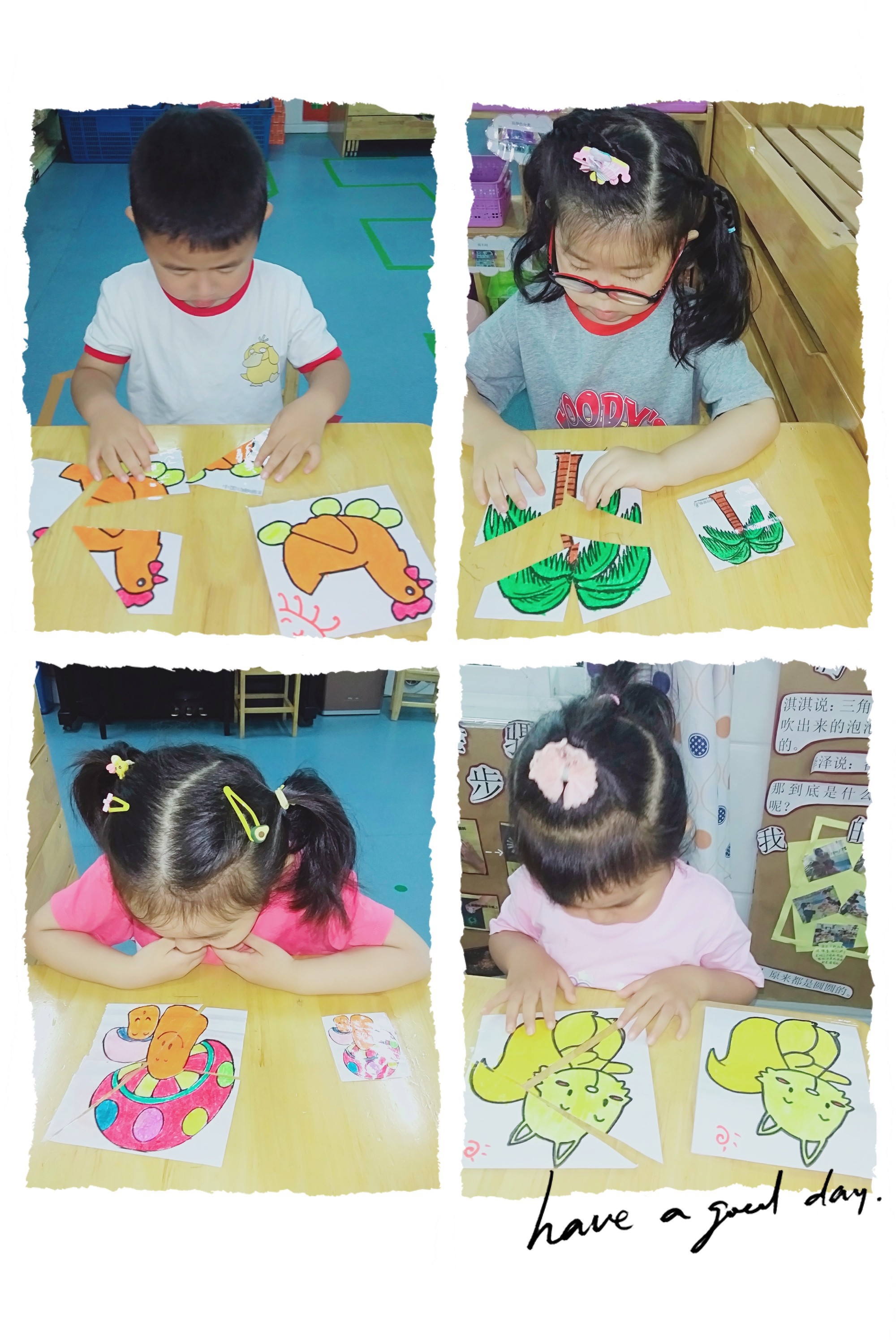 接着,孩子们用各种不同的图形玩起了拼图游戏,玩得不亦乐乎。看,我们玩得多认真啊!