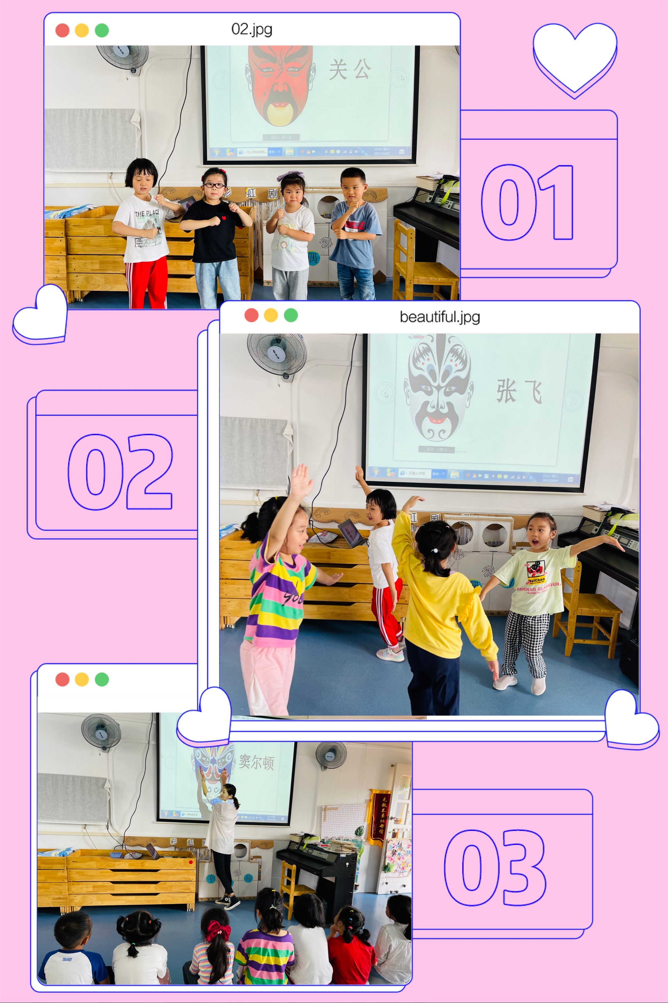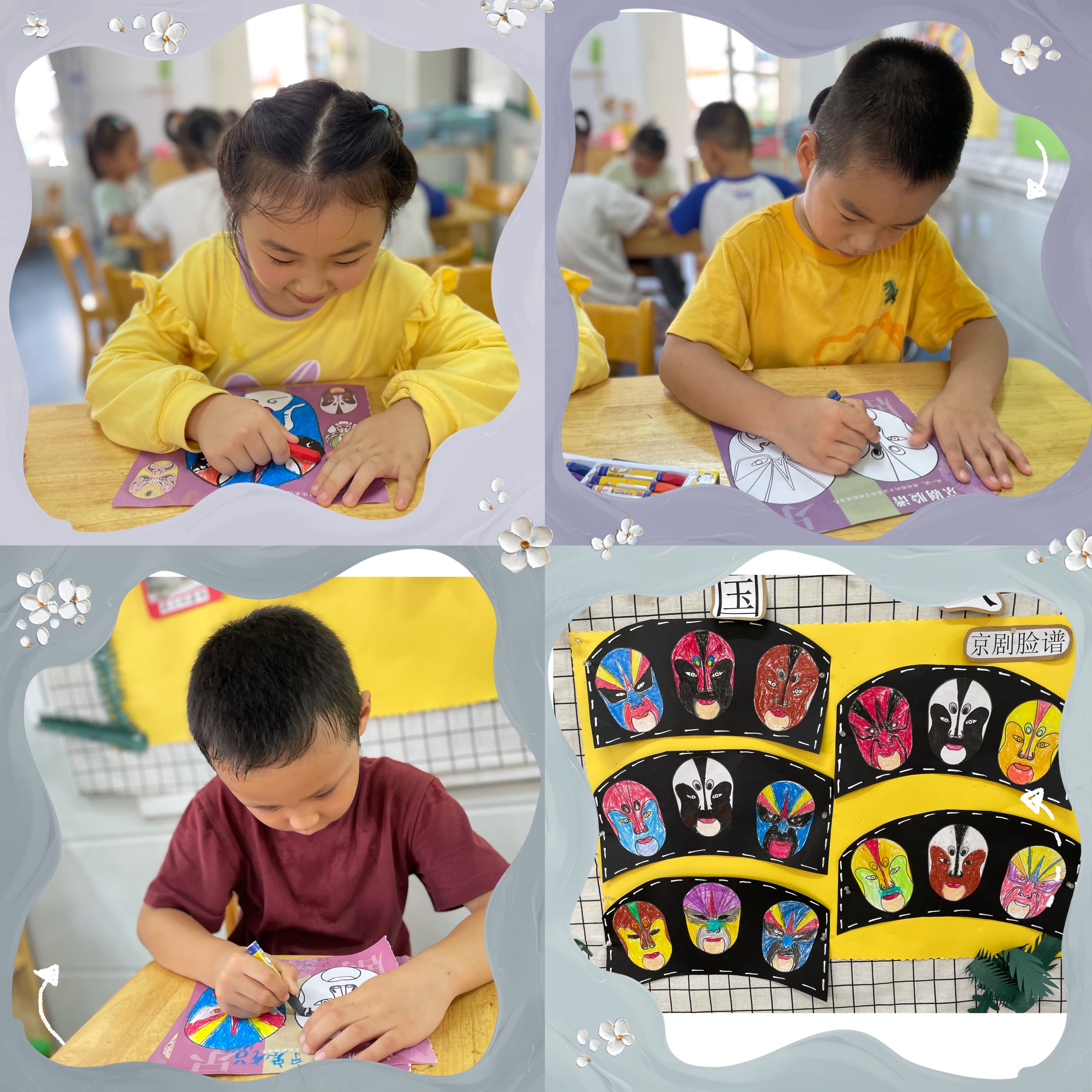 京剧是我国的国粹艺术,有着悠久的历史,其内涵非常丰富。京剧脸谱、服饰、唱腔都非常有特点,其鲜艳的色彩,夸张的形象,有一定功夫的动作,都深深地吸引着孩子们的目光,今天我们班的小朋友们就制作了属于自己的京剧脸谱,让我们一起跟随他们的脚步走进戏剧,走进中国传统艺术。