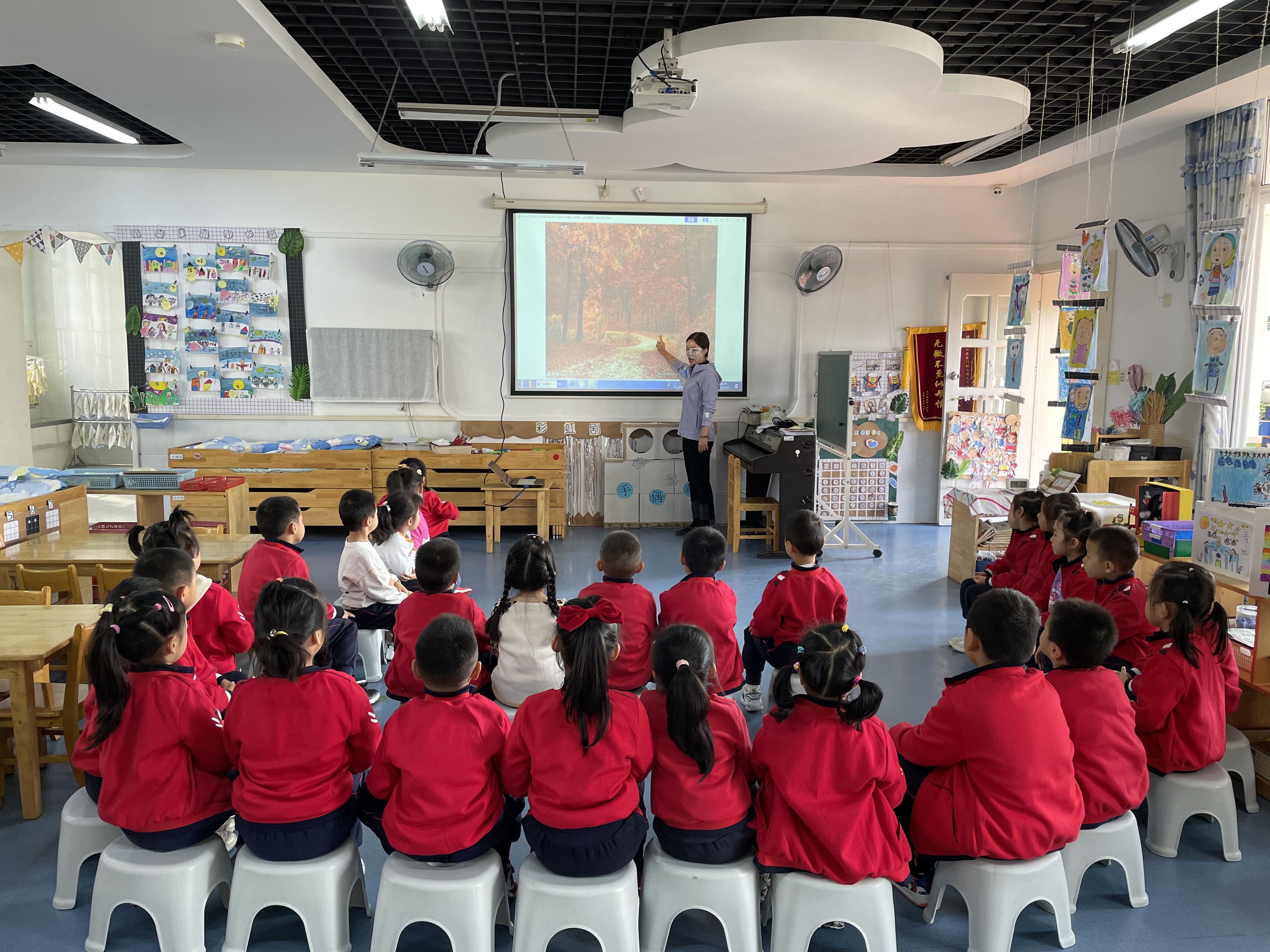 创作之前,老师先请小朋友说一说“秋天有什么变化?树叶是什么颜色的?变黄之后会怎样?”孩子们争抢着回答自己眼中秋天的样子,然后老师又请小朋友们欣赏了秋天的树林美景,为幼儿作画做好了充足的准备。