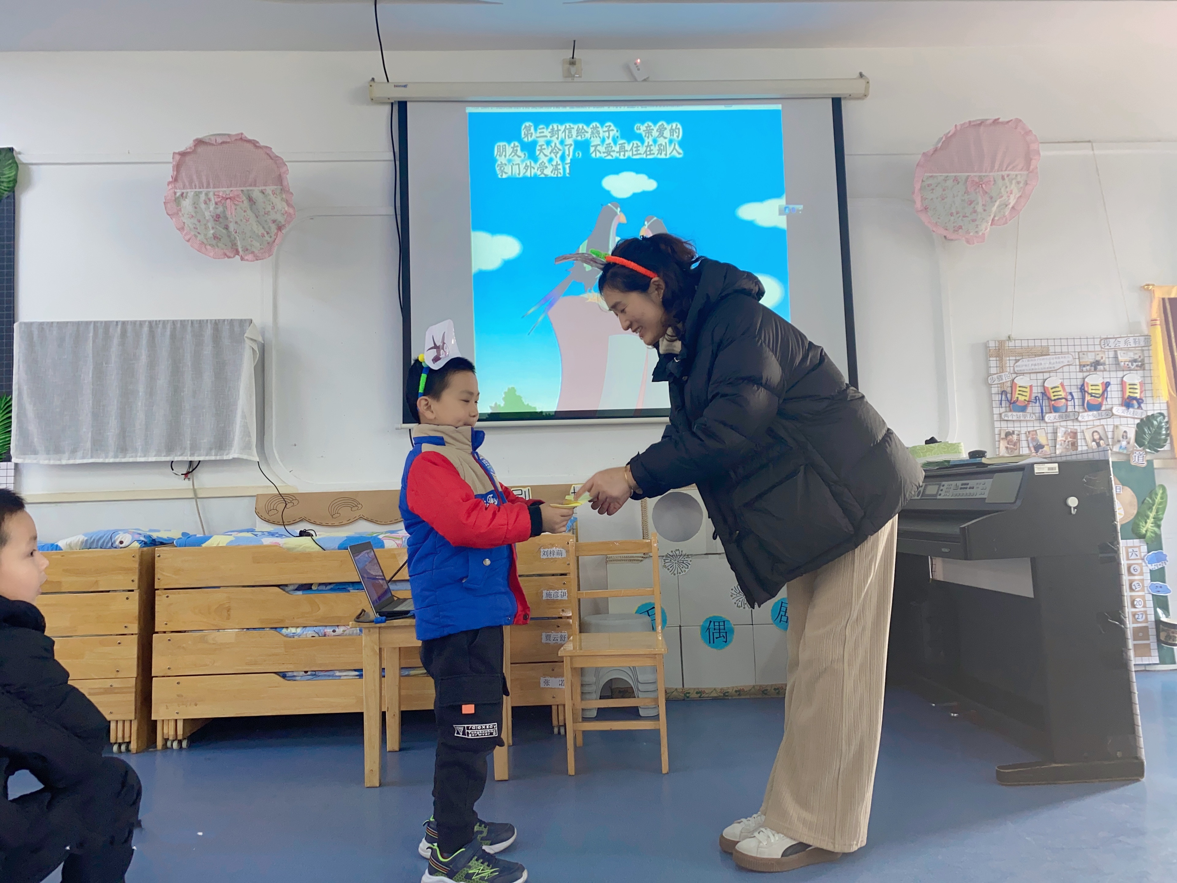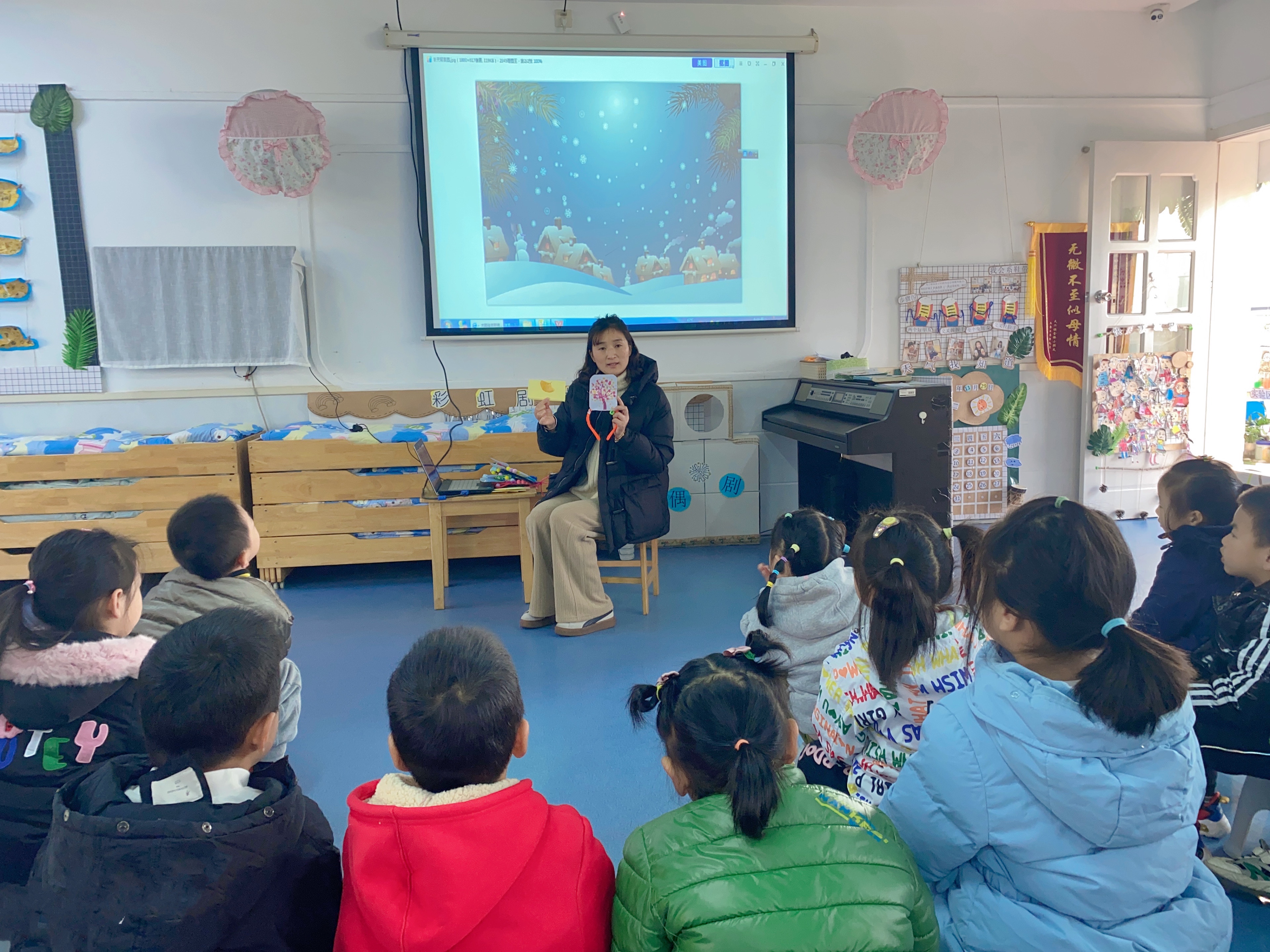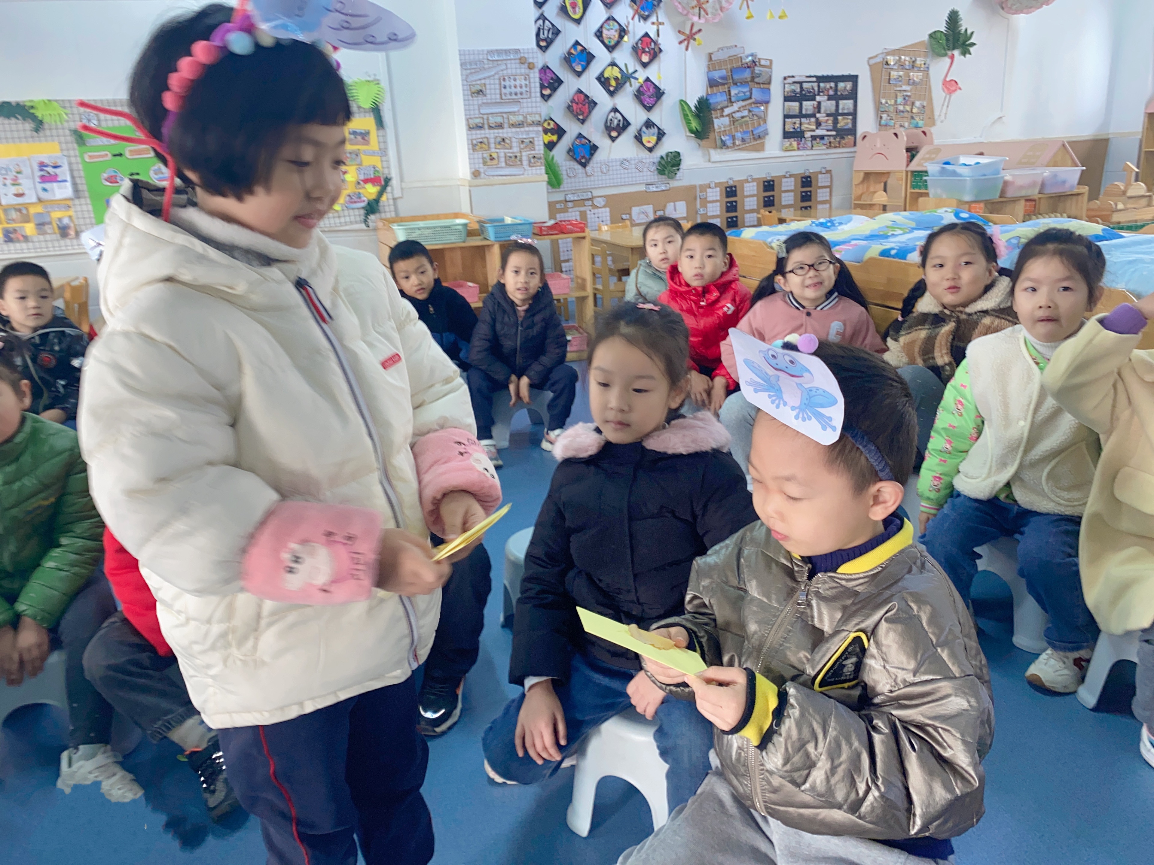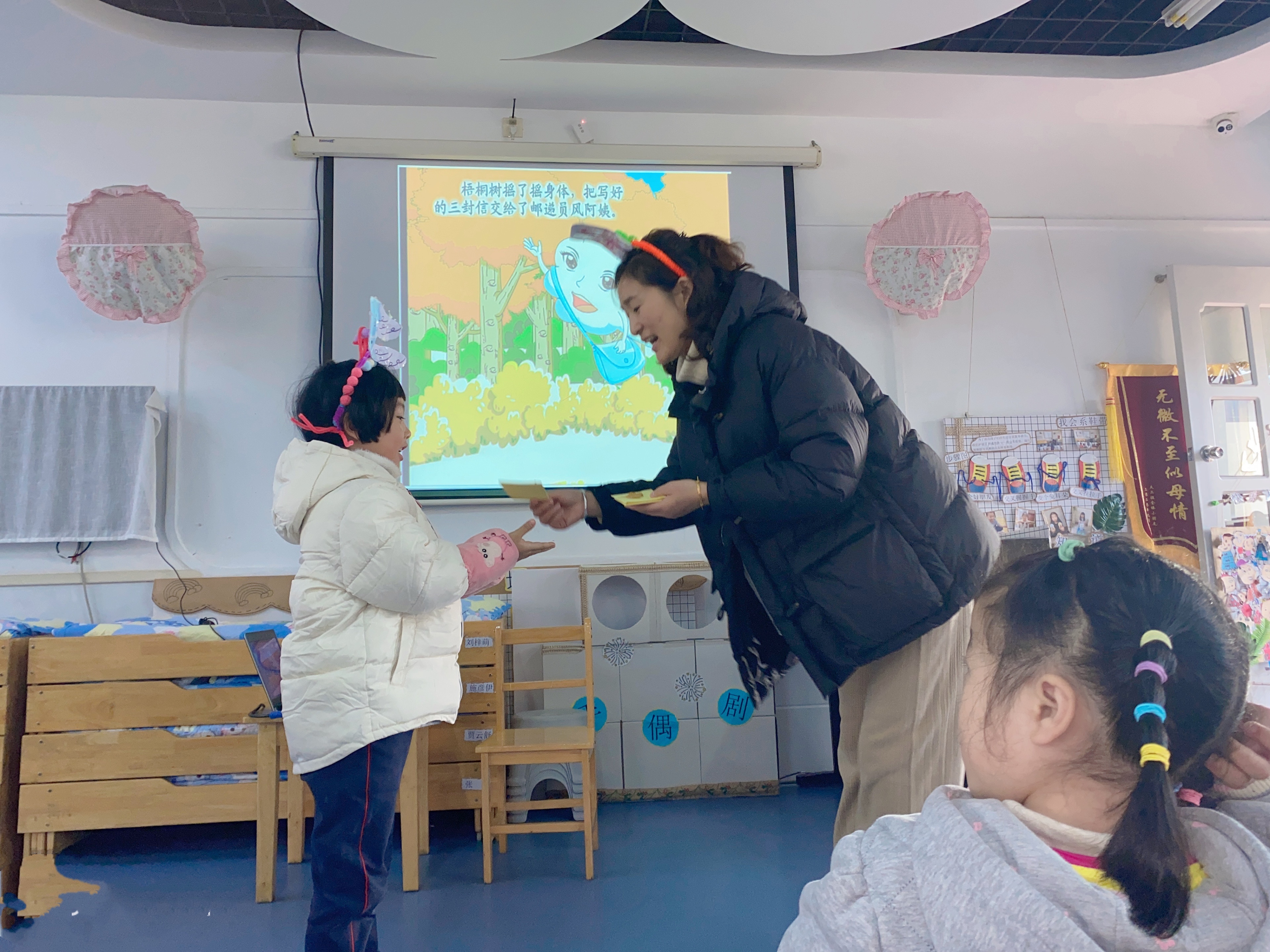 今天我们开展了语言故事活动《梧桐树寄信》,这是一篇短小、反映不同的植物怎样过冬的科学小故事,故事中弥漫这温馨、情绪盎然的气氛,梧桐树寄出了三份信暗含着小动物过冬的方式,同时包含着关心同伴的情感,故事生动、形象,深为小朋友喜爱!