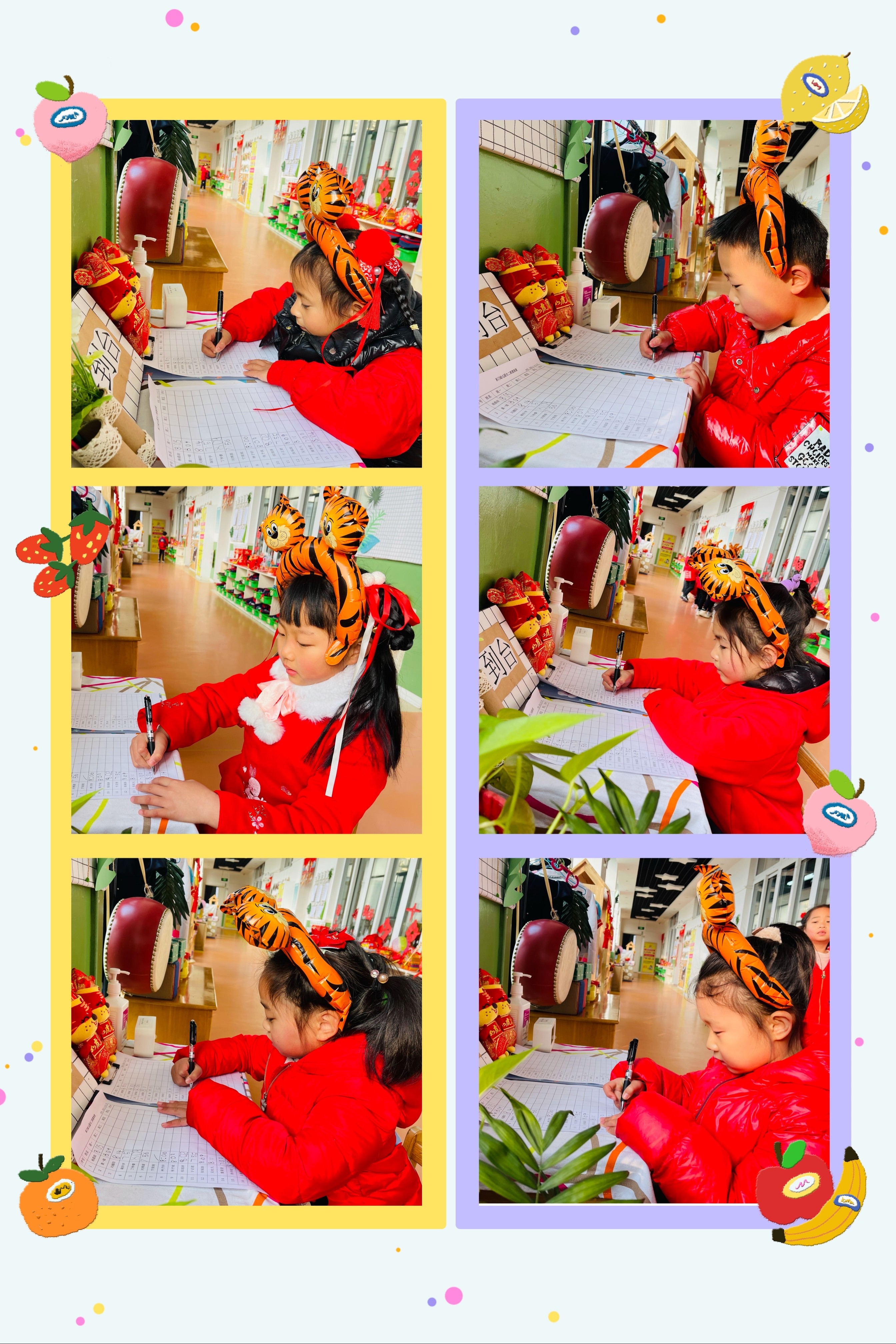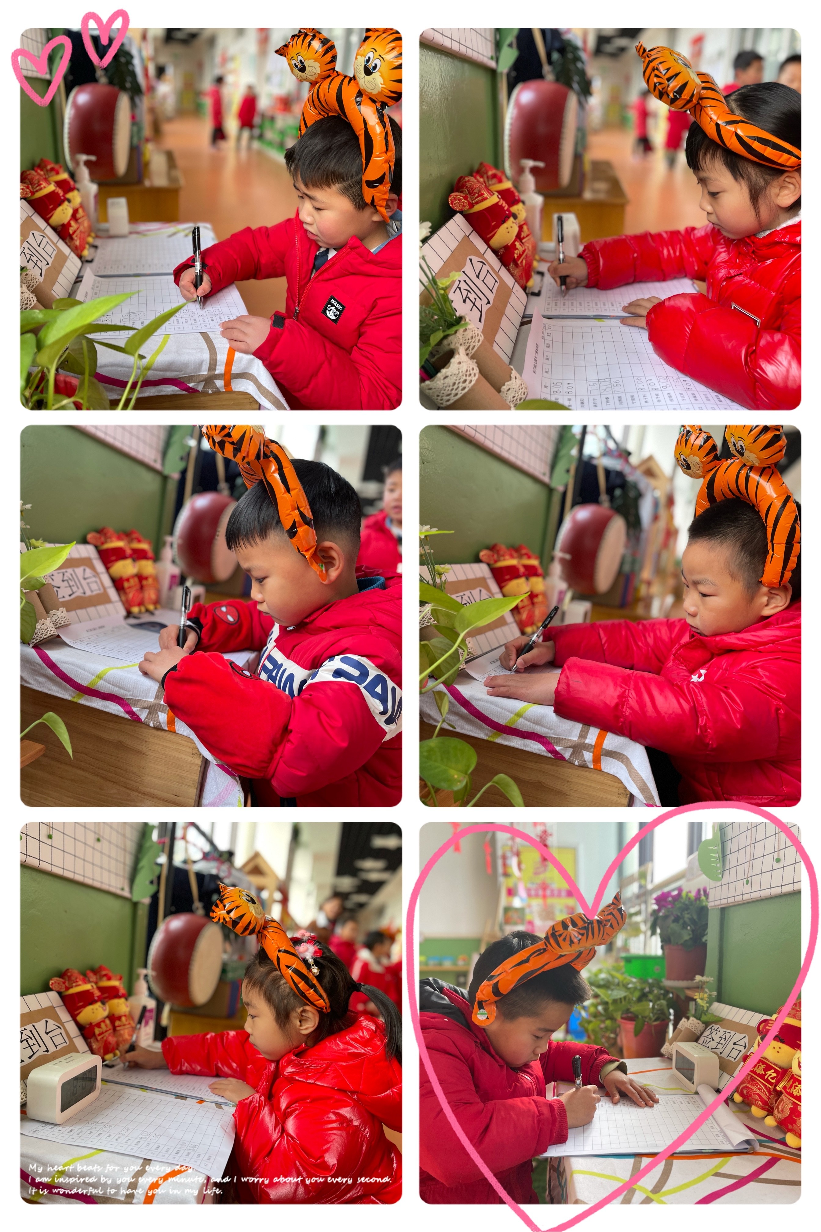 来到班级,孩子们戴上小老虎的头饰认真地签到呢!