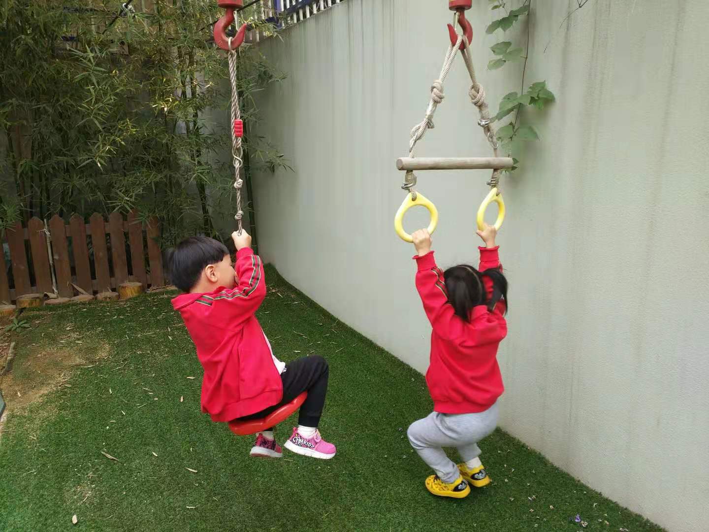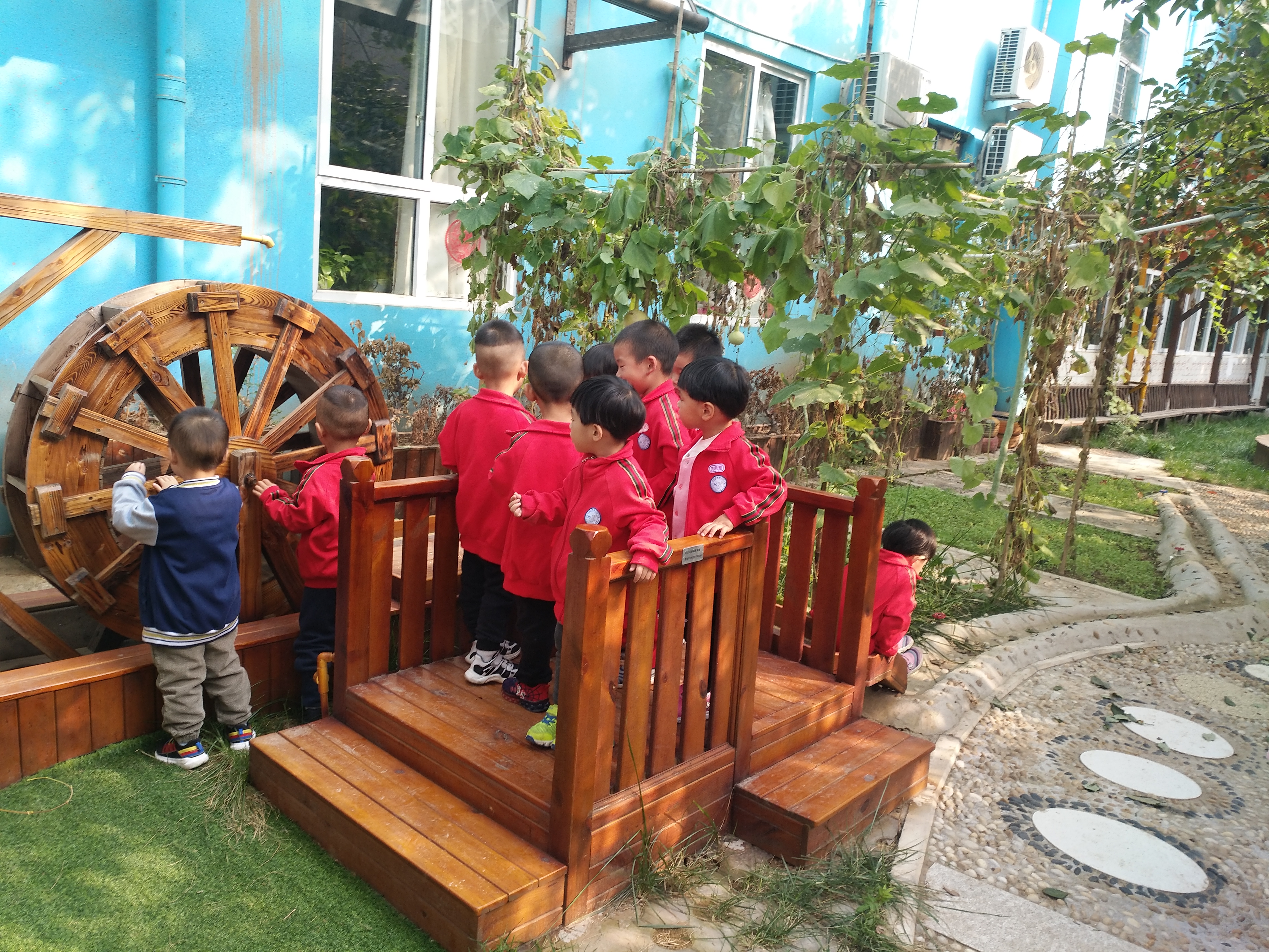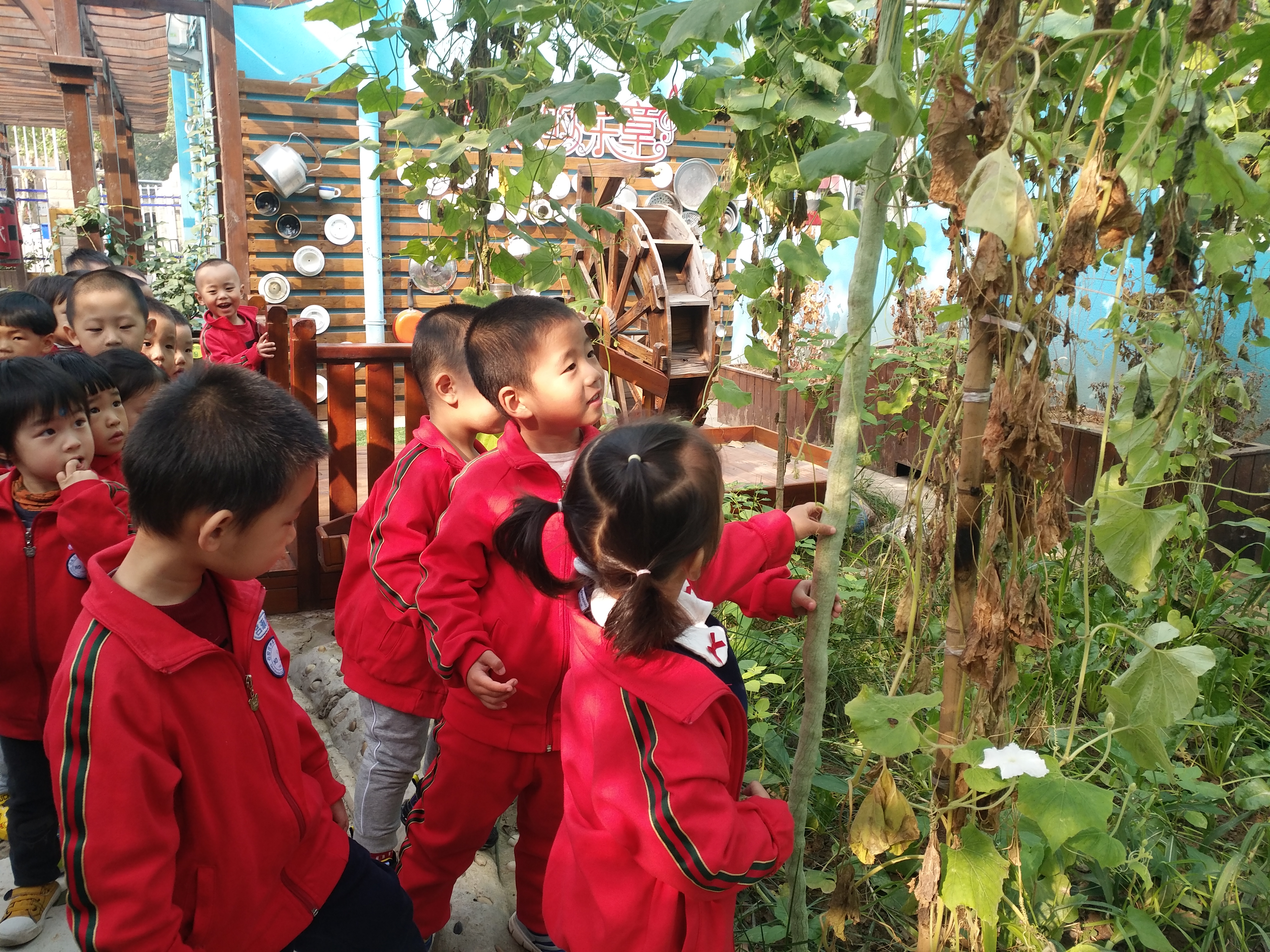 10月23日(周三)上午,迎着初冬的暖阳,老师带领苗二班的孩子们游览了二幼初园。 走入初园,孩子们兴奋不已,首先进去入眼帘的是藤架上长长的蛇豆和大大的葫芦,胆大的男孩子不由自主的伸手去摸一摸长长的蛇豆,而胆小一点的小女生却不敢伸手去摸,只是远远的看着,嘴里说:“哇,好长啊”。这时小伊甯大喊:“快看,树上有好多果子”,孩子们闻声抬头望去,随之迎合着!一旁的梁老师笑着说:“那是黑枣,熟了就可以吃了”。随之孩子们又被柿子树上红红的小柿子所吸引。 再往前走孩子们好像发现了新大陆,看到了索道,争先恐后的都想去玩一玩,平日里看着胆小的孩子今日也敢尝试着乘坐索道,真的好勇敢。此时,孩子们的笑声和欢呼声让整个初园充满了生机和活力!池塘里喜欢安静的小鱼再也不敢浮出水面…… 在返回的途中孩子们又被水车和墙上的一些瓷器和厨具所吸引,没想到它们还能发出好听的声音,奏出美丽的乐章,真是太棒了……最后孩子们依依不舍的离开了这里!