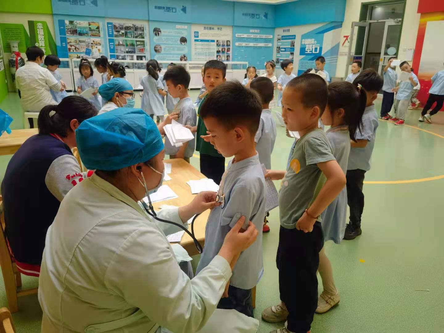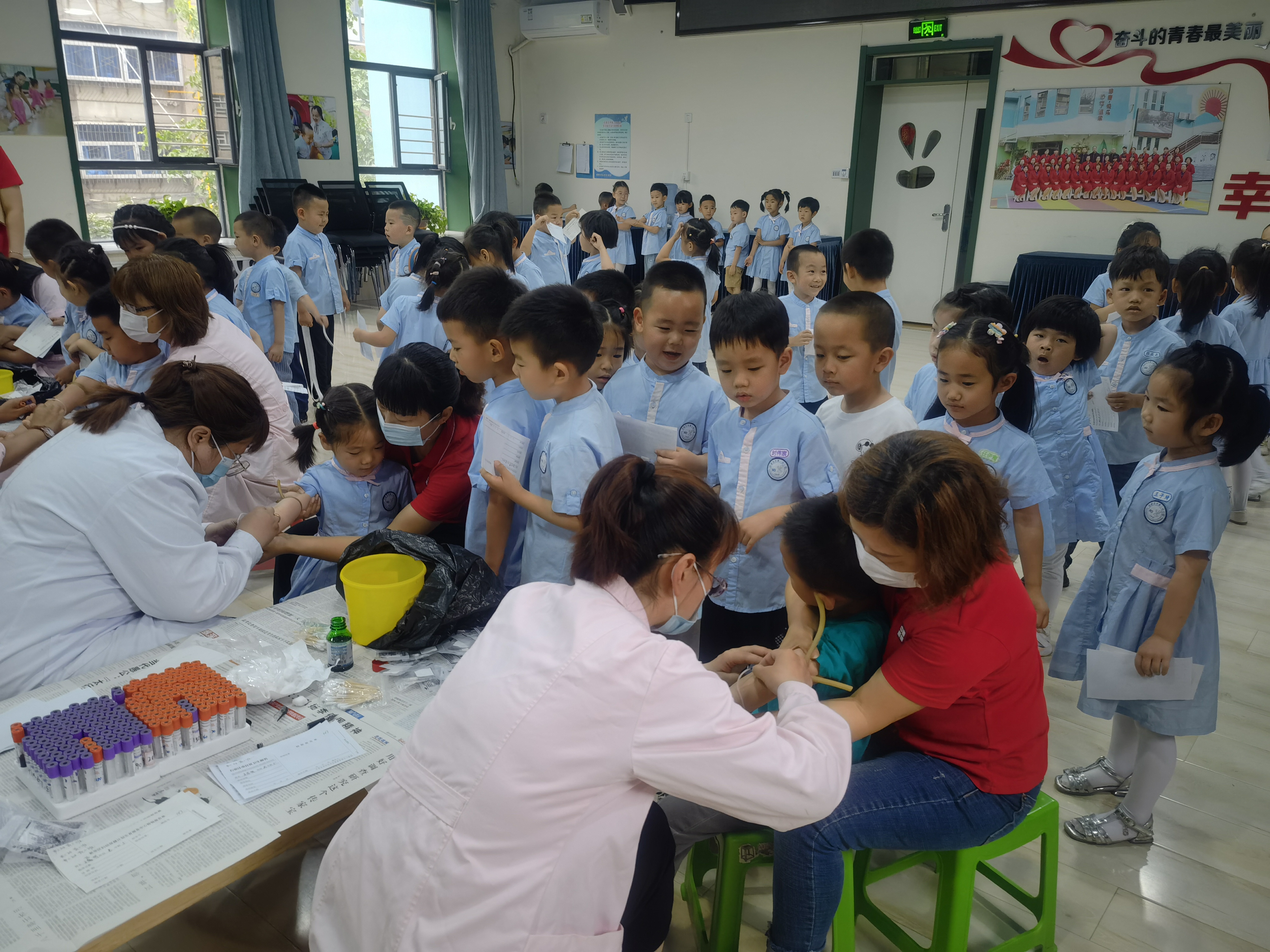关注幼儿健康是每个家庭,学校及社会的一件大事,一年一度的幼儿健康体检活动,可以及时了解幼儿的身体健康状况,确保了孩子们的健康成长,为幼儿园正常有序的工作奠定了基础。 为了更好的了解幼儿生长发育状况,为幼儿的健康成长、疾病预防提供有效依据,保障幼儿健康成长。2021年6月9日,幼儿园为孩子们进行了全面身体健康检查。 本次体检的项目有视力测查、测量身高、体重、心肺听诊、采血等。在幼儿园各科室老师的配合下,医生们认真、细致地给每个孩子做了全面检查。孩子们井然有序的排好队,积极配合医生,孩子们的表现得到了医生们的一致好评……快来看看宝贝们的精彩表现吧!