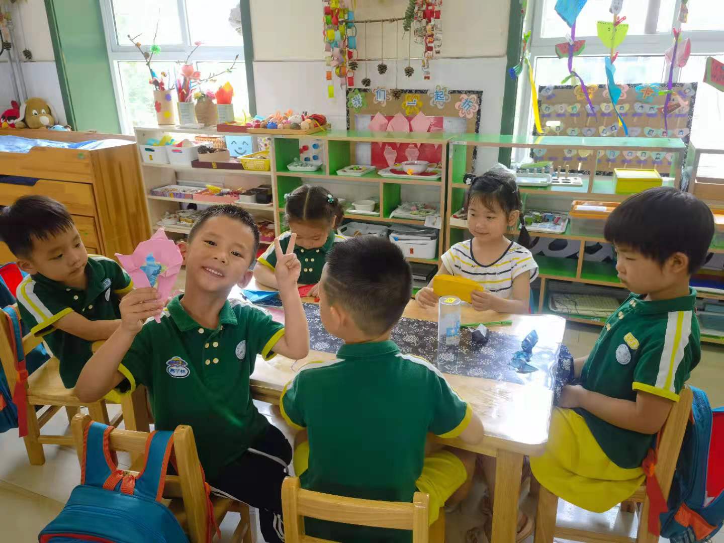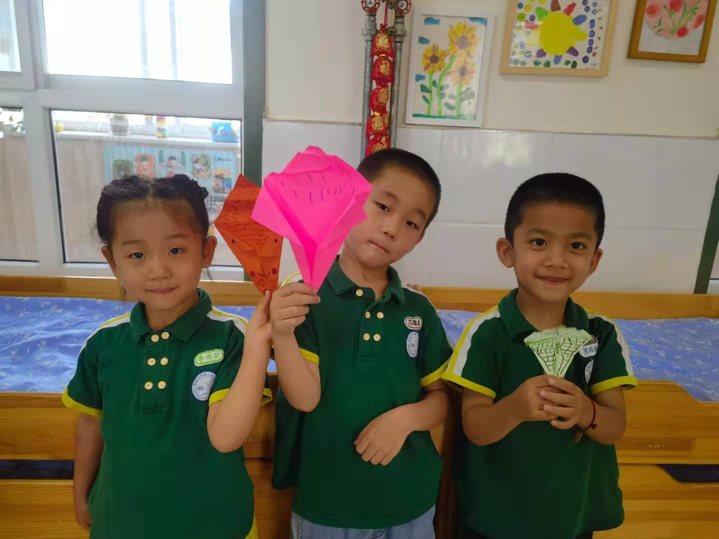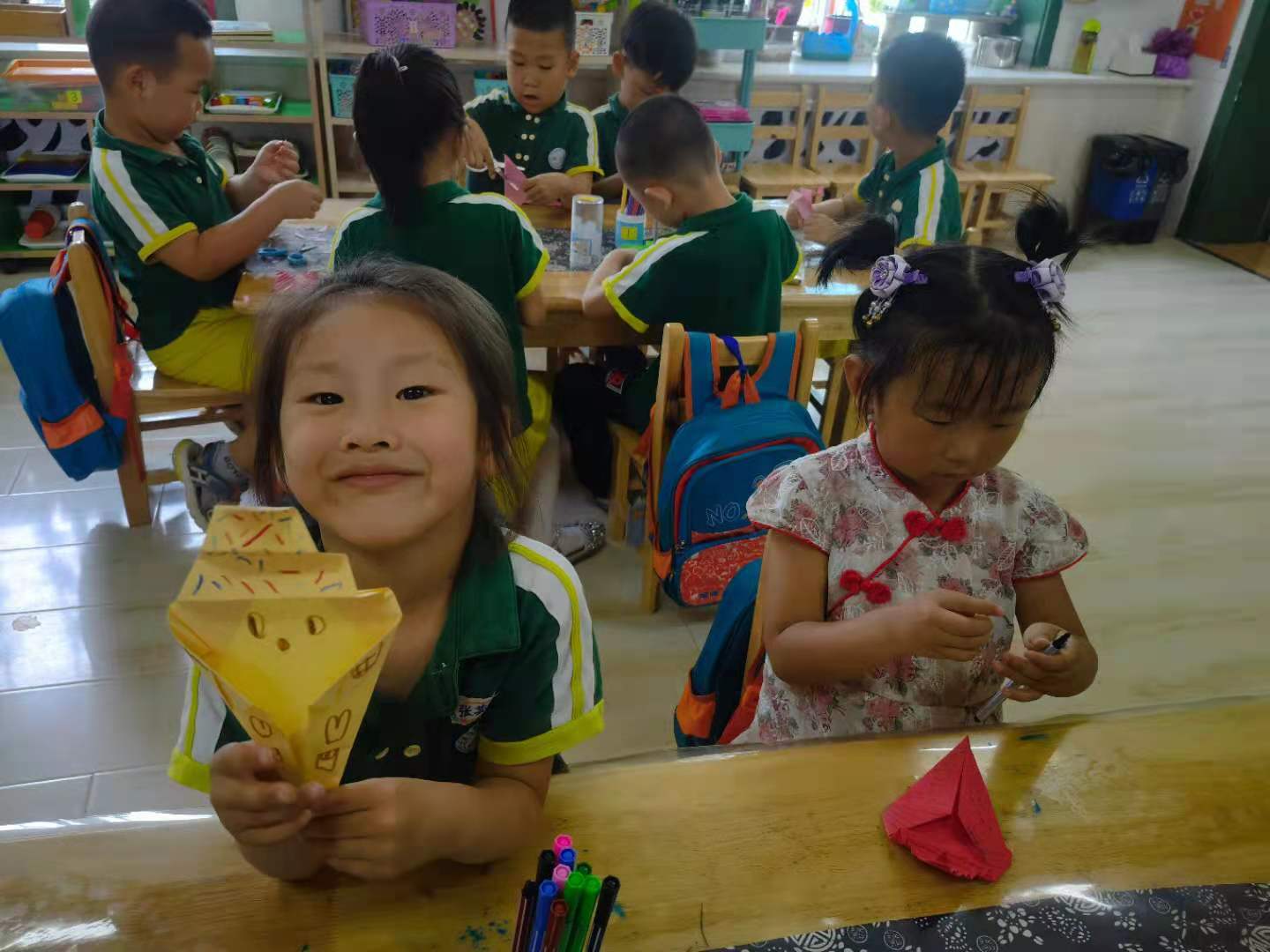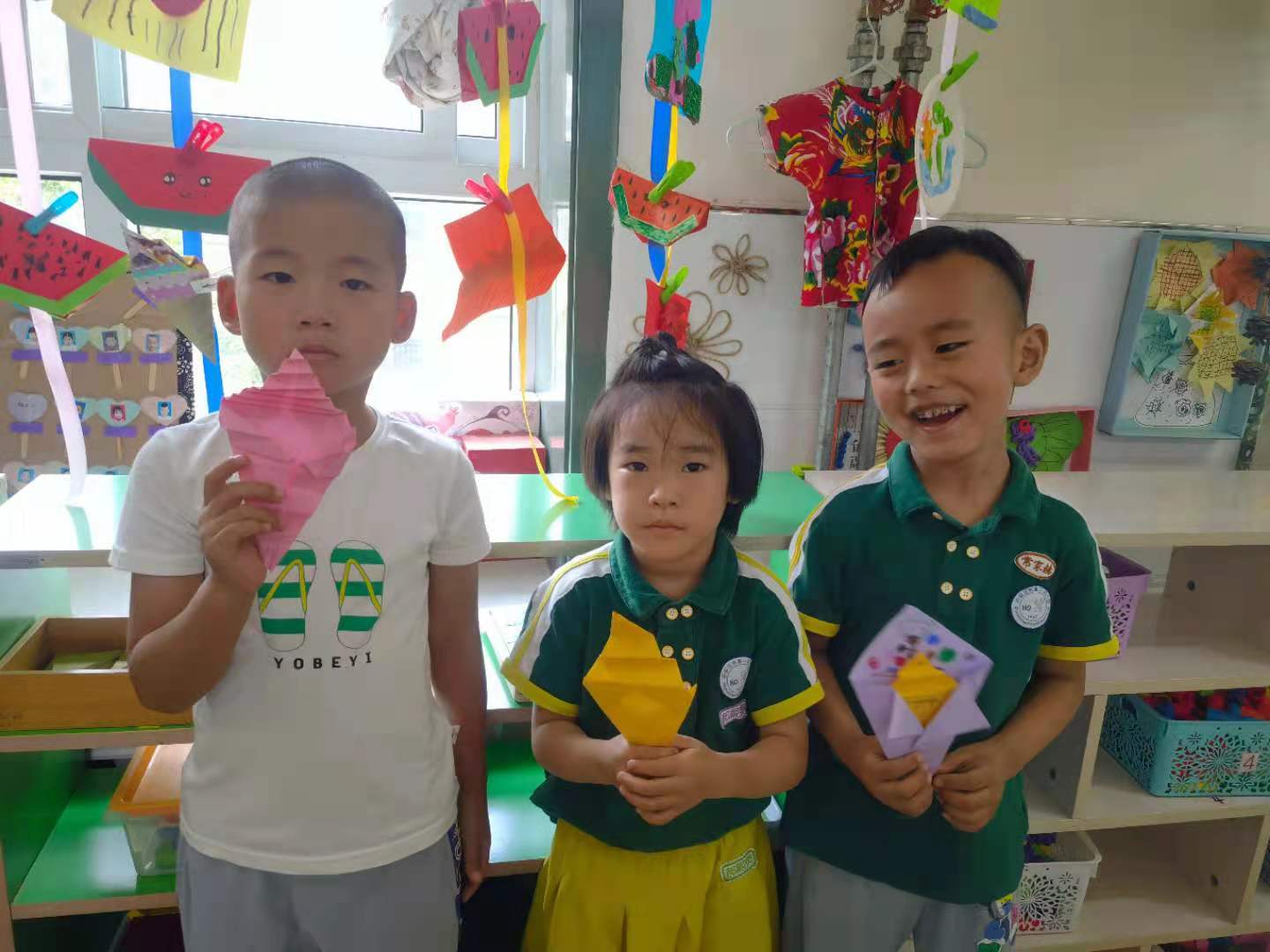 折纸是一种“寓教于乐”的智力游戏,它就如美幻的魔术,将一张纸在手中经过巧妙的折压、翻、粘贴、描绘等手段,变出一件件形象、夸张、富有趣味的作品,深受孩子们喜爱。在折纸过程中,孩子们手脑并用,观察能力、想象能力、审美能力和创造能力都得到了锻炼和提高。 在这个烈日炎炎的夏日最近班级孩子学习了折纸“冰淇淋”,冰淇淋是孩子们非常喜欢的一种甜食,就是那种带着棍或蛋筒,顶着冰奶油惹人直流口水的,美味的夏日首选食品。冰淇淋美丽的颜色也是孩子们喜欢它的另一个原因。正因如此孩子们在折纸的过程中,非常的认真,当个别幼儿遇到困难时能力强的幼儿会主动教他怎样折,看到他们互帮互助的样子,感到孩子们真的长大了。为了让冰淇淋更加的漂亮和好吃,孩子们又进行了创意装饰……瞧,我们折的冰淇淋漂亮吧!
