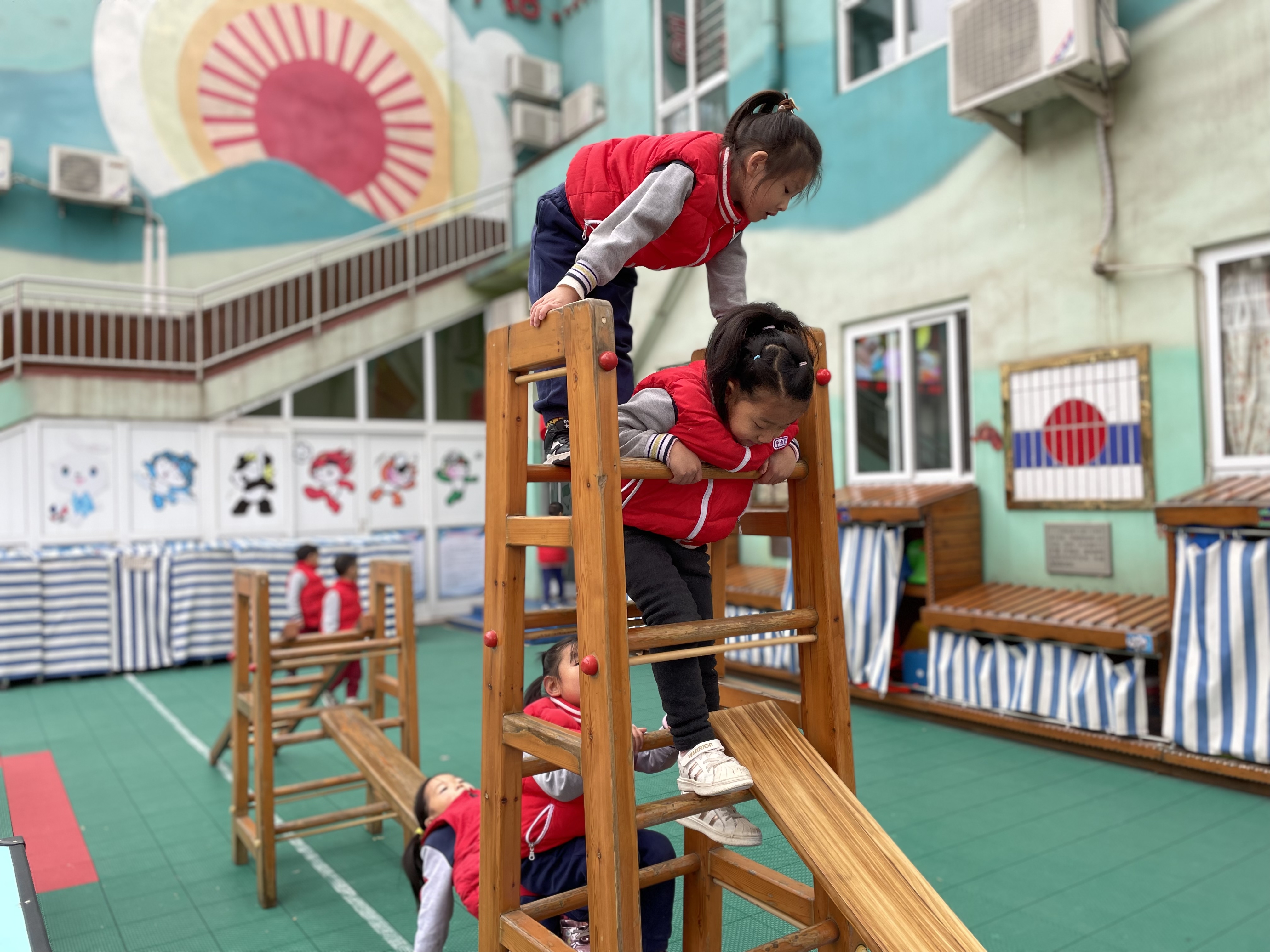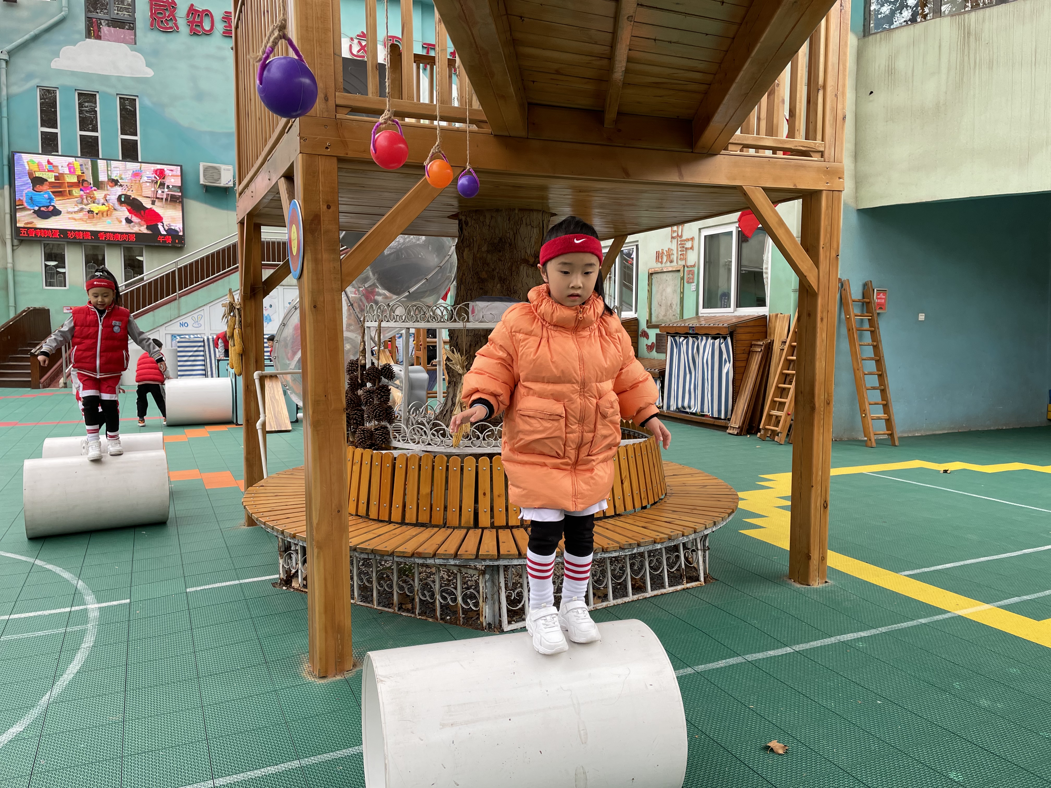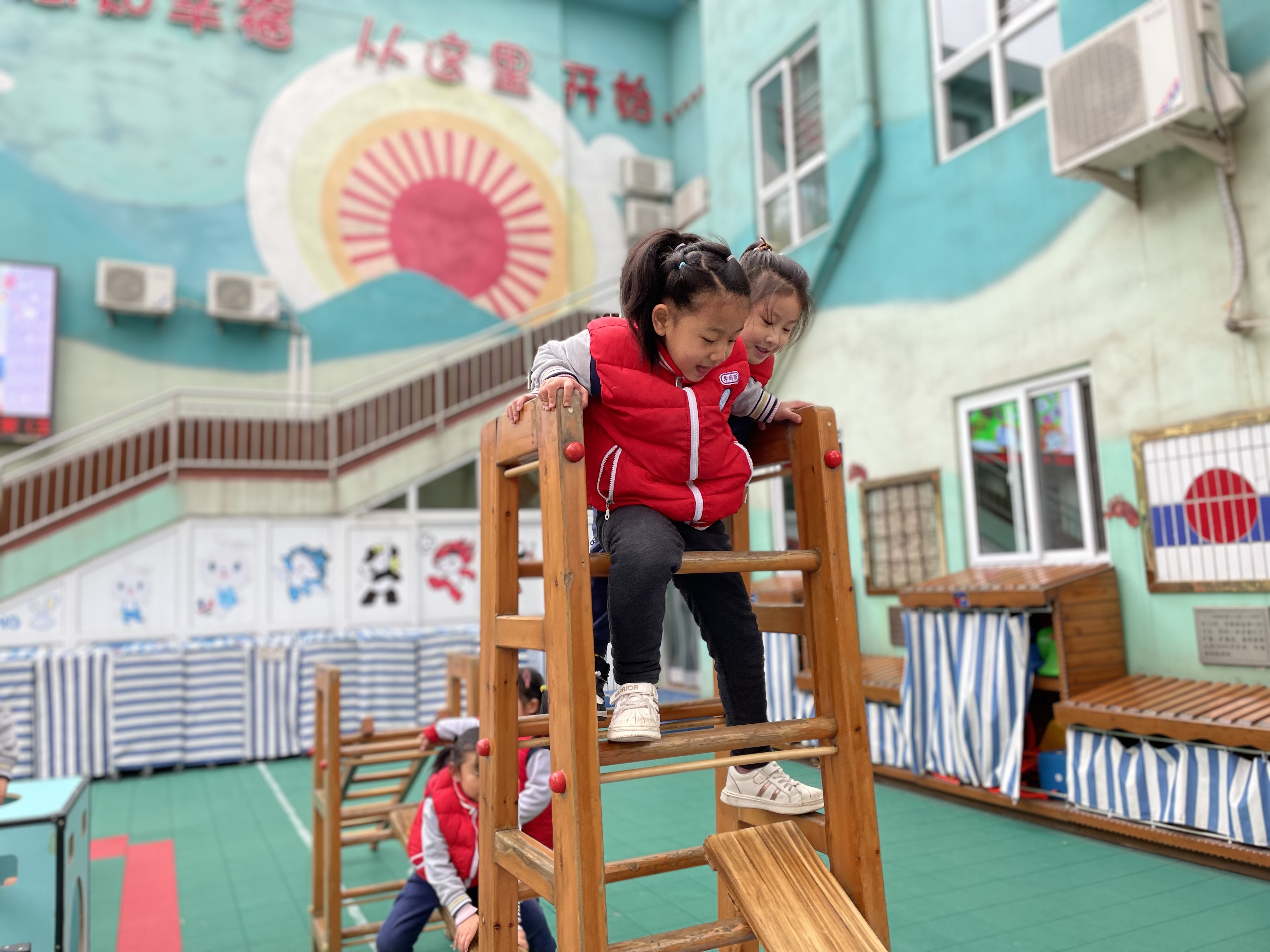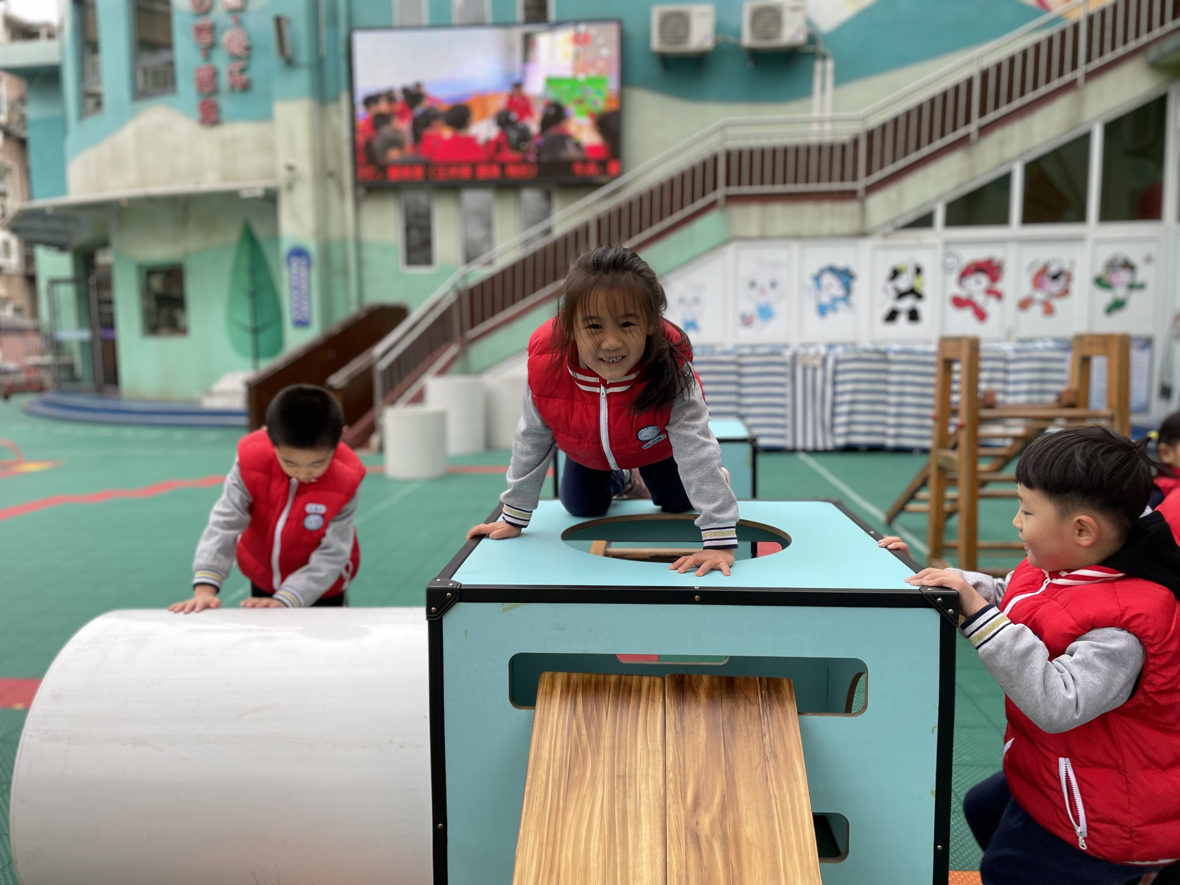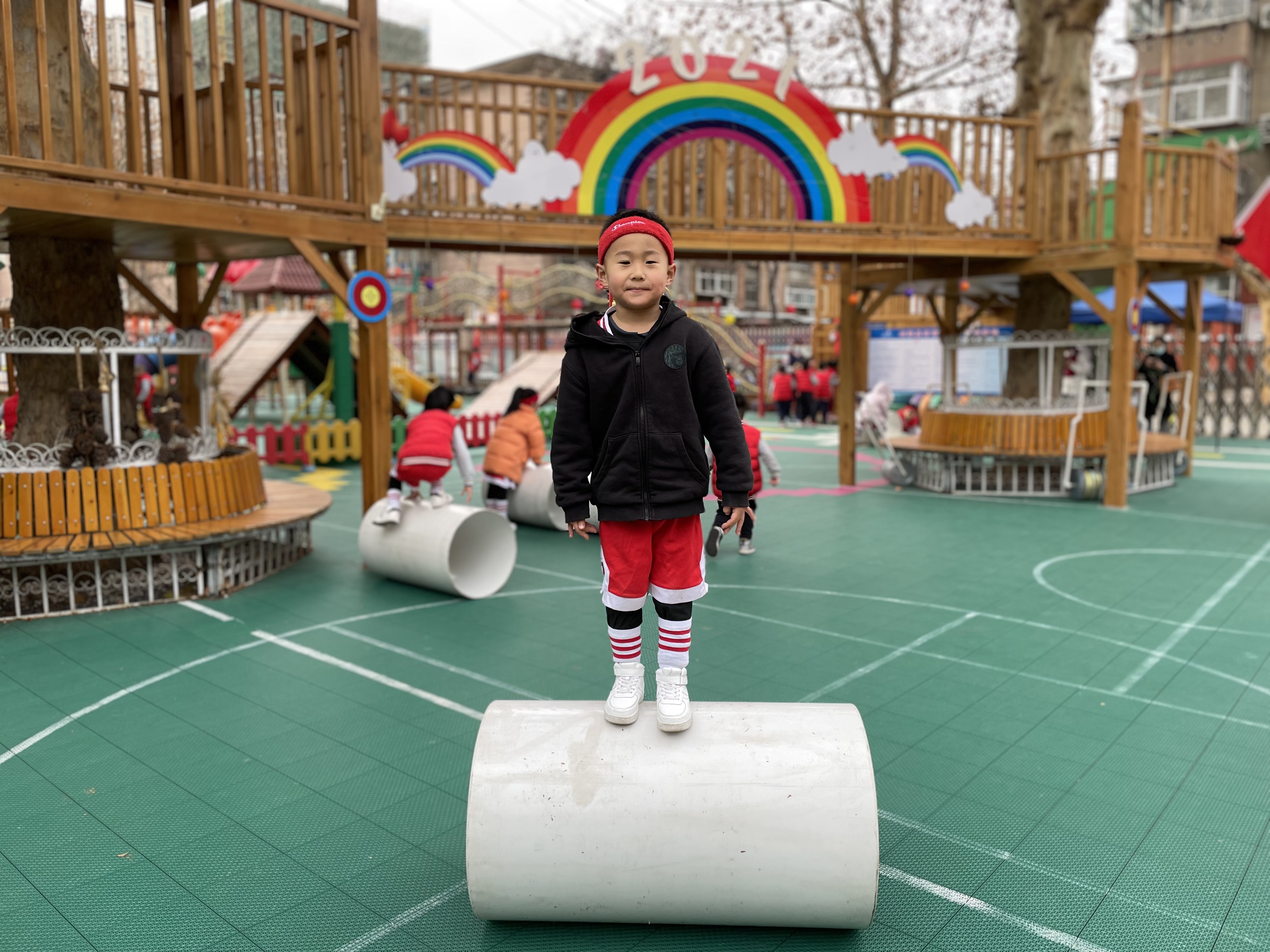 伴着清晨的朝阳,晨间活动深受孩子们的喜爱,孩子们一直对滚筒和木梯很感兴趣,喜欢这种有挑战的游戏。 在玩滚筒的过程中,需要有克服一定困难的能力,但是孩子们并不惧怕冒险,他们有一定的自我保护意识,能在自己的能力范围之内去挑战,孩子们相互扶着,你来帮我,我来帮你,体现了社会领域的合作,而且有的幼儿社会交往能力较强。 木梯孩子们也非常感兴趣,打破了传统常规的玩法以外,孩子们还设计出了用一些其他的辅助材料,比如:滚筒、木箱、垫子等,来设计自己想要玩的游戏。 我们秉承着以自主、自由、创造、愉悦的教育理念,是幼儿喜欢、符合孩子天性,最能体现幼年生命本质的游戏课程,在游戏过程中把自主权还给幼儿,让幼儿在自主、自由的真游戏中,获得经验、形成想法、表达见解、完善规划、不断挑战,从而挖掘自身最大的潜力。