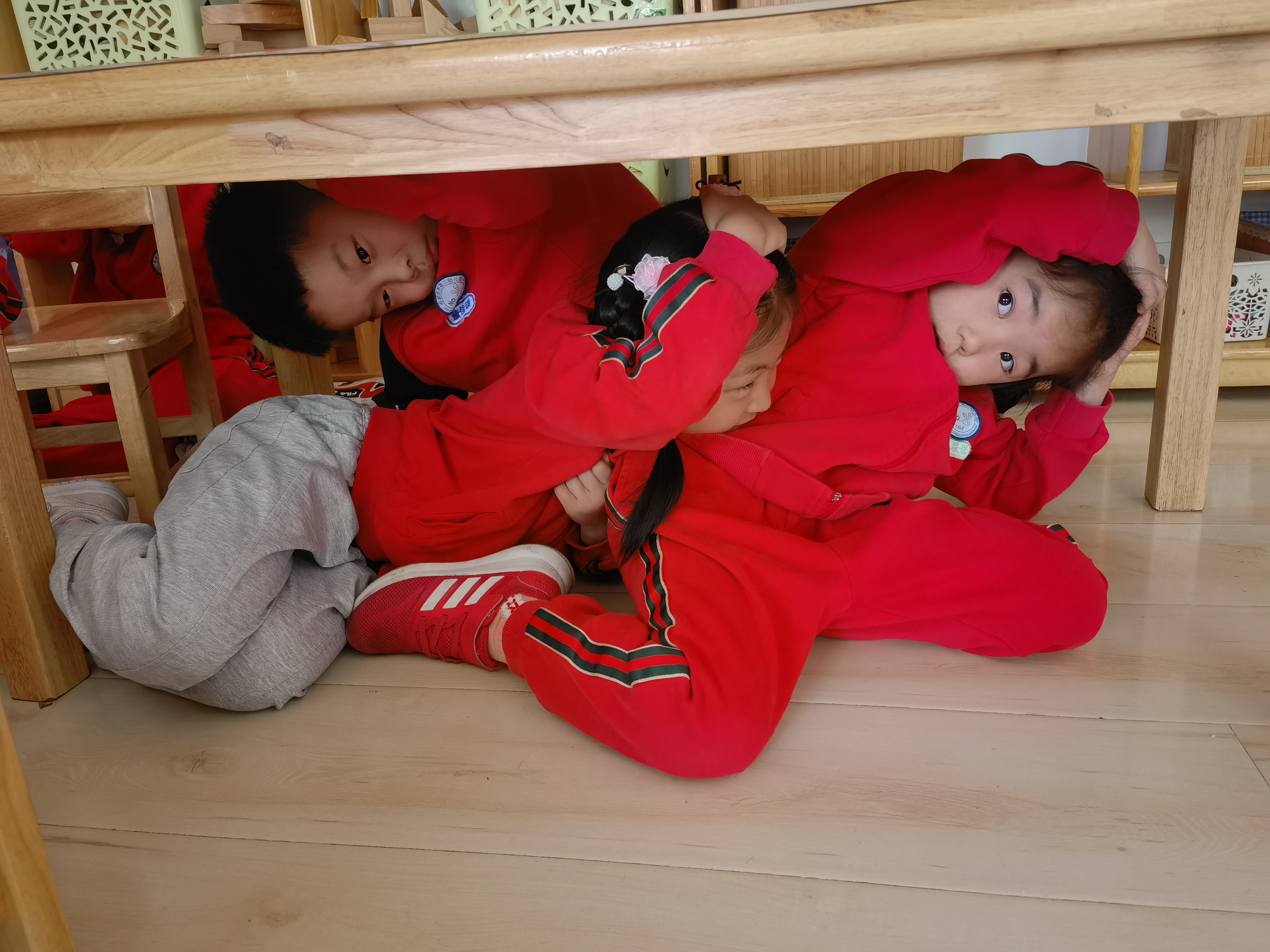 快速避险逃回教室,躲到隐蔽处,用重物堵门。